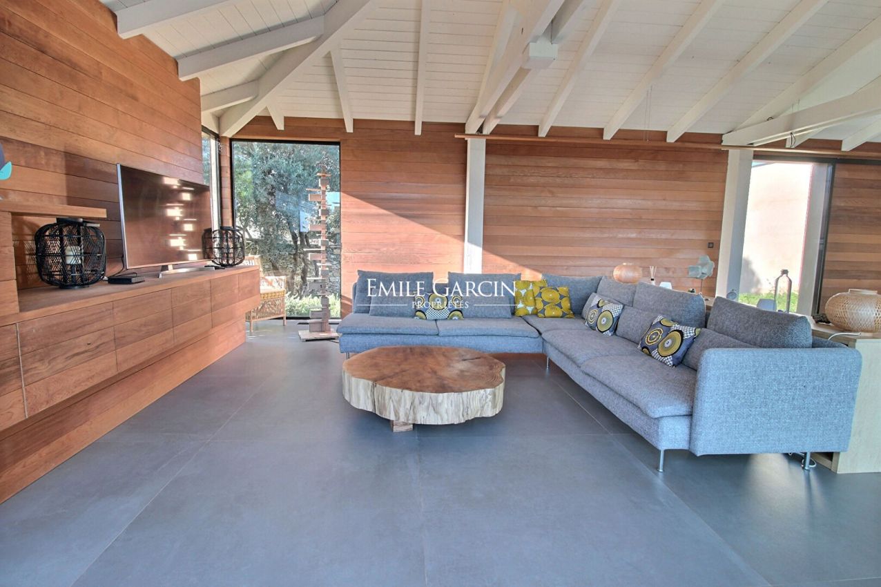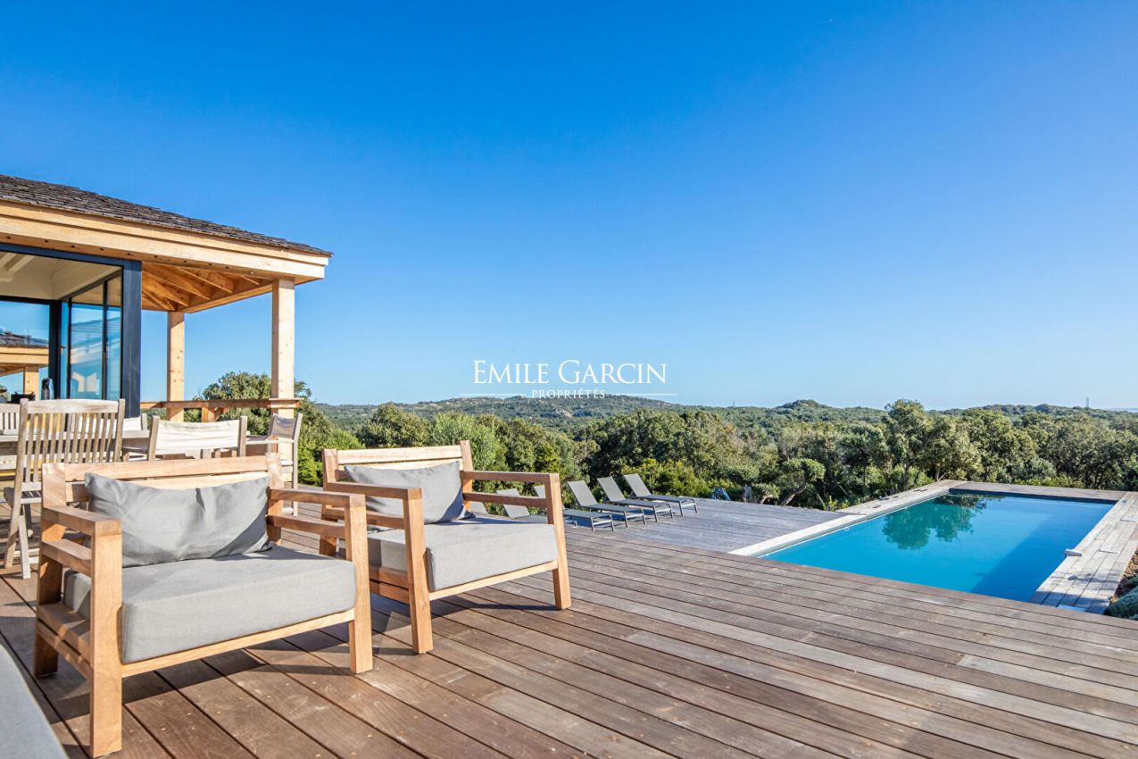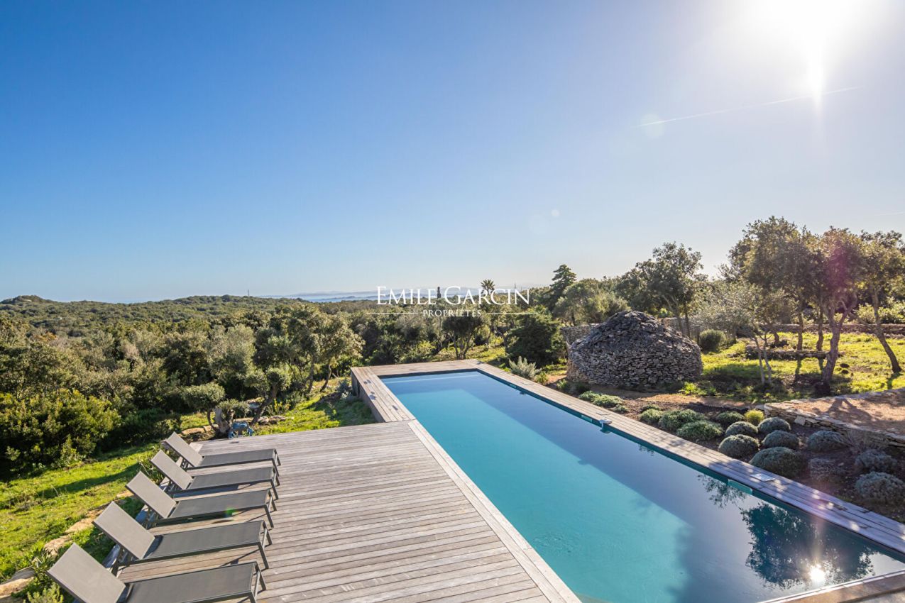Attractive property with 4 bedrooms and 4 bathrooms, located just 15 minutes from the famous city of Bonifacio and its surrounding beaches. Sumptuous view of the seafront and the Lavezzi Islands. Fully air-conditioned. Garden of over 4000 sq.m, planted with Corsican and Mediterranean vegetation and equipped with a beautiful surrounding wall, a Baracun (handsome limestone outbuilding) and a heated swimming pool (14 x 4m) secured by submerged alarm. Wooden terrace with shady pergola. Cleaning: 1 x 3 hours per week end-of-stay cleaning included in the cost of your stay. Bonifacio: 10 mins. Figari Airport: 30 mins. Piantarella beach: 5 mins. Maora Beach: 10 mins.