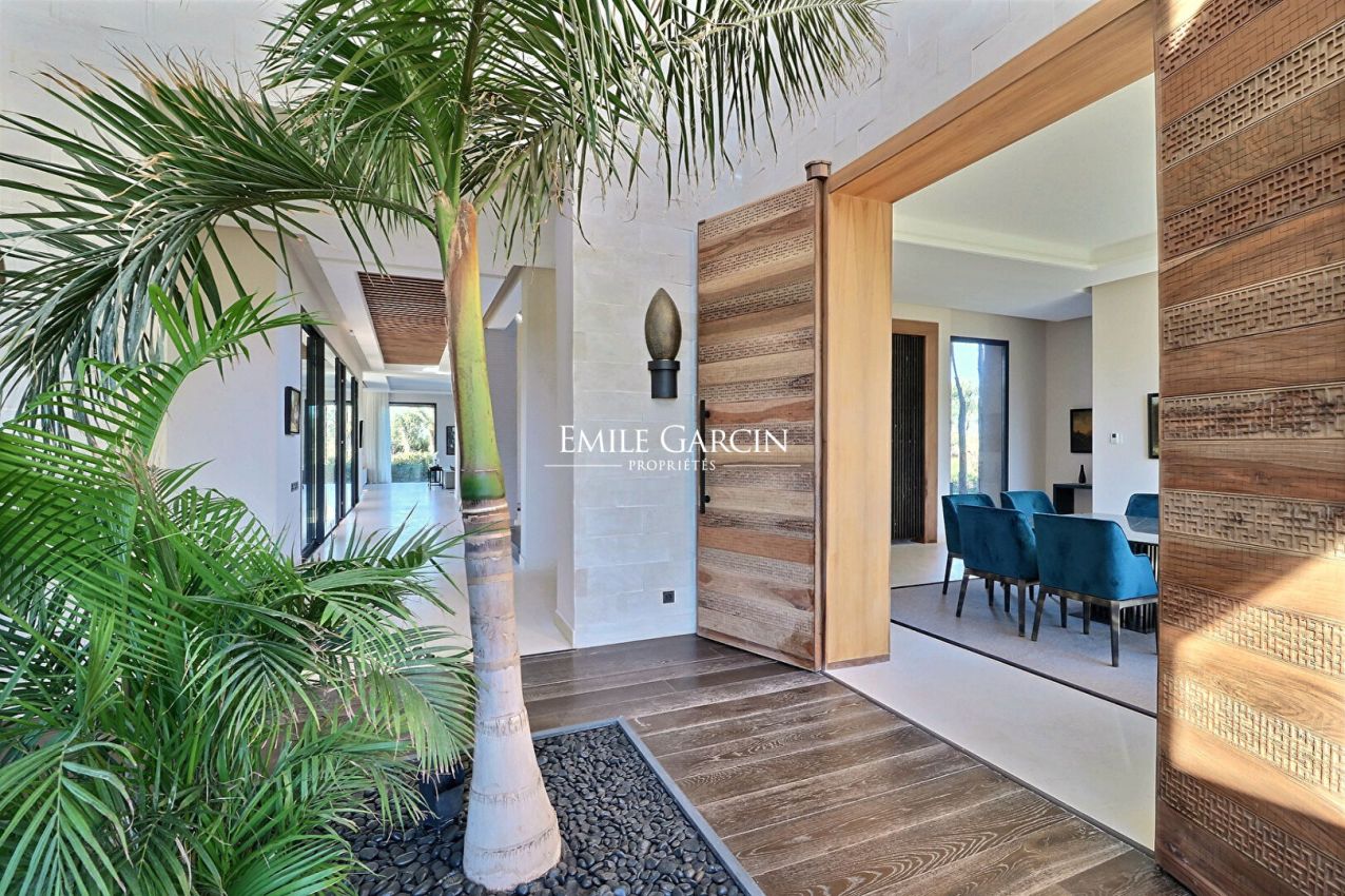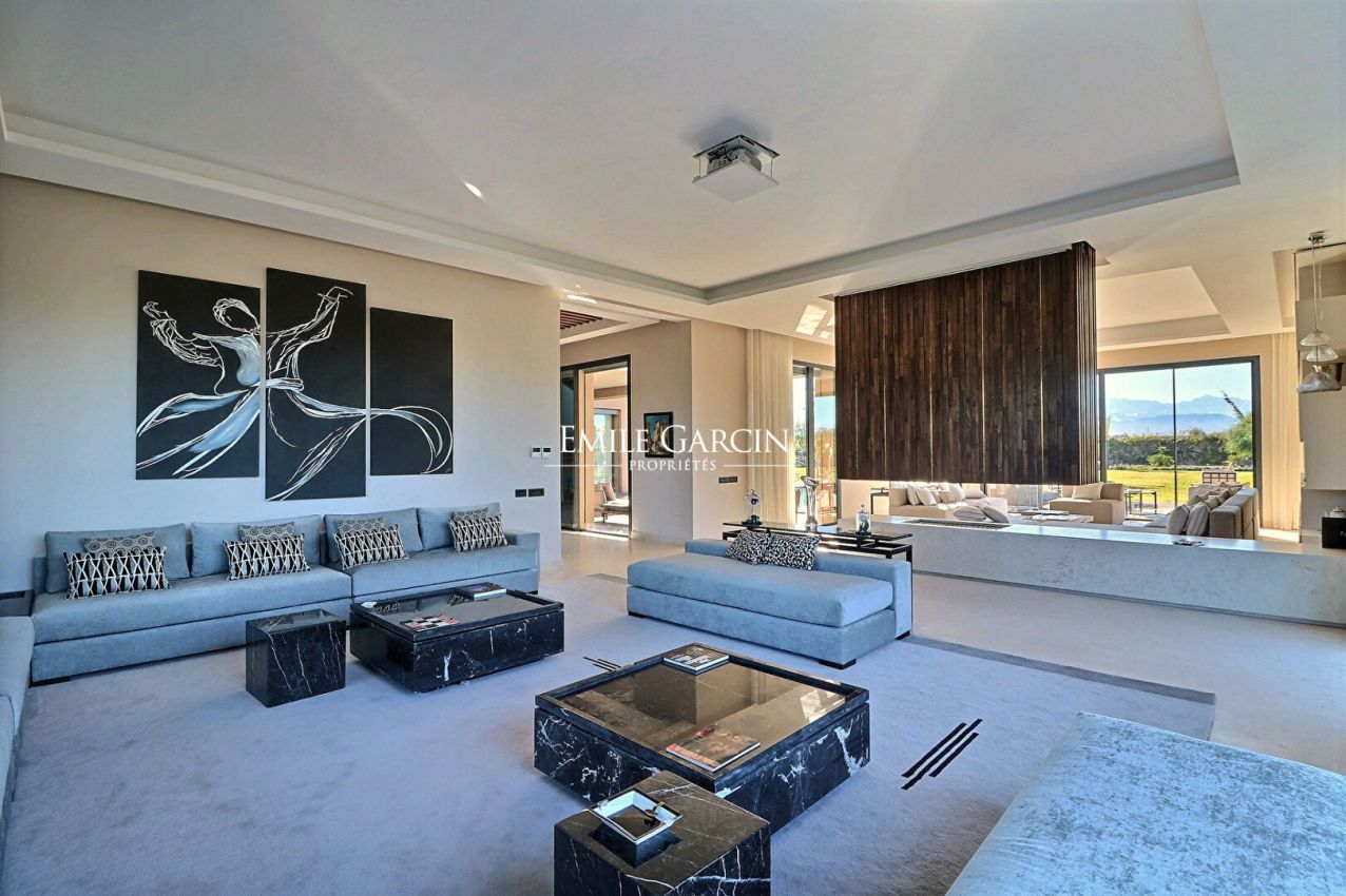 Located only 20 minutes from Marrakech, this magnificent contemporary villa presents 1400 sq.m of living area on a hectare of landscaped grounds. Reception area with central fireplace, dining room, equipped kitchen, six bedrooms spread across the main villa and the guest house (including a beautiful master suite), two swimming pools (one outside and one inside), well equipped terraces. Furnished and decorated with great taste. Excellent finish. Breathtaking view of the Atlas Mountains. Please note that a VNA attestation has not been issued for this property.