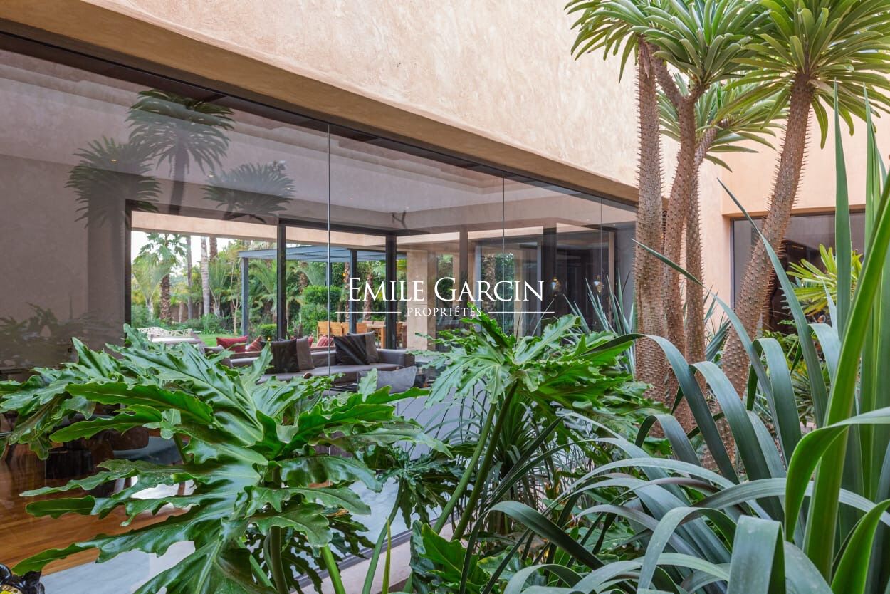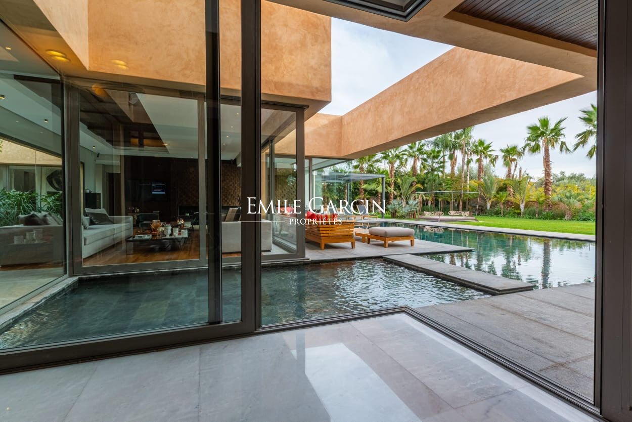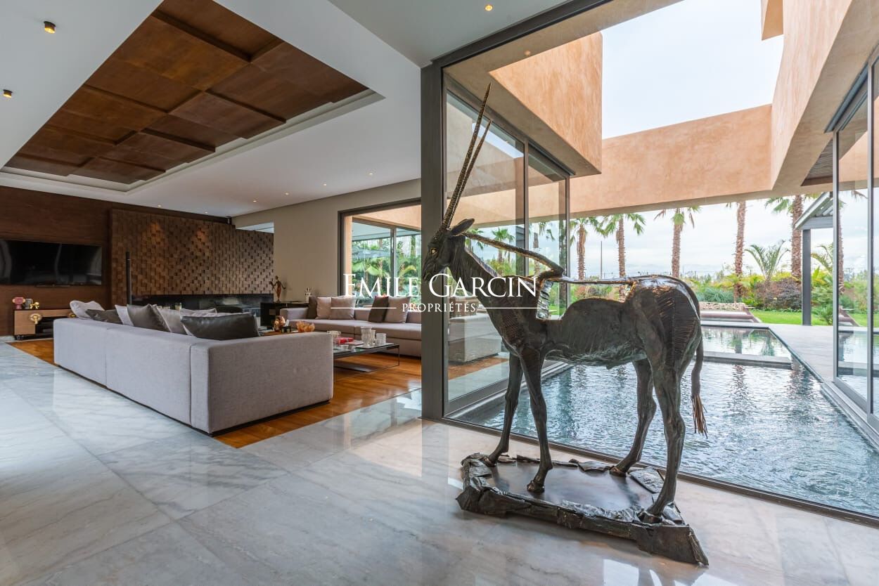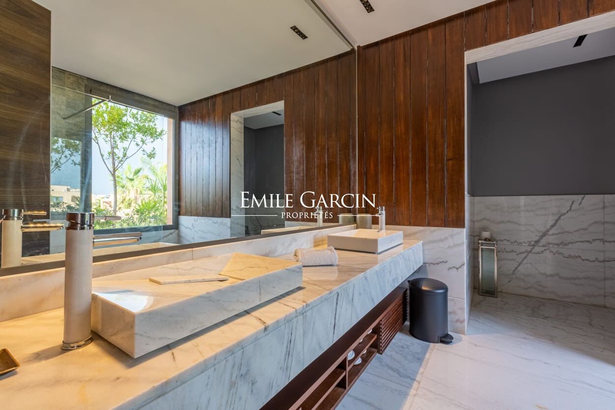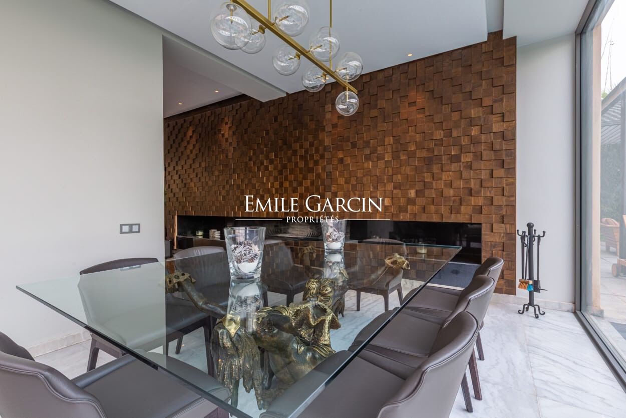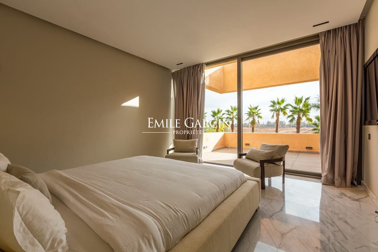 Beautiful modern villa in an idyllically located gated development, just 15 minutes from Marrakech. The property presents four spacious suite (sleeping eight people), a large and bright living room with fireplace and views of the gardens, and a beautiful furnished outdoor living area to enjoy the garden, the swimming pool (unheated) and hot tub. The ideal setting for a break in the company opf friends or family. Additional cleaning service: 100 EUR / stay. Minimum stay of 3 or 4 nights, depending on the season. Available from 800 EUR / night (including Moroccan breakfast).