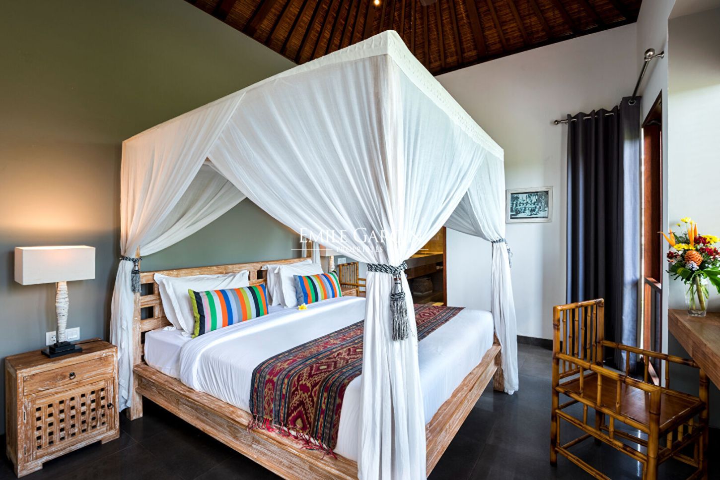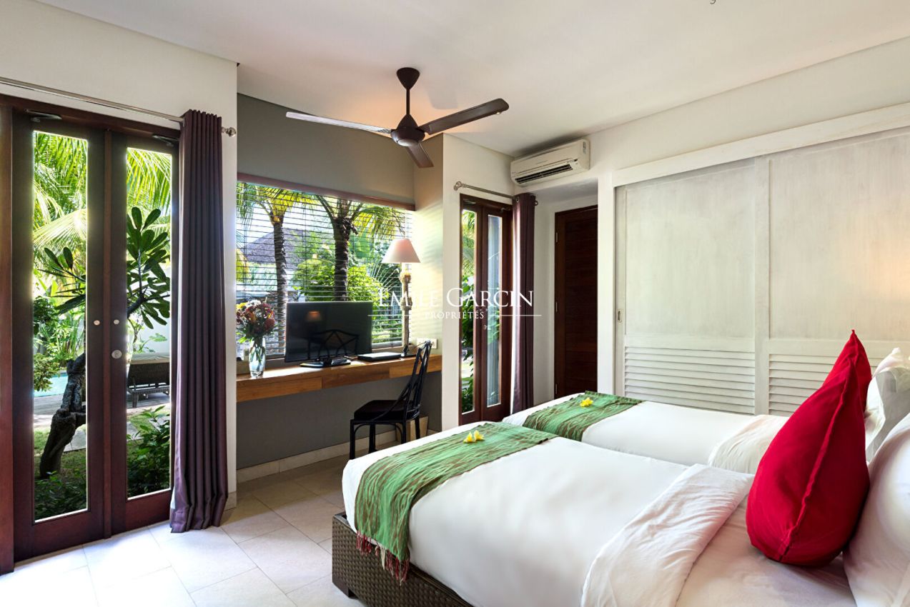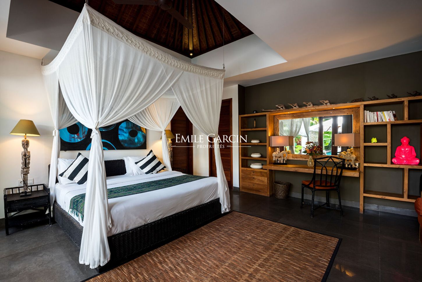 Nestled in the heart of a lush estate, this villa offers a tranquil tropical haven. Inside you will find refined decoration and attentive staff always ready to help you. The serene ambiance, with its welcoming garden and natural light, creates the ideal setting for a relaxing stay in Bali. With its 6 bedrooms, 6 bathrooms and a 16 meter swimming pool, the property offers ample space to relax and enjoy. The living room opens harmoniously onto the garden with its comfortable sofas and classic Javanese armchairs. At the rear of the living room, a charming walled garden with a lotus pond adds a touch of charm to the whole. **Available from 4 bedrooms.