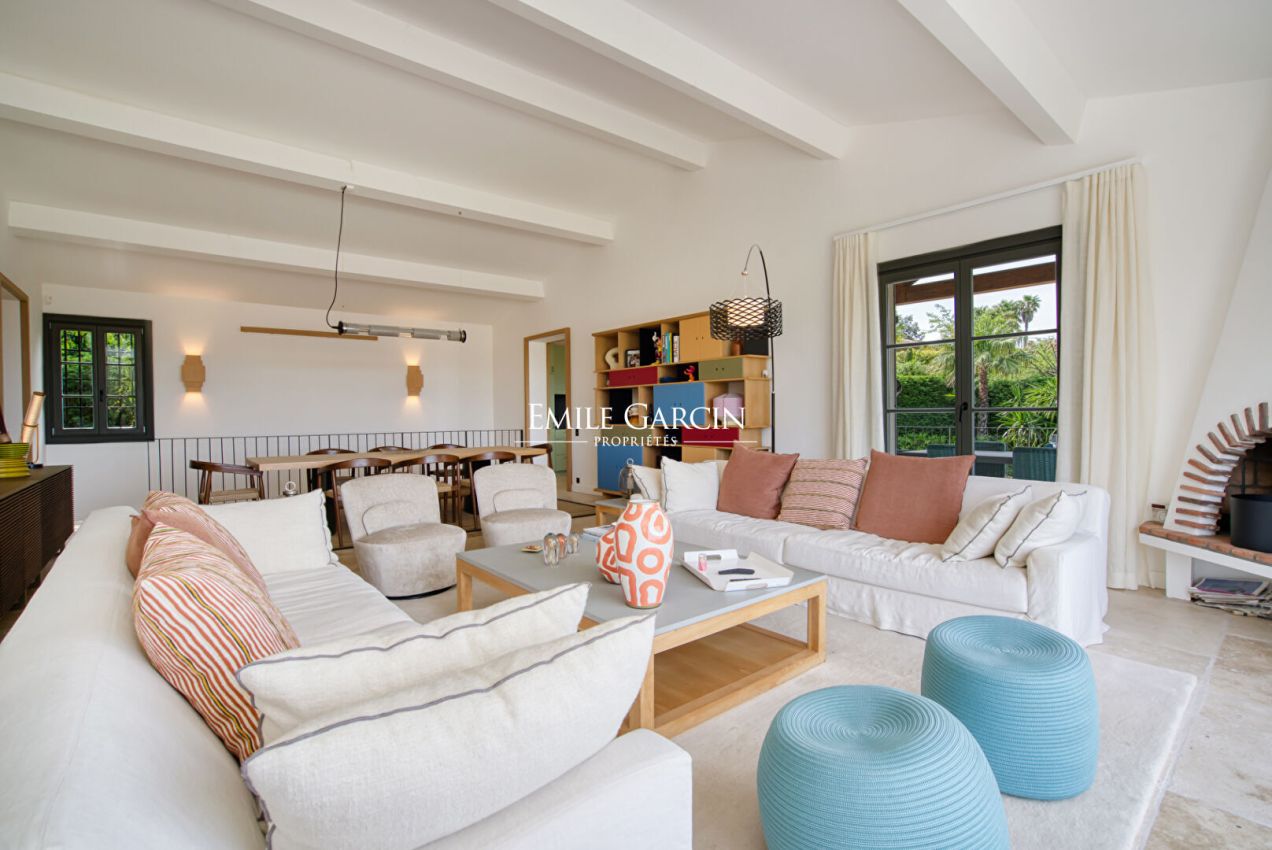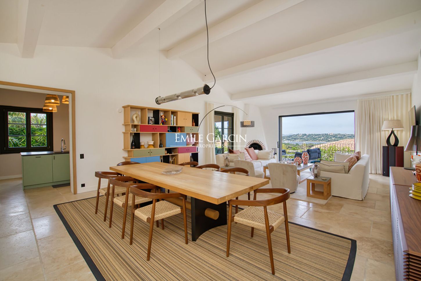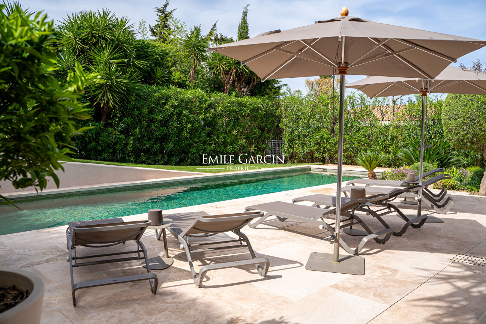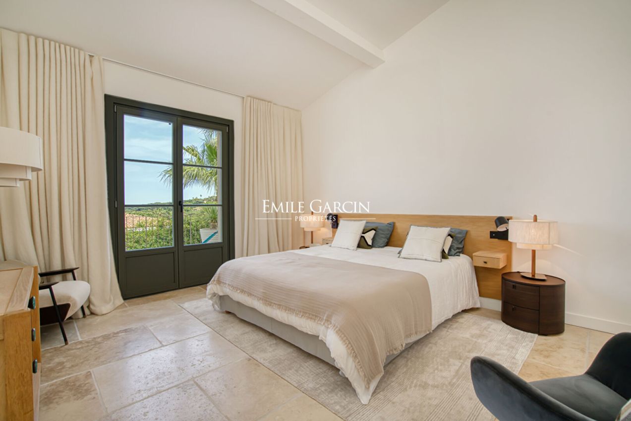 Between the legendary village of Saint-Tropez and the sunny beaches of Pampelonne, this elegant villa of approximately 220 sqm nestles in the heart of a 1,200 sqm landscaped garden. It offers five en suite bedrooms, a 15 x 4 meter heated swimming pool, and a sea view over the Baie des Caroubiers.