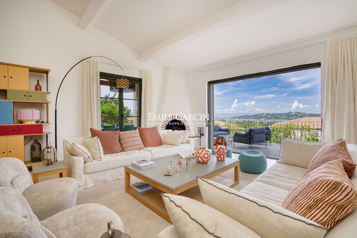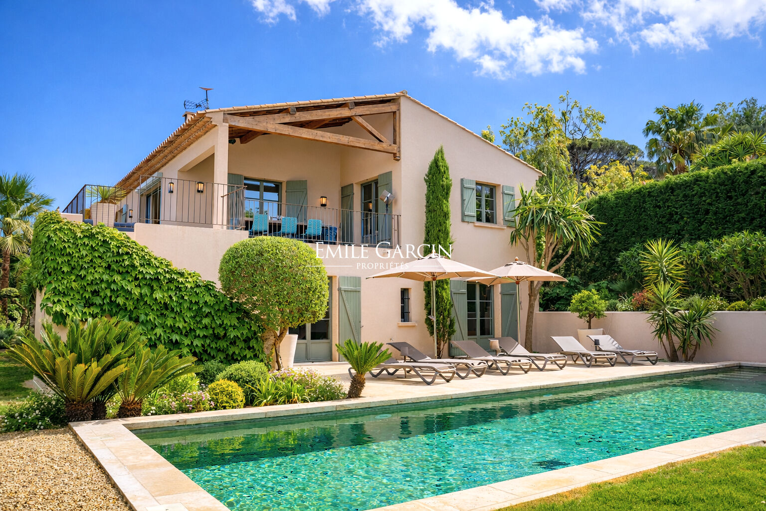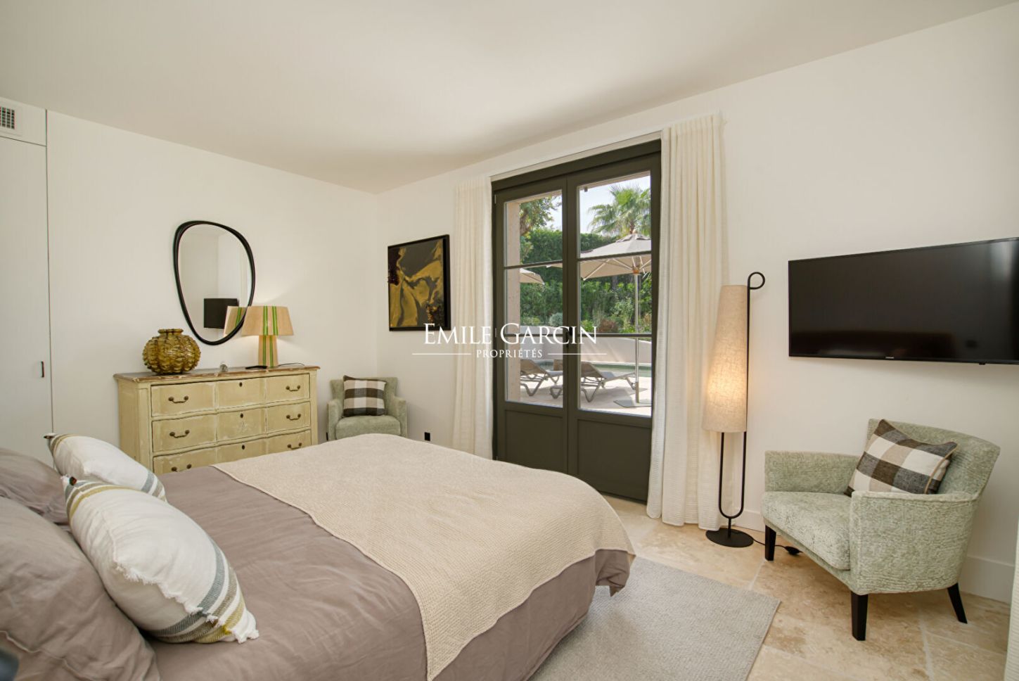 Between the legendary village of Saint-Tropez and the sunny beaches of Pampelonne, this elegant villa of approximately 220 sqm nestles in the heart of a 1,200 sqm landscaped garden. It offers five en suite bedrooms, a 15 x 4 meter heated swimming pool, and a sea view over the Baie des Caroubiers.