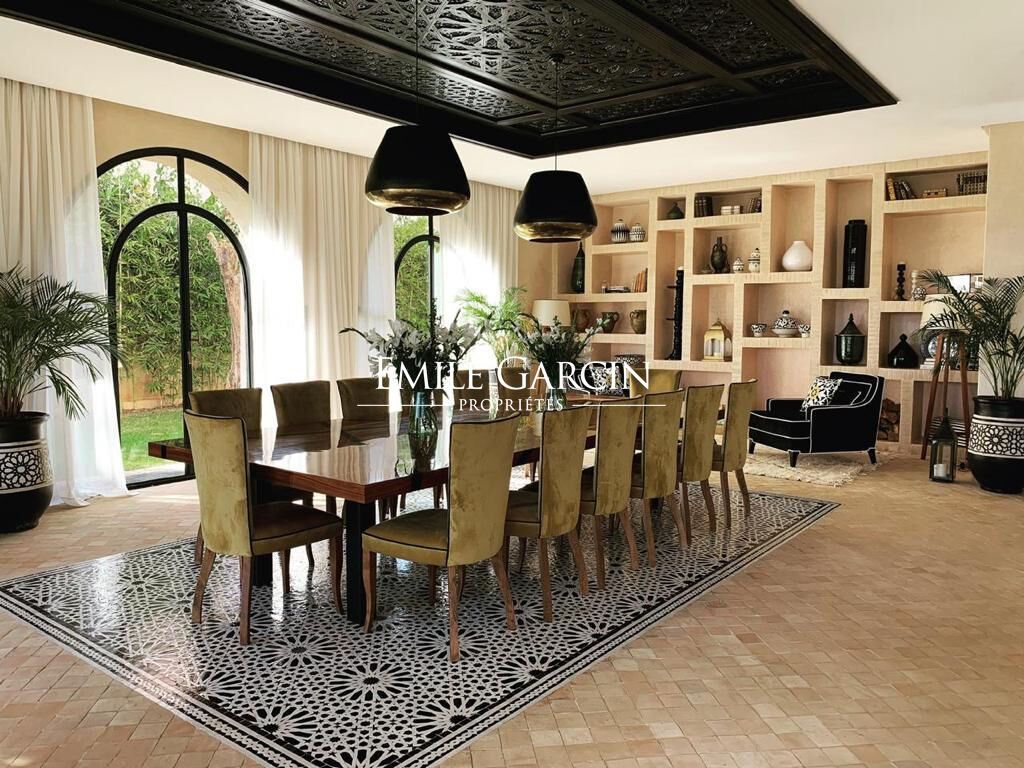 This 800 m² property and its 1300 m² garden are idyllically located on a golf development. Large double living room with central fireplace, spacious suites, hammam and massage room. 8 bedrooms: 7 on the ground floor and first floor, and one on a light-filled mezzanine. Heated swimming pool. Refined decor. Sleeps 16 people. From 2,125 EUR / night.