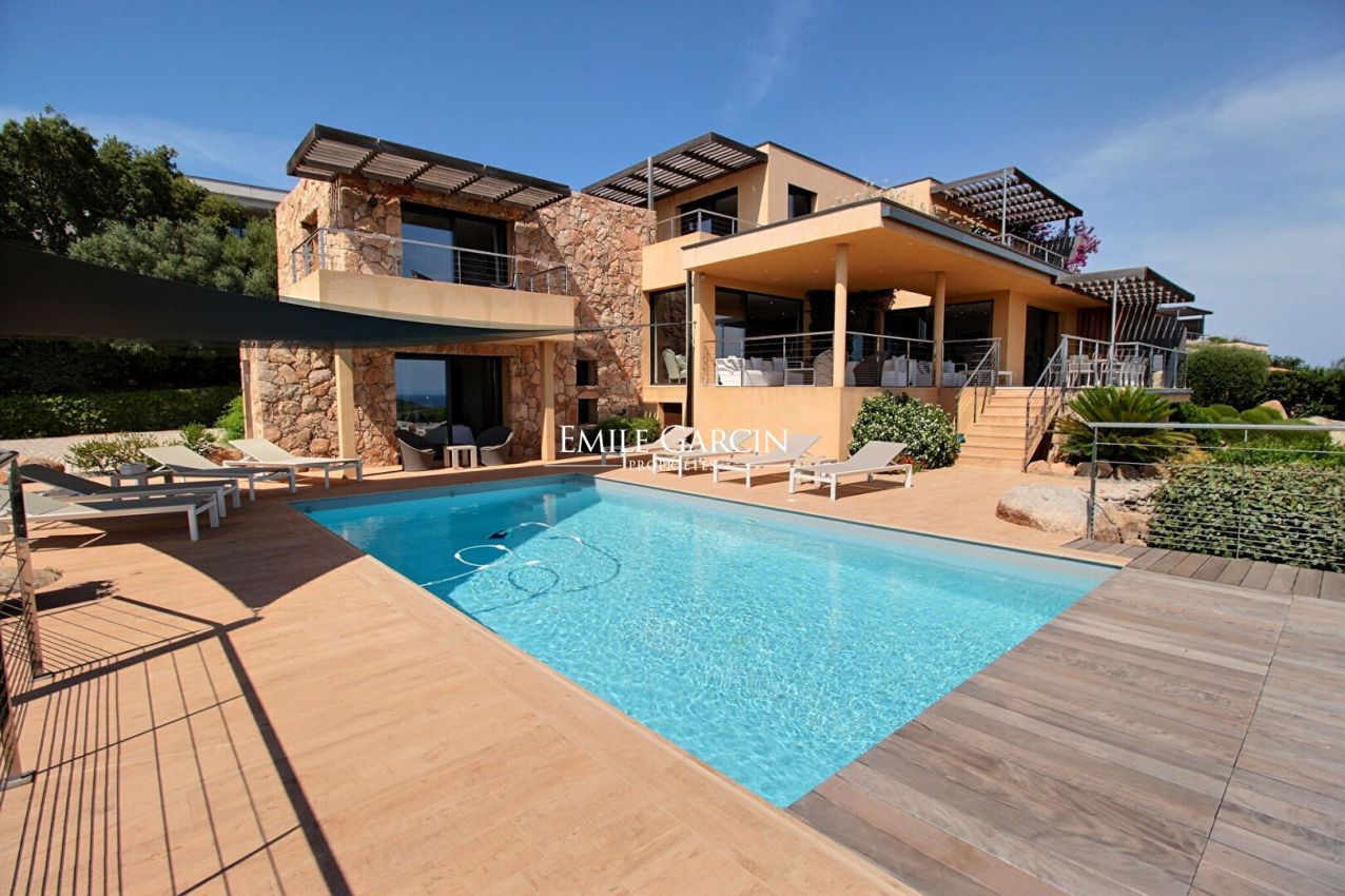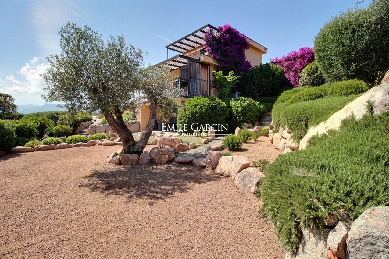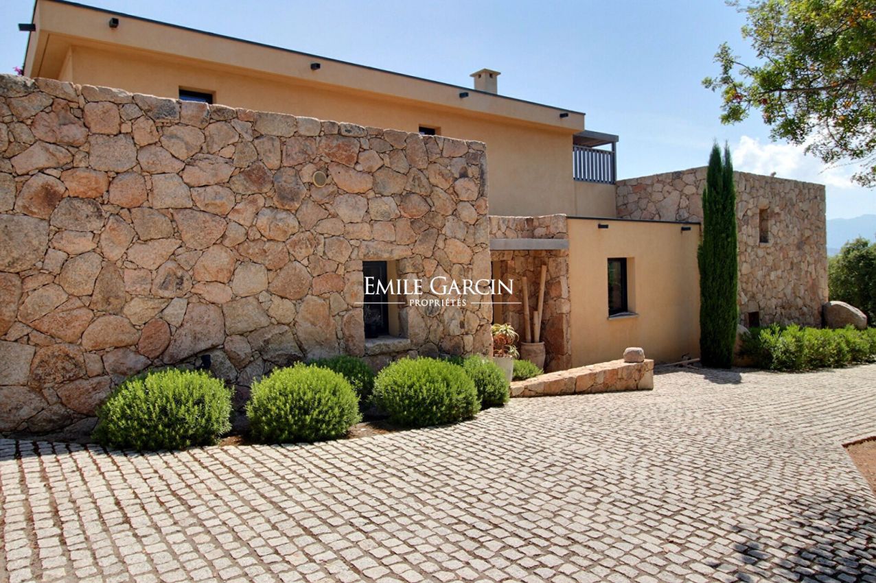 Modern property separated into two villas, located on expansive private grounds on the hillside above the Bay of St Cyprien, just a few minutes from the famous Cabanon Bleu. Superb panoramic sea views. Fully air-conditioned. 5 bedrooms and 5 bathrooms accommodating up to 10/12 people. Heated swimming pool (8 x 4.5m) secured by a shutter and equipped with an outdoor shower. Pretty garden planted with Mediterranean trees (olive trees, arbutus trees, mastic trees, etc.). St Cyprien Beach/Le Cabanon Bleu: 10 mins. Figari Airport: 45 mins. Pinarello: 15 mins. Porto-Vecchio: 25 mins. The villa opens with a beautiful living area with large windows offering a superb panoramic view of the bay. It comprises a lounge area with fireplace and TV, a dining room area, a fully equipped kitchen and a utility room (two refrigerators, freezer, washing machine, dryer etc.) On the first floor, you will find: Bedroom 1: 160 cm double bed, bathroom with shower and toilet, TV, private furnished terrace; Bedroom 2: 160 cm double bed, bathroom with shower and toilet, TV, private furnished terrace; Bedroom 3: 160 cm double bed, bathroom with shower and toilet, TV, private furnished terrace. At the basement (swimming pool) level, there is: Bedroom 4: family room equipped with a 160 cm double bed, a bunk bed, a bathroom with shower and toilet, TV and pool access. Accessed via the garden, a small studio comprises a lounge area with sofa and TV, an equipped kitchen, one bedroom and a bathroom with shower and toilet. This property has all the comfort and amenities required for a memorable holiday among friends or family.