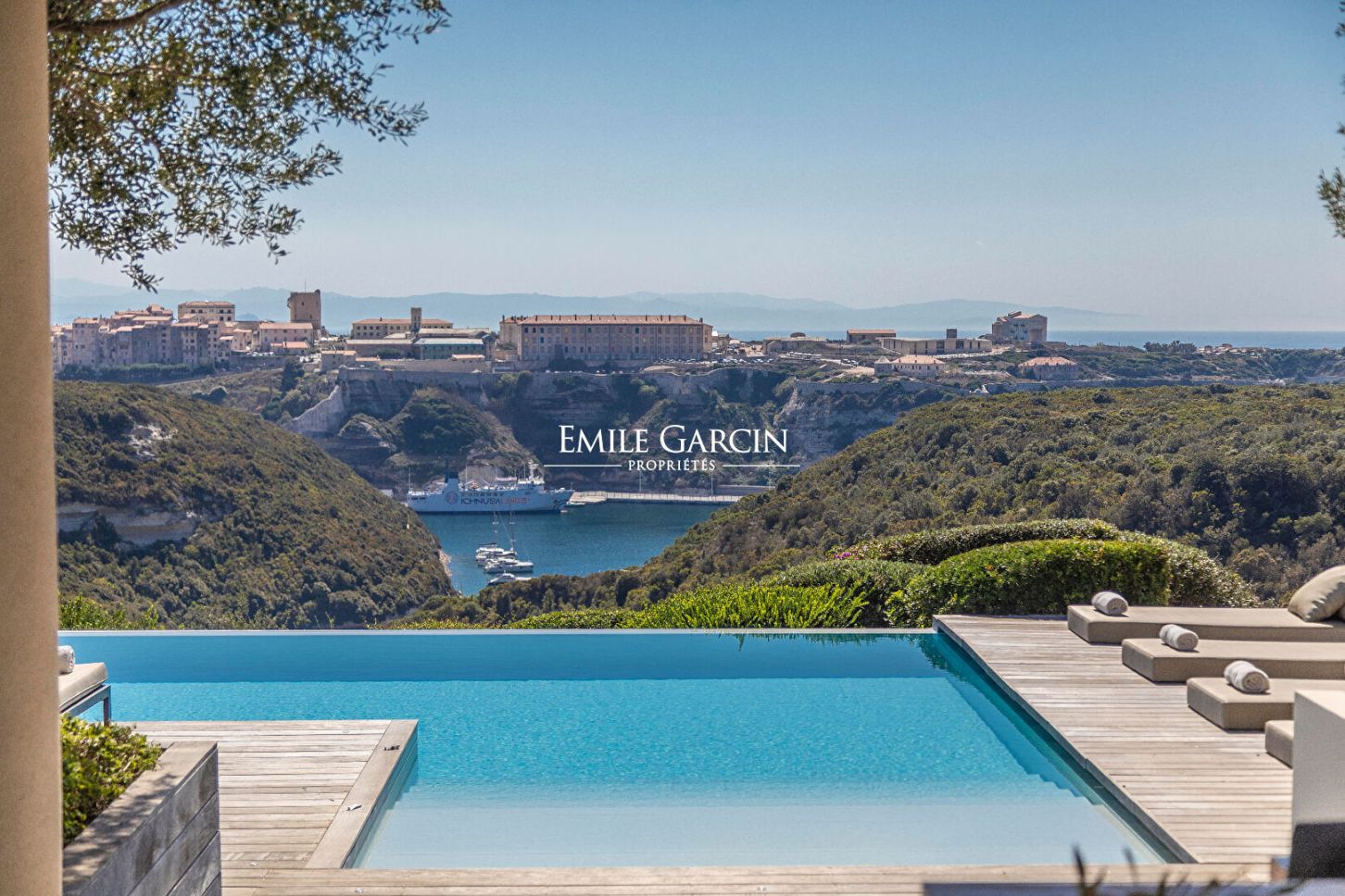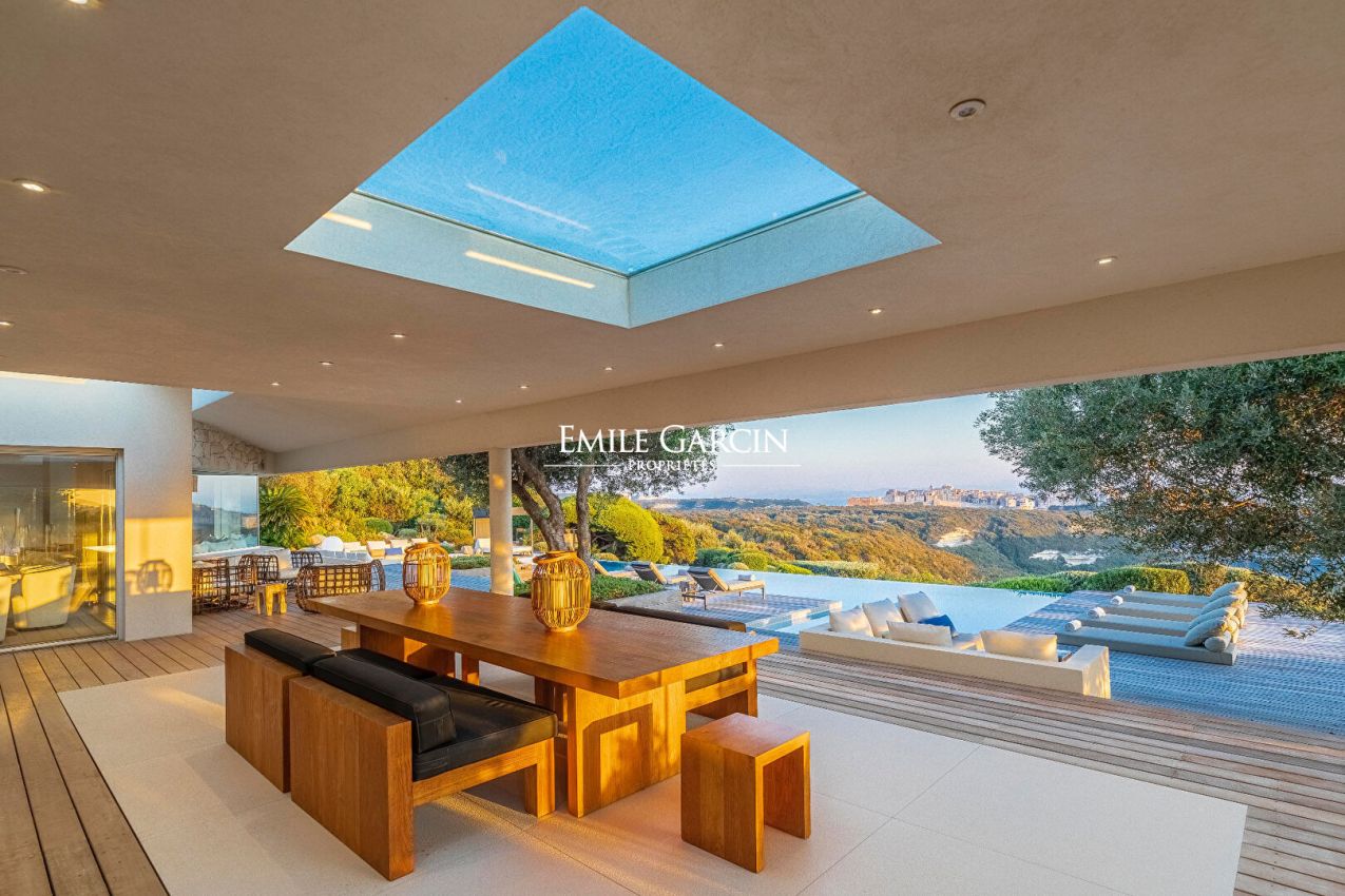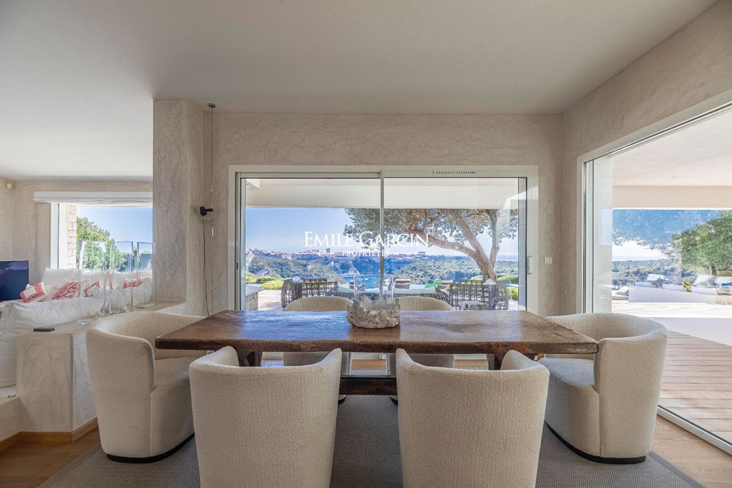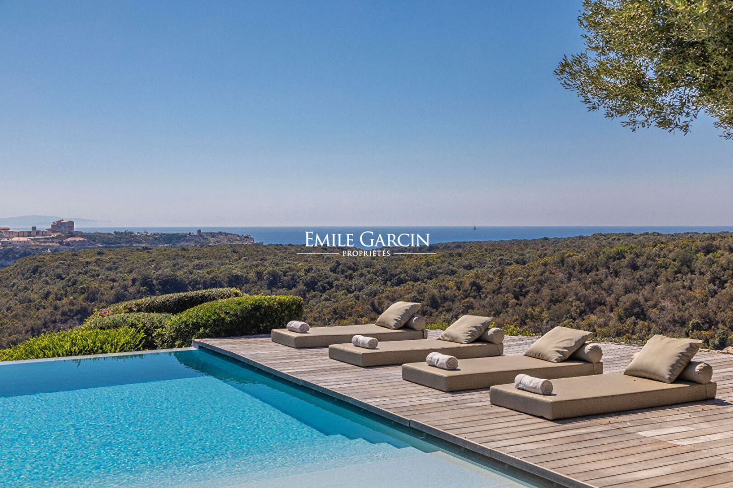 This magnificent 350 sq.m villa boasts an exceptional view of the port and citadel of Bonifacio. Sitting on 3000 sq.m of land planted with Mediterranean vegetation just a few minutes from the town centre and the beaches, it is a veritable invitation to rest and relaxation. The 18 x 4m heated infinity pool is equipped with counter-current swimming system. It is surrounded by a large wooden terrace of 250 sq.m with three shady lounge areas. There is an al fresco dining area with a plancha and a large wooden table for lunch in the shade. It can accommodate 8 people in great comfort across 4 air conditioned bedrooms and 4 bathrooms. The ideal setting to discover the south of Corsica and its superb beaches. Beach: 10/15 mins. Figari Airport: 20 mins. Bonifacio: 5 mins (car), 15 mins (walking). Sperone golf course: 10 mins. This single-level villa presents a double living room backing onto a beautiful wooden terrace with breathtaking views of Bonifacio. It includes a TV area and a lounge area separated by a fireplace, as well as a dining room. There is also a fully equipped open kitchen. The first (master) bedroom is equipped with a 160 cm double bed, a full bathroom (shower, bathtub), a separate WC, a large dressing room, a TV and a small private terrace. The other three bedrooms are located on the other side of the villa. These bedrooms are equipped with 160 cm beds, TV sets and a private bathroom with toilet. All the bedrooms have a terrace and overlook the garden. They are all air conditioned.