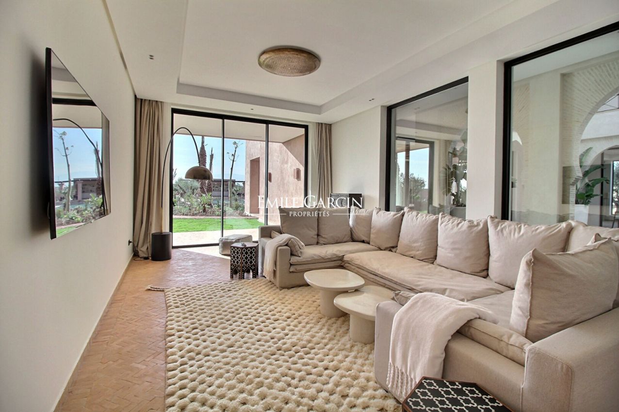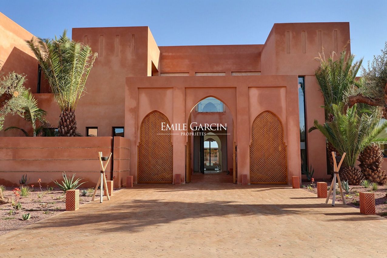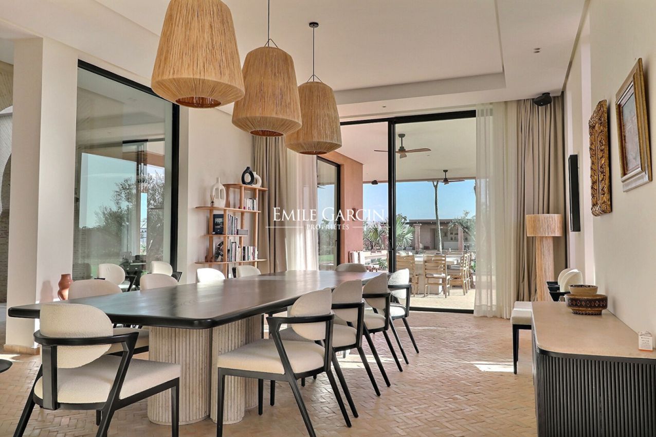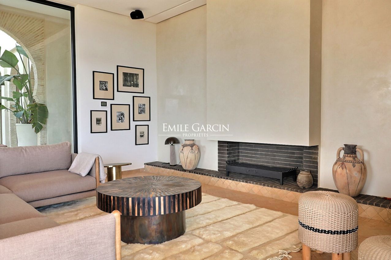 Sublime villa located on a hectare of land facing the Atlas Mountains, just a few minutes from the city of Marrakech and the main local golf courses. This property presents a modern style and a warm, elegant decor designed by its owner, a famous interior architect. Arranged around a central covered patio, you will find a large dining room with fireplace, a TV lounge, and a double living room with fireplace backing onto the swimming pool. The ground floor also includes a beautiful outdoor terrace with lounge and dining area and a master suite of 100 sq.m with large dressing room, bathroom and private study. Upstairs, there are six suites equipped with terrace, dressing room and bathroom. Large spa with hammam and double massage room. Pool house with dining area, lounge and bar. Padel court and pétanque area. The house has been finished to the standard of a high-end hotel. Underfloor heating and reversible central air conditioning. 25-metre heated swimming pool. Large basement. Accommodation for several employees.