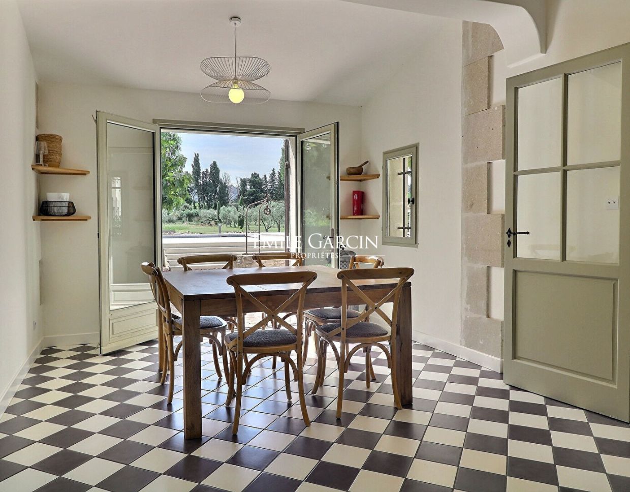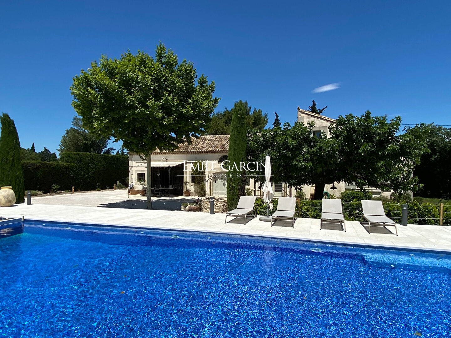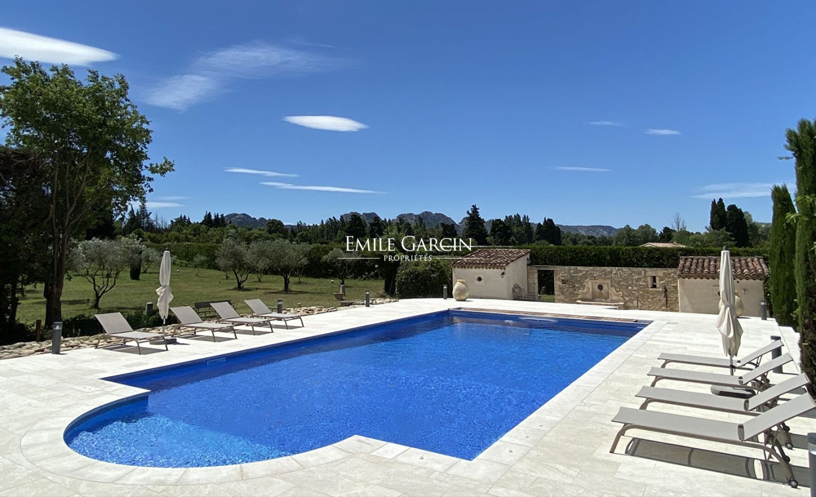A few minutes from the village of Eygalières, set on 8000 m², this restored Provencal farmhouse of 320m² offers a sublime view of the Alpilles. 7 bedrooms, 6 bathrooms, air conditioning. Heated swimming pool 15m x 7m.