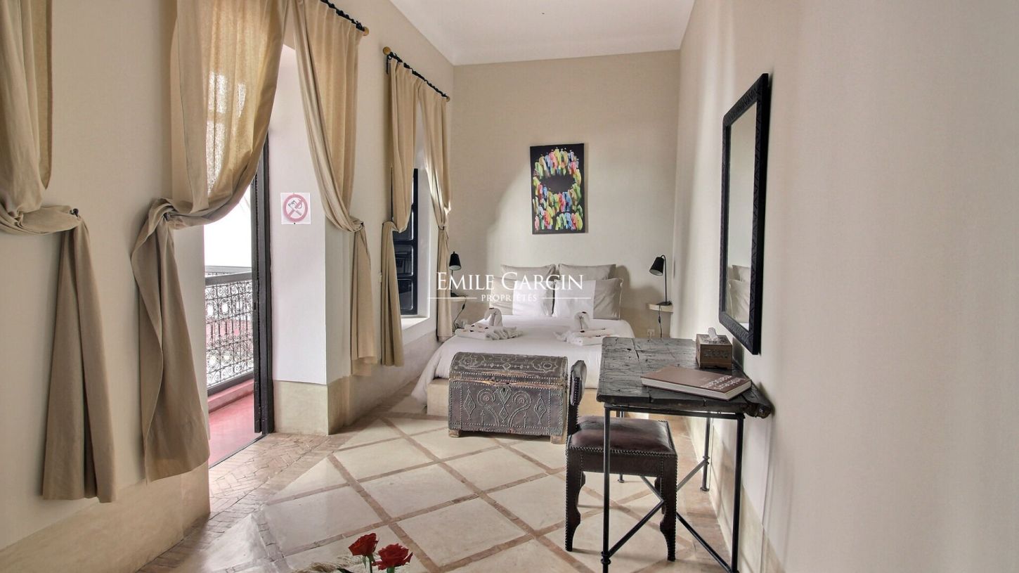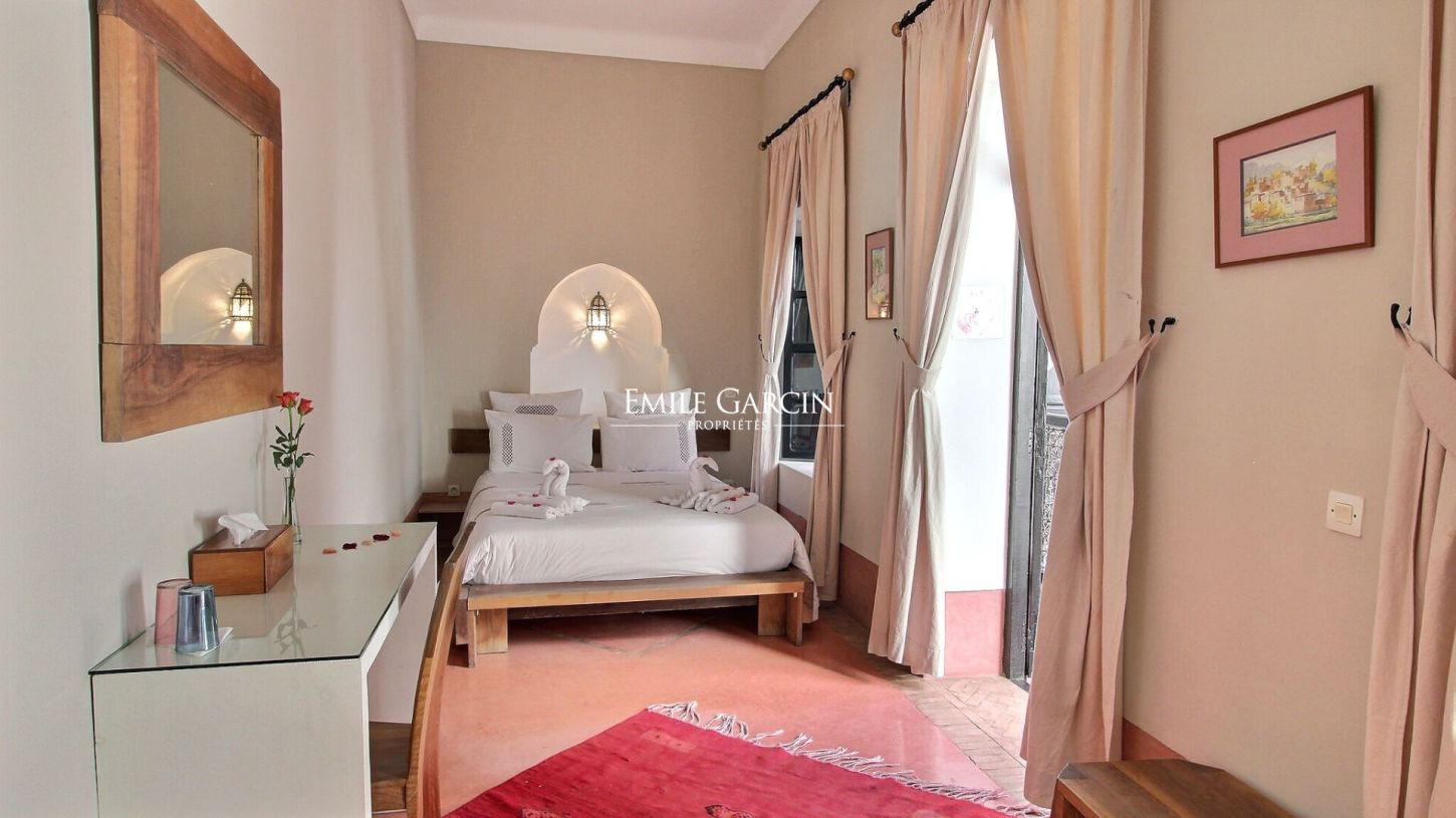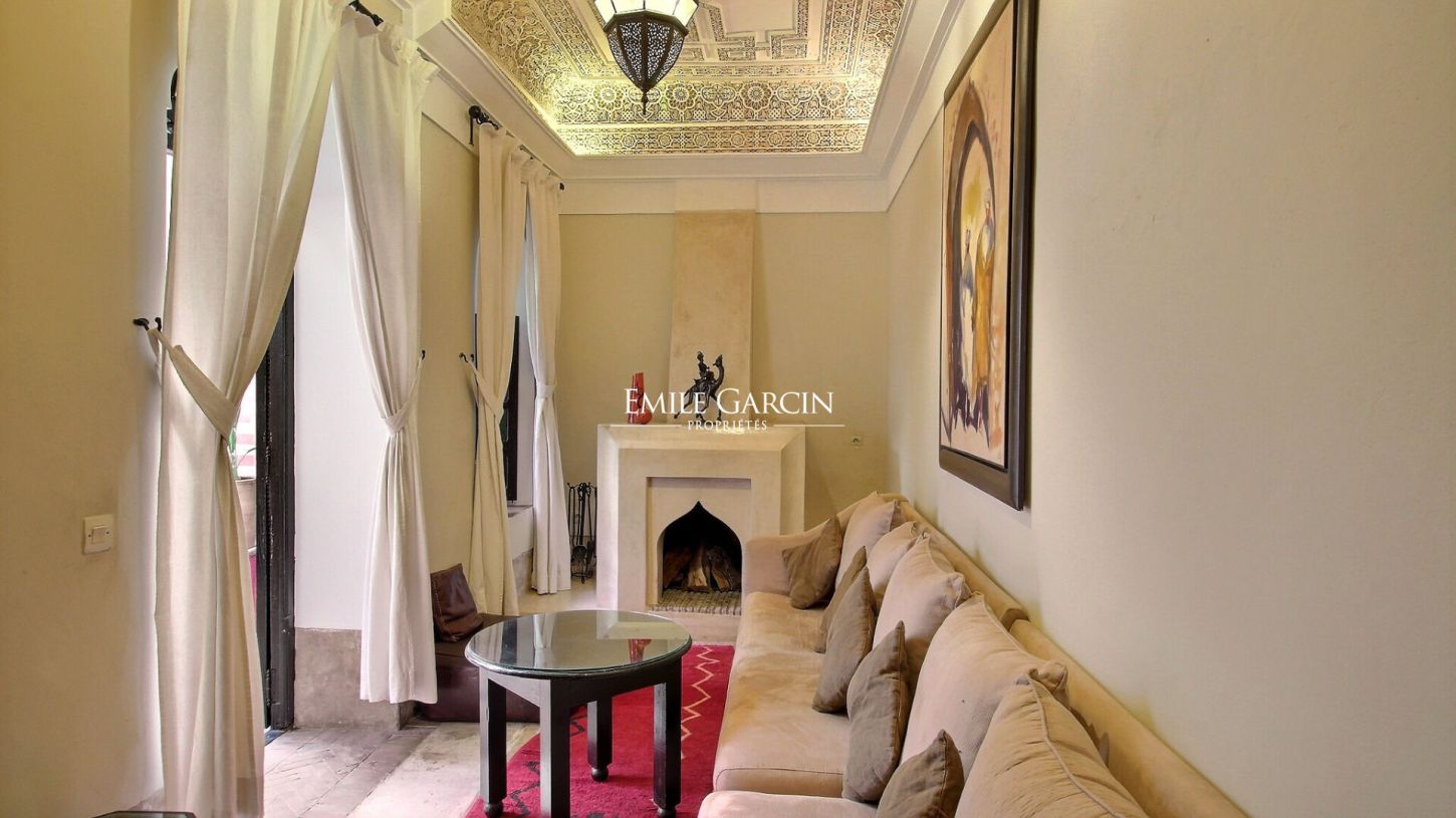 Charming riad offering 220 m² of living area. Four bedrooms made up of two beautiful 20 m² suites with private shower rooms and two 15 m² bedrooms. Located on a peaceful street near the Place Jemaa El Fnaa, this Riad presents the ideal setting for a holiday among family or friends. Small swimming pool (unheated), living room with fireplace and bookshelves, dining room. Sun terrace equipped with a beautiful caidal tent. From 225 EUR / night