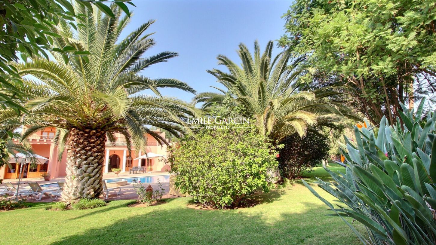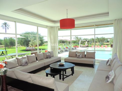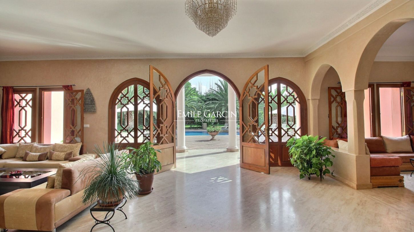Property of 480 m² to rent on a private domain just 11km from the centre of Marrakech. Large reception room, lounge area with fireplace, dining room, 6 spacious bedrooms and fully equipped kitchen. Splendid private grounds of 4600 m², planted with palm trees and olive trees. Heated swimming pool with view of the Atlas Mountains. Vast upstairs terrace. Property for 12 people. Domestic staff available during your stay. City centre:15 minutes Airport: 15 minutes Golf course: 5 minutes. Restaurants: 5 minutes. From 500 EUR / night