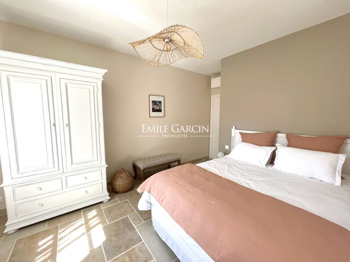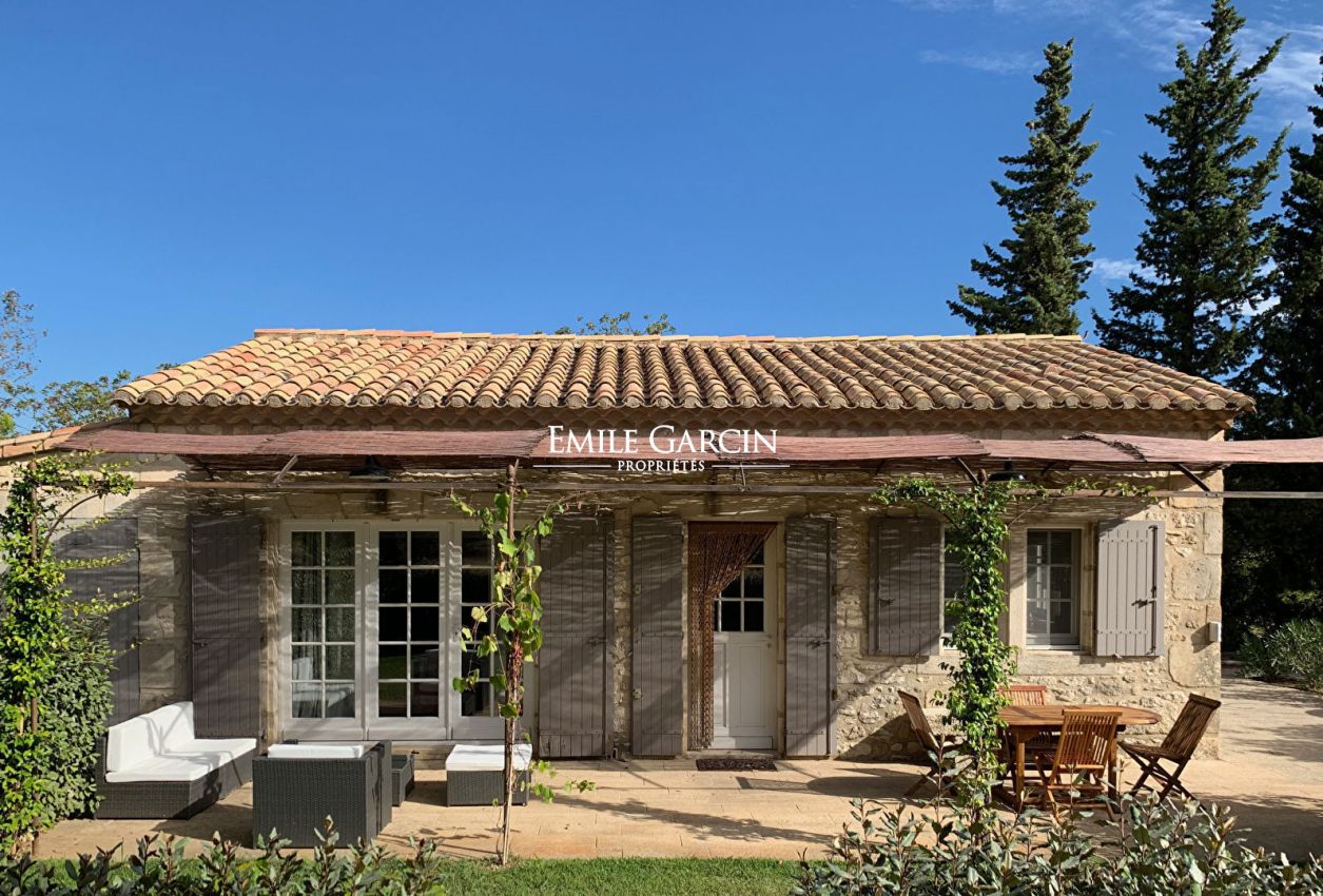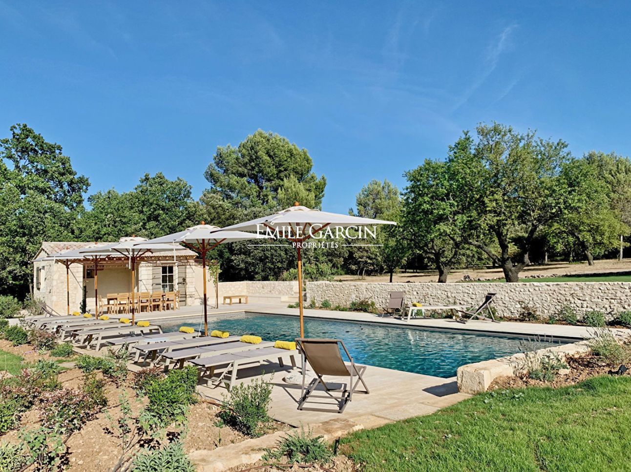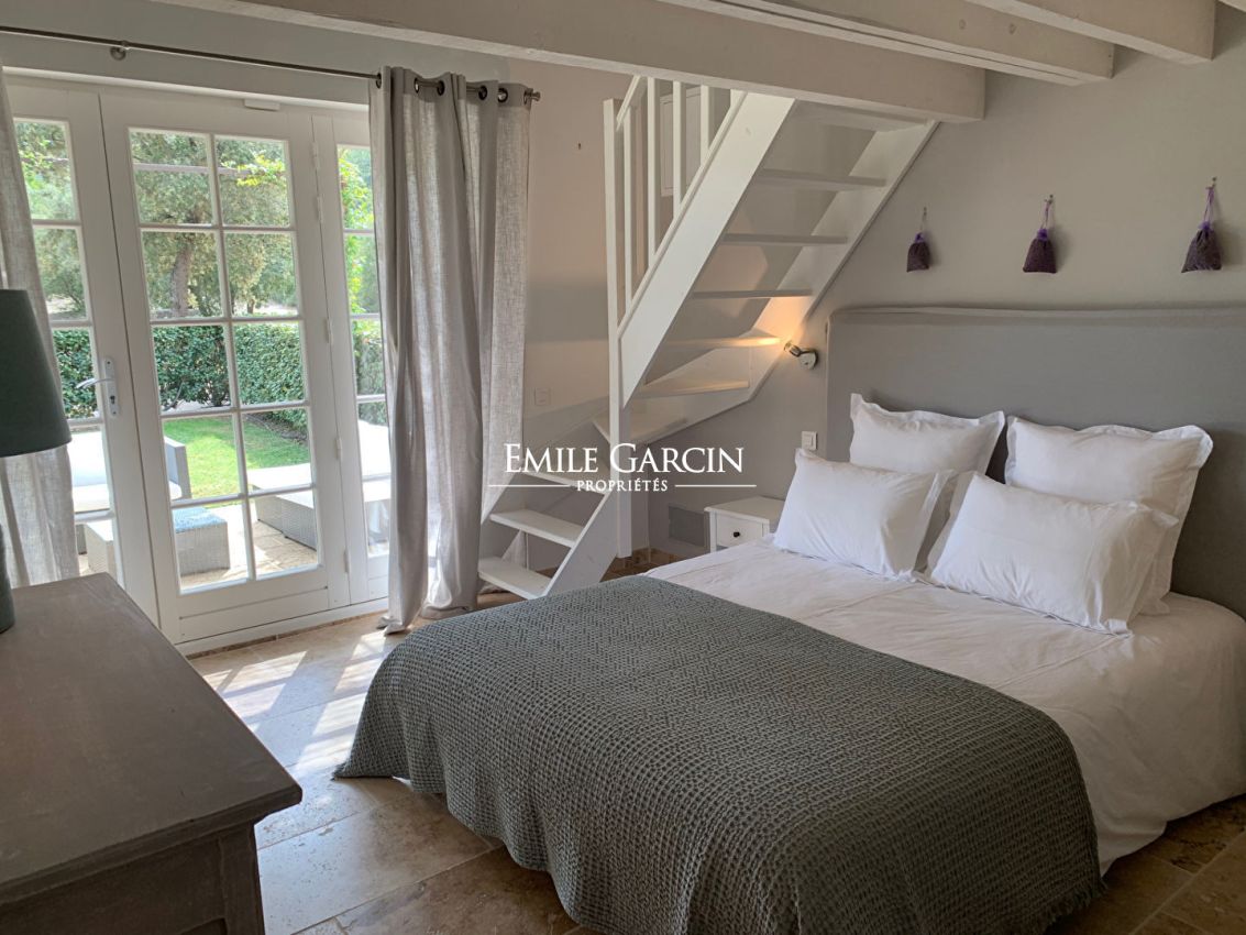 At the foot of the Alpilles, in a peaceful setting, this fully restored farmhouse offers a spectacular view. 6 air-conditioned bedrooms 2 of which are in a separate annexe and 4 bathrooms. Heated saltwater pool 15 mx 6 m secured by an electric cover. Pool house. Fitness room.