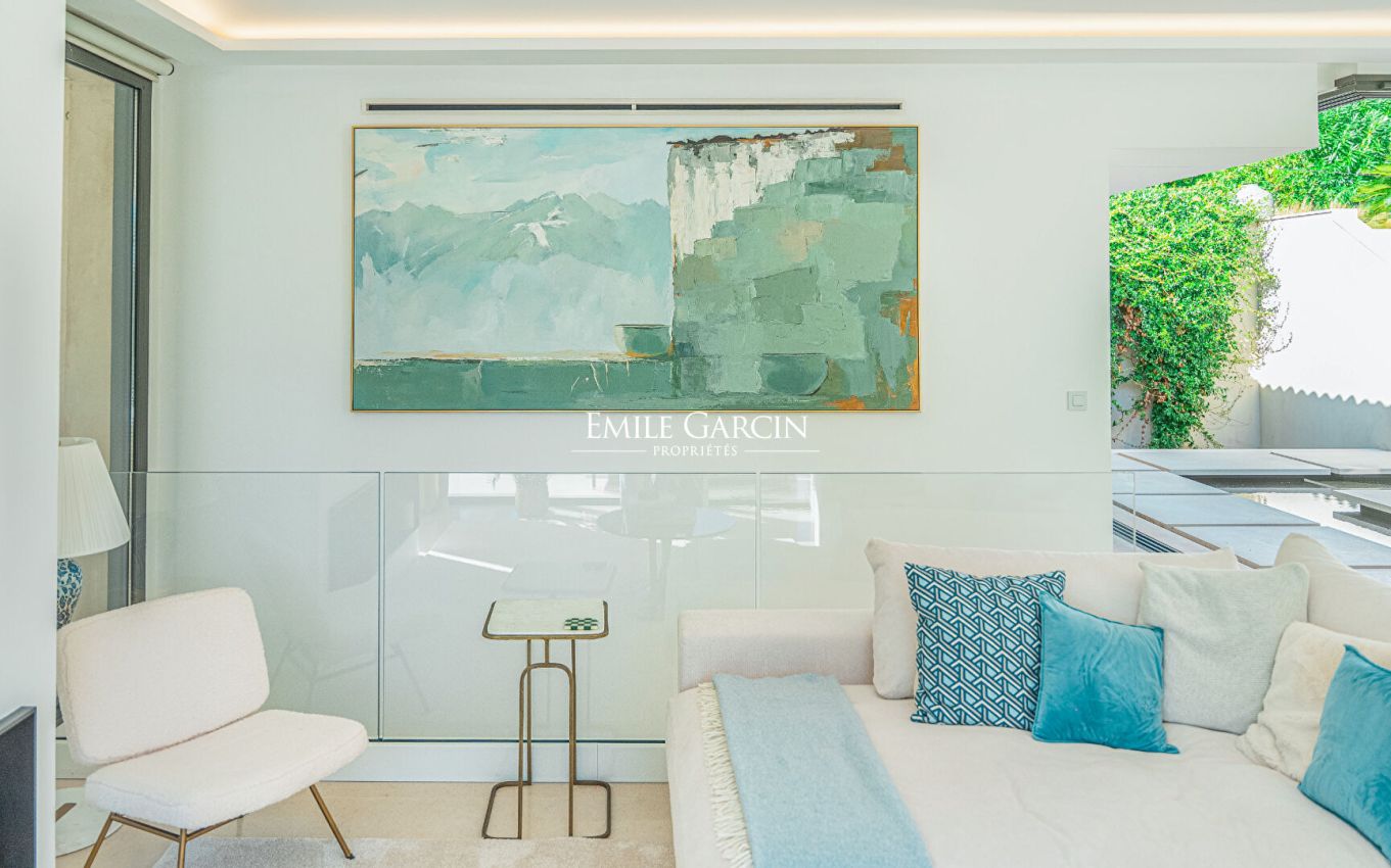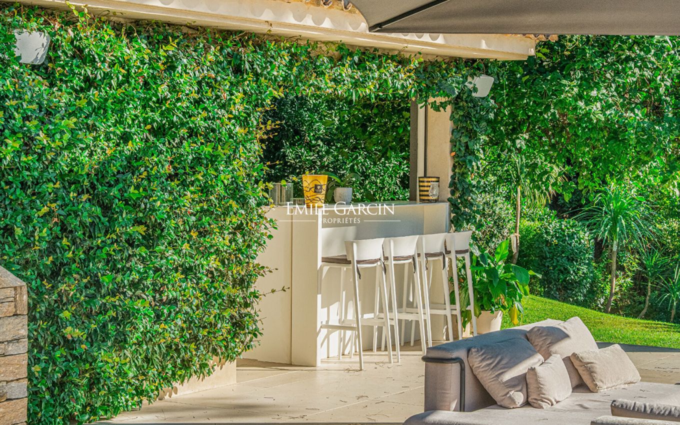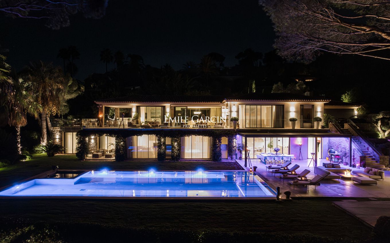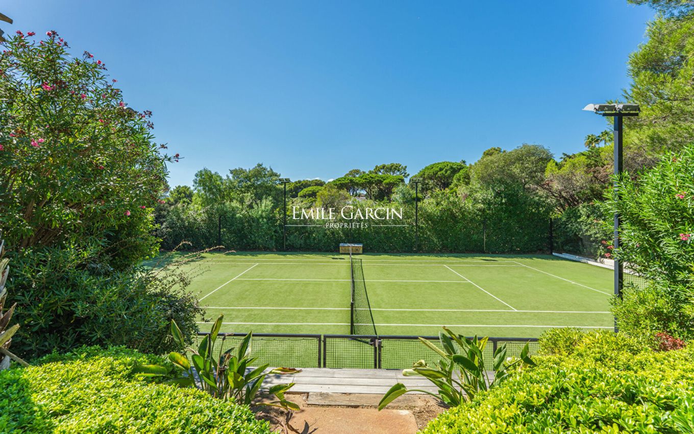 Idyllically located in a private estate just a 15-minute walk from the beachfront, this 490-sq.m property boasts a tasteful decor. Heated swimming pool with secure fence. Sauna. Steam room. Tennis court. Sea view. 8 bedrooms, 8 bathrooms. 2 staff suites. Licence number: 83101000683MP
