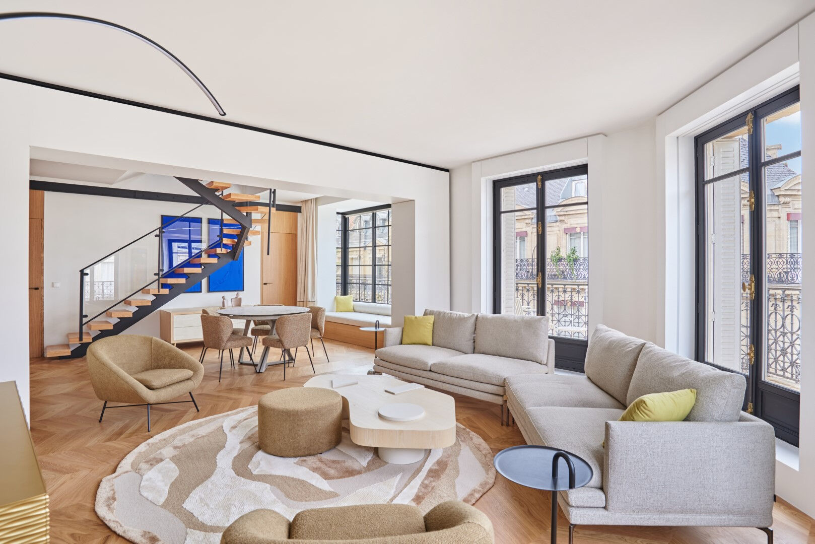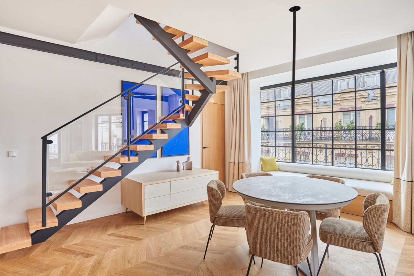 Located on the fifth and sixth floors of an elegant building in the immediate vicinity of the Avenue Montaigne, this fully-renovated and air-conditioned corner apartment presents 124 sq.m of charming living area. It comprises an entrance hall, a large living/dining room with wraparound balcony, a separate fully fitted and equipped kitchen backing onto the balcony, three ensuite bedrooms (one upstairs), and a guest WC. Additional facilities include two cellars. Two parking spaces are available for an additional 500 EUR per month. Fibre broadband is installed in the apartment and included in the rent. Individual gas heating and electric boiler. High-end finish, excellent condition, bright, ample storage, air conditioned. Elevator access. EPC: C. Bail code civil (exclusively for use as a secondary residence or for employee accommodation). Please contact us directly for information on any further fees that may apply. MONTHLY RENT: 10,000 EUR including charges. AVAILABLE IMMEDIATELY.