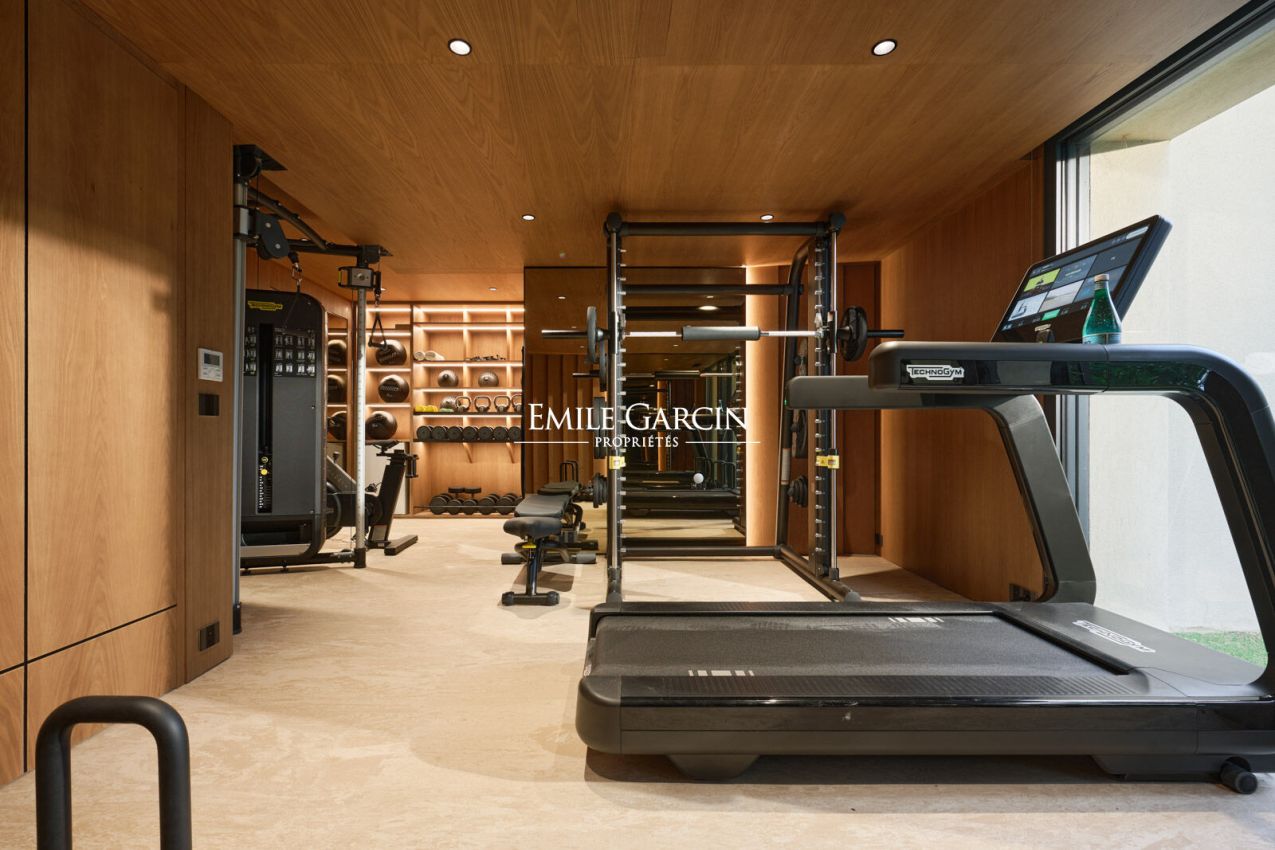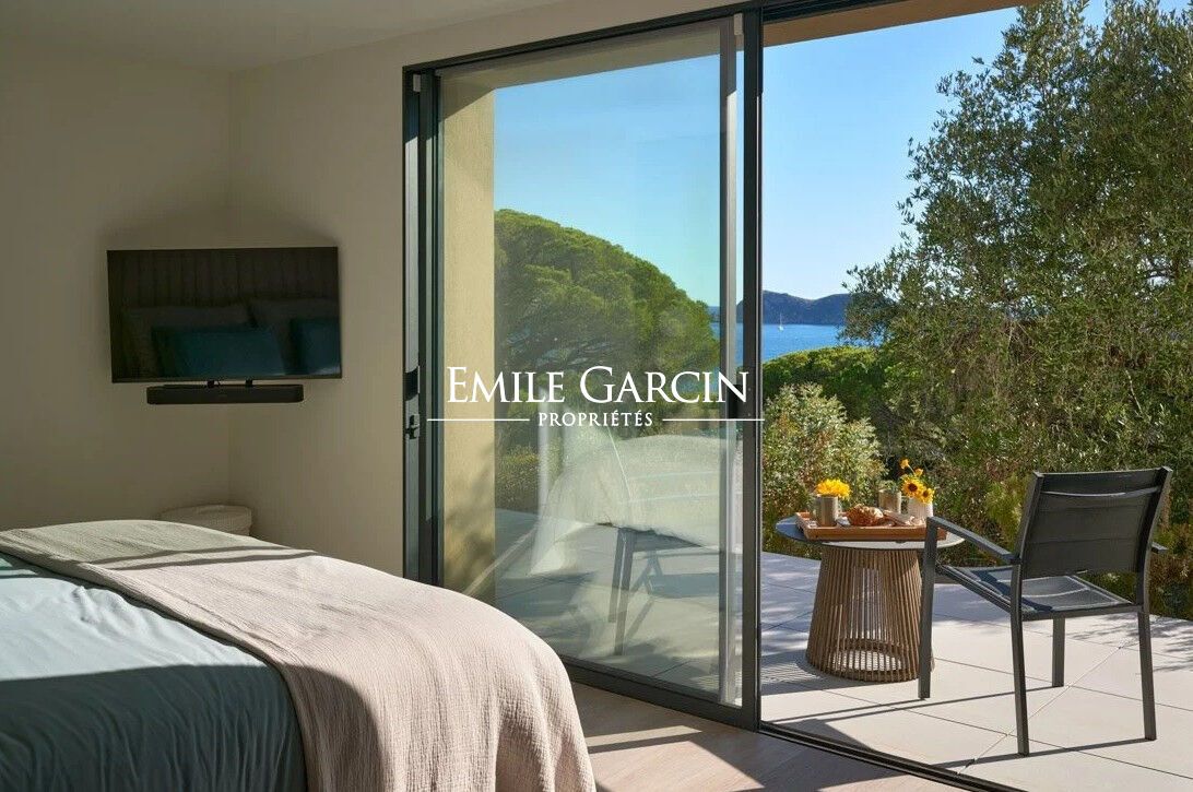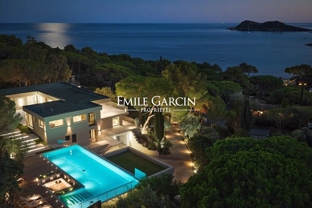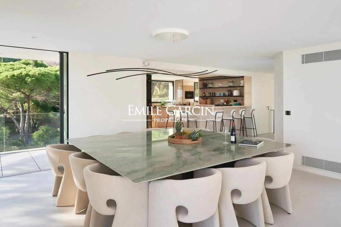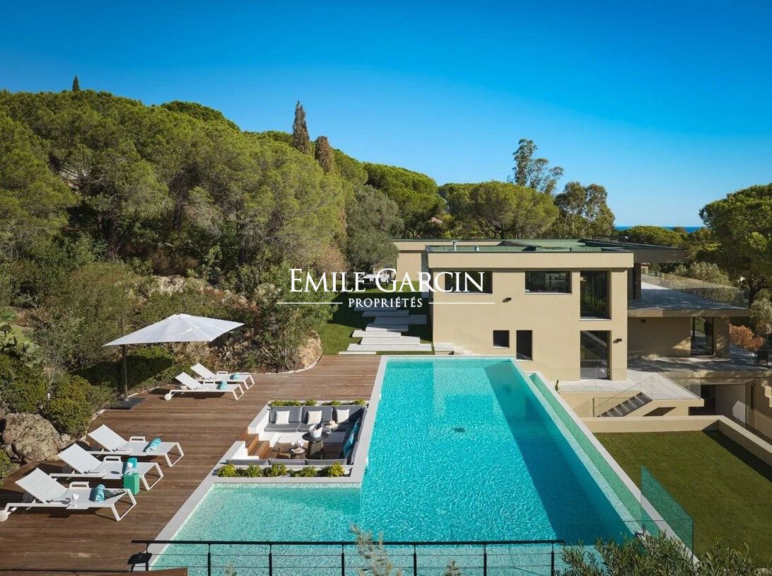 Located on a private estate, this elegant modern three-level property offers stunning views of the seafront and the Cap Taillât. It presents seven bedrooms, a staff bedroom, a home gym (including (Lagree Pilates equipment and Technogym bike), a home cinema, a hammam, a sauna, a heated swimming pool and a pétanque area. Cold store. Security guard and daily housekeeping are included in the rental fee (two full-time staff to handle routine cleaning). Continental breakfast provided each morning. Registration number: 83101000643 WT