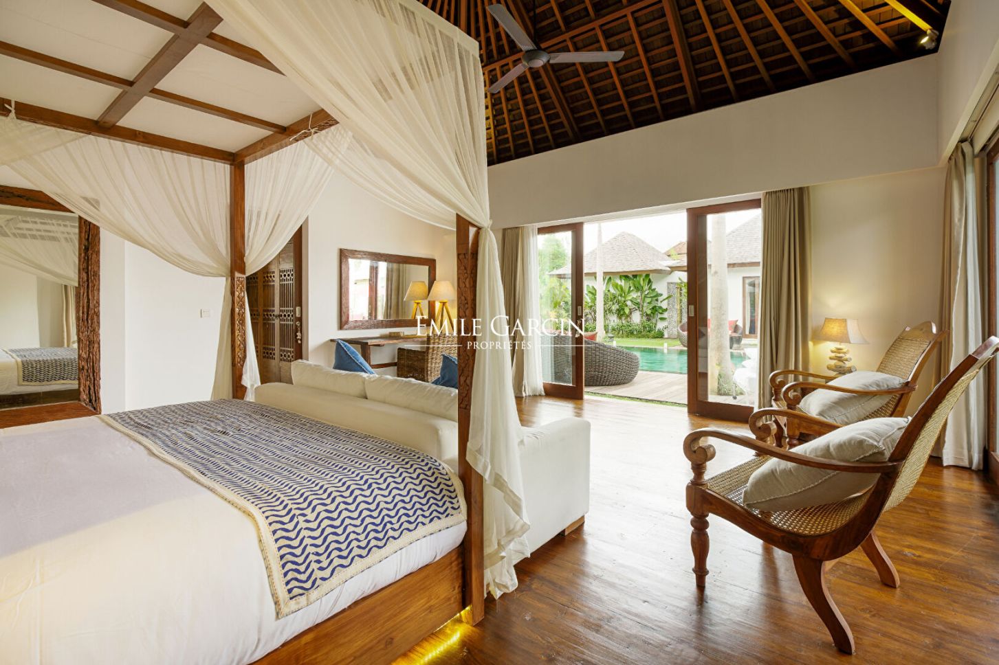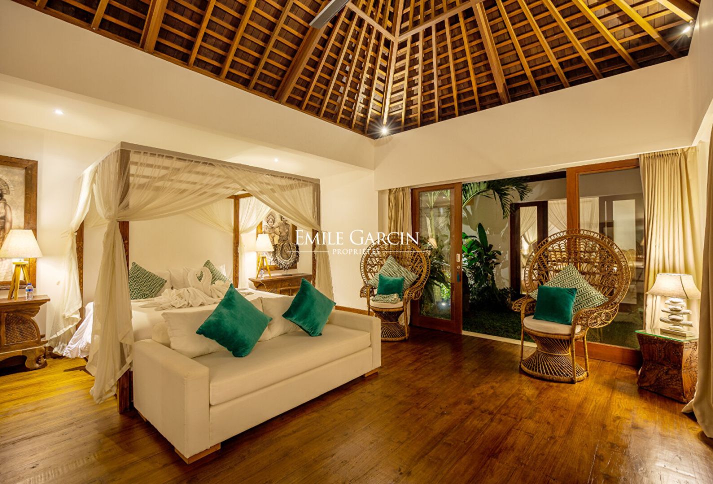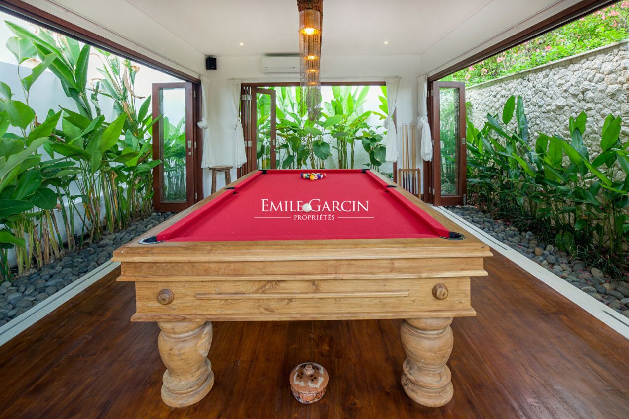 Nestled in the heart of 2600 square meters of tropical gardens and surrounded by Balinese rice fields, this villa offers a peaceful and pleasant setting. Located near Seminyak, this six-bedroom sanctuary is the perfect haven for gatherings with friends and family. Each bedroom, arranged around the pool, offers its own en-suite bathroom, while the two master bedrooms have private plunge pools. The spacious living and dining areas cover almost 200 square meters, providing ample space for relaxing and entertaining. Fully equipped, the villa offers a 25-meter swimming pool, a gym and a media room. You can also enjoy delicious meals prepared on the barbecue or pizza oven, or indulge in some friendly competition in the billiard room. With an outdoor gazebo for massages and a seamless fusion of indoor and outdoor spaces, this villa promises an unforgettable getaway. **Available from 4 bedrooms.