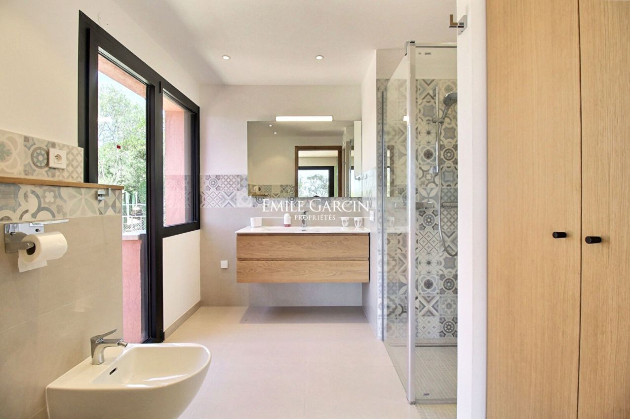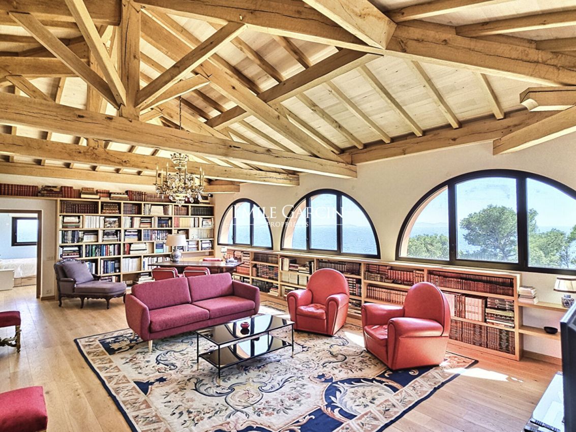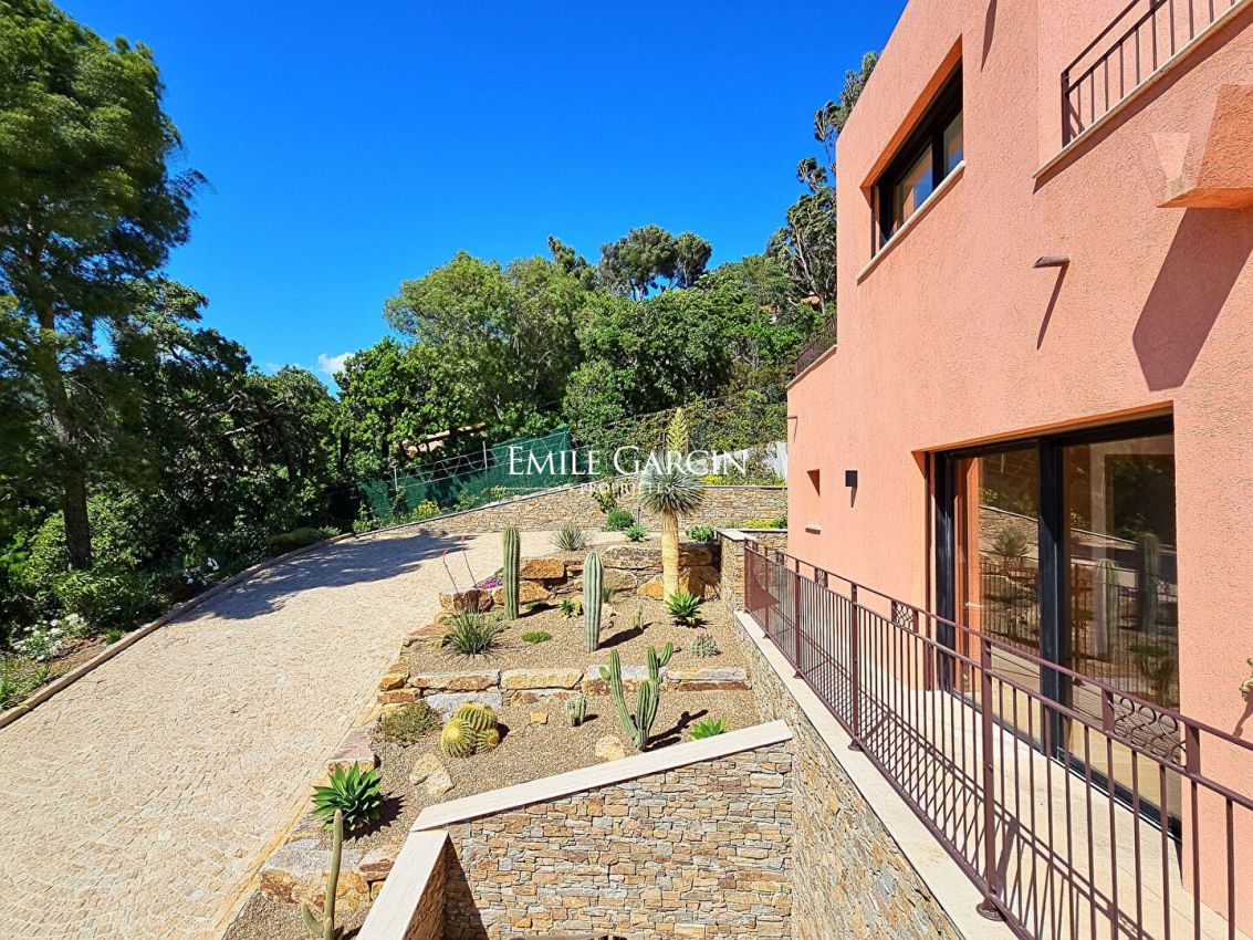 Villa Rosa offers a breathtaking view of the Mediterranean and the Golden Islands. It is located on a private estate with 24/7 secure access. With a surface area of 320 m2, there are 4 bedrooms and 4 bathrooms, a service room with its bathroom on the ground floor, for a total capacity of 10 people. Possibility to rent in addition an independent house with 4 bedrooms, 300 m walk away, located by the sea with direct access for swimming and a private port.