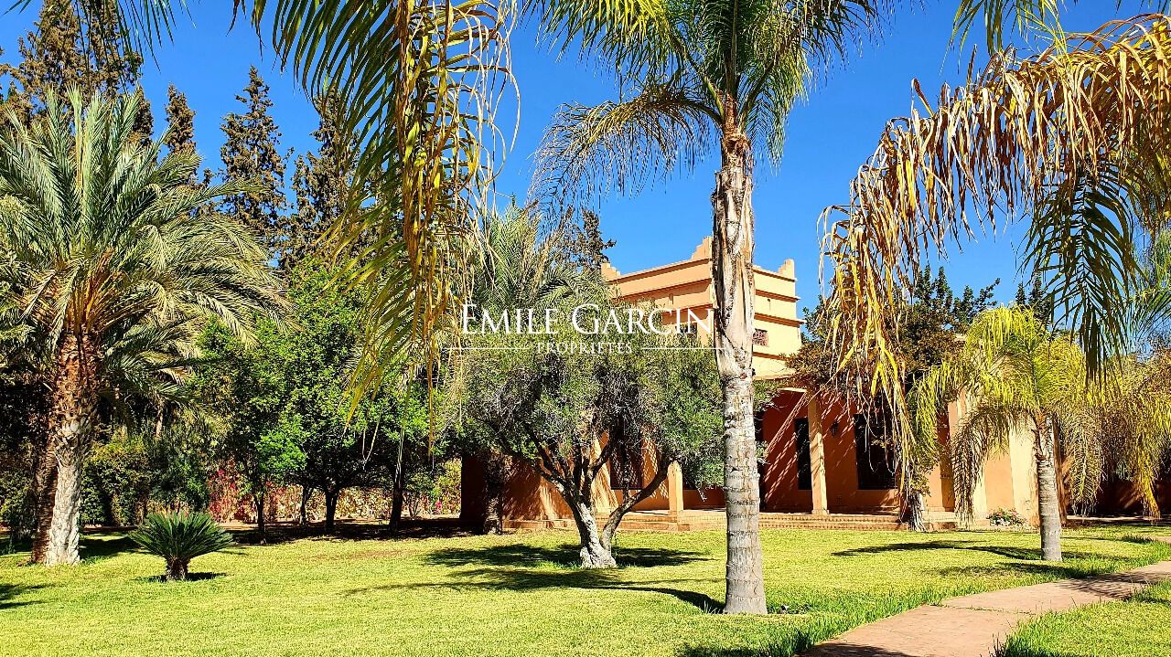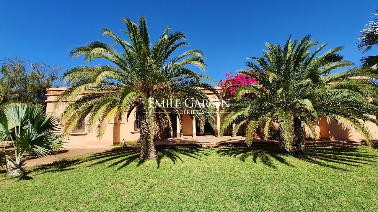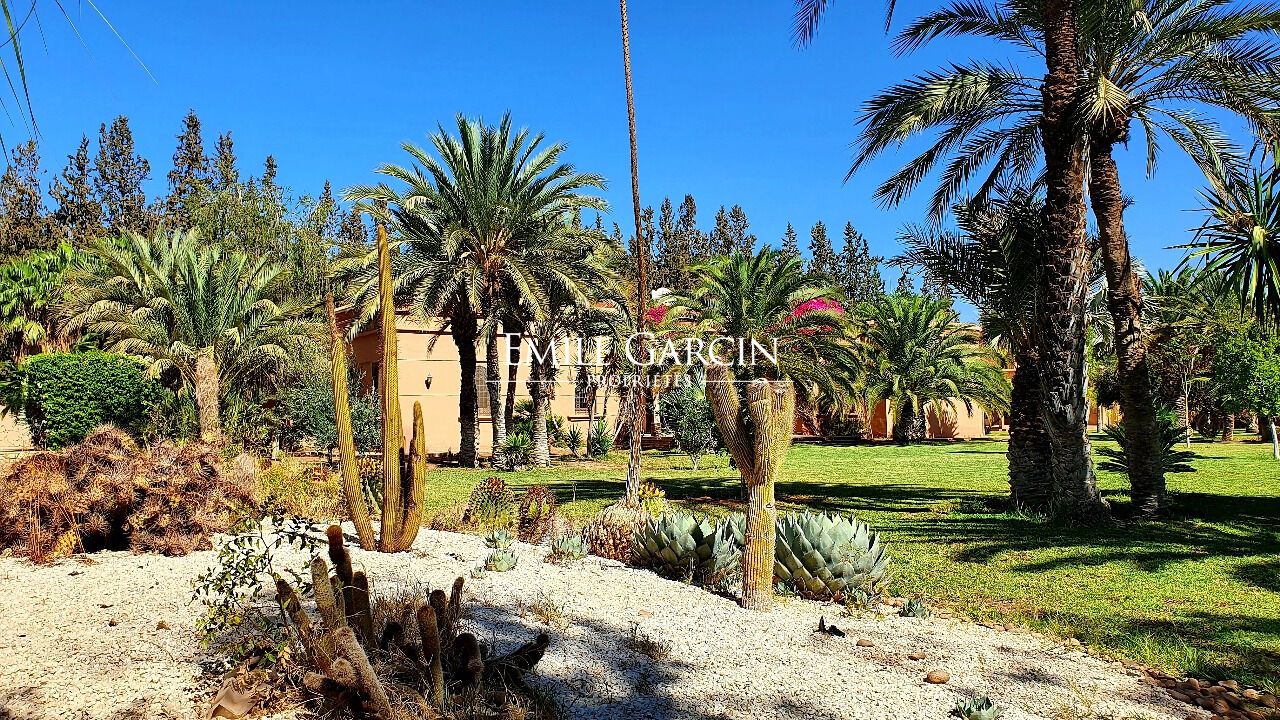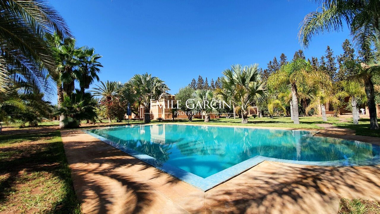 Oriental-style villa of 500 sq.m located on a hectare of lush grounds in the heart of the Palmeraie district of Marrakech. The main house is arranged around an interior patio and offers a beautiful reception room, a TV lounge, a kitchen and four bedrooms. In need of updating works. Guest pavilion in the garden with a kitchen, reception room and two bedrooms with bathrooms. Beautiful swimming pool, garage, central heating, well, connection to the city electricity and water network (Radeema).