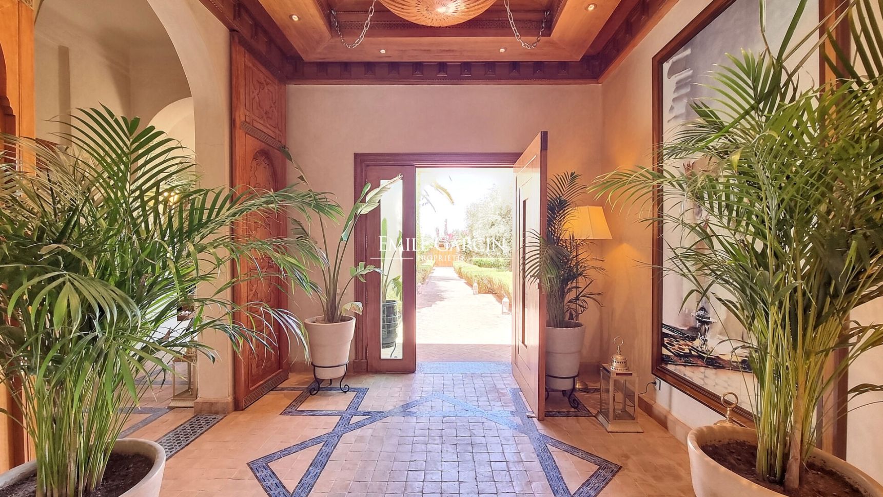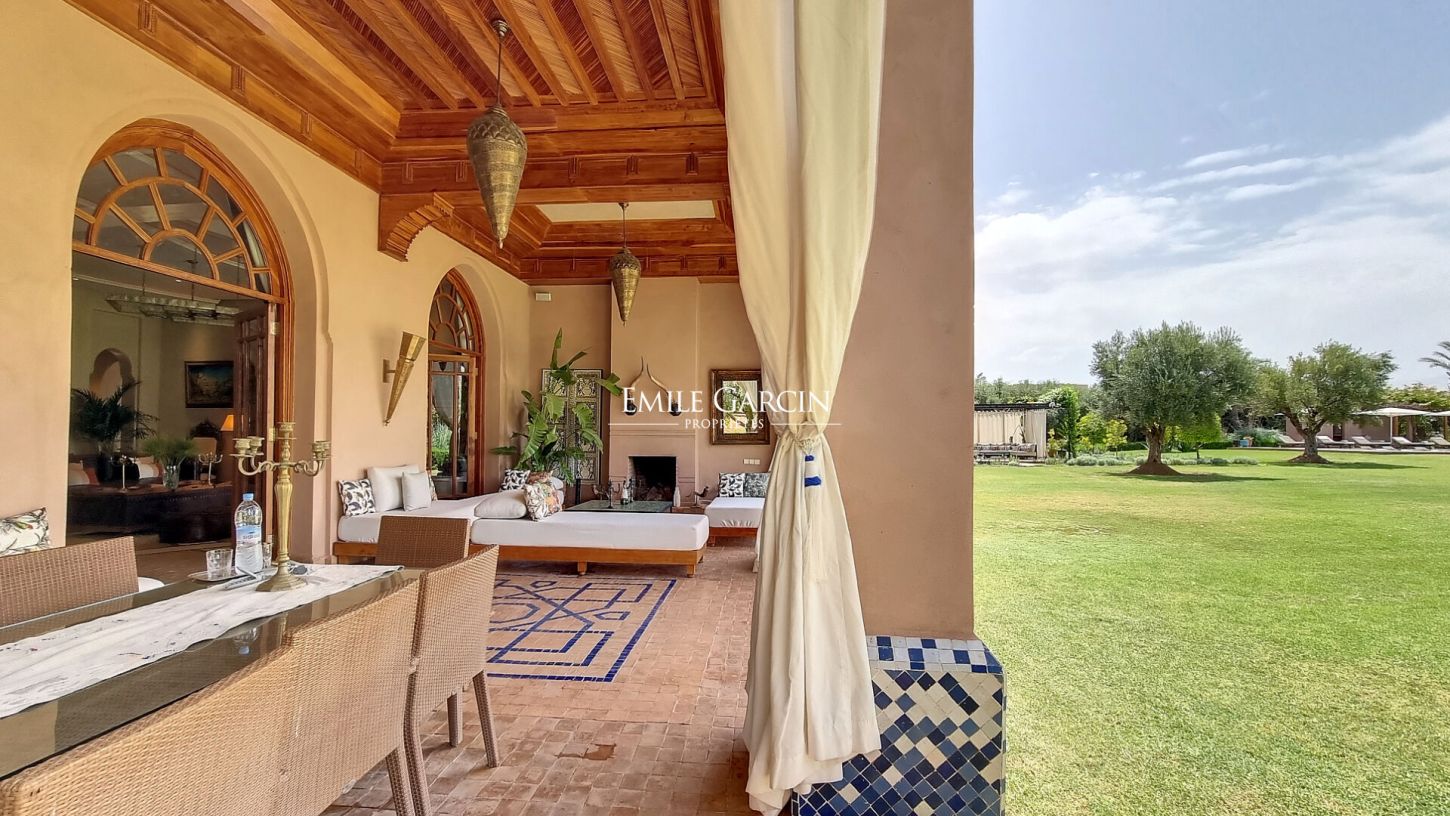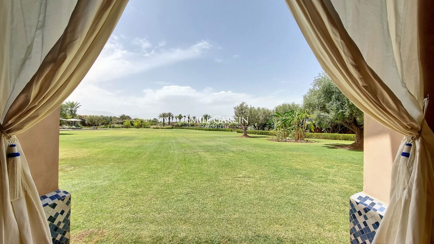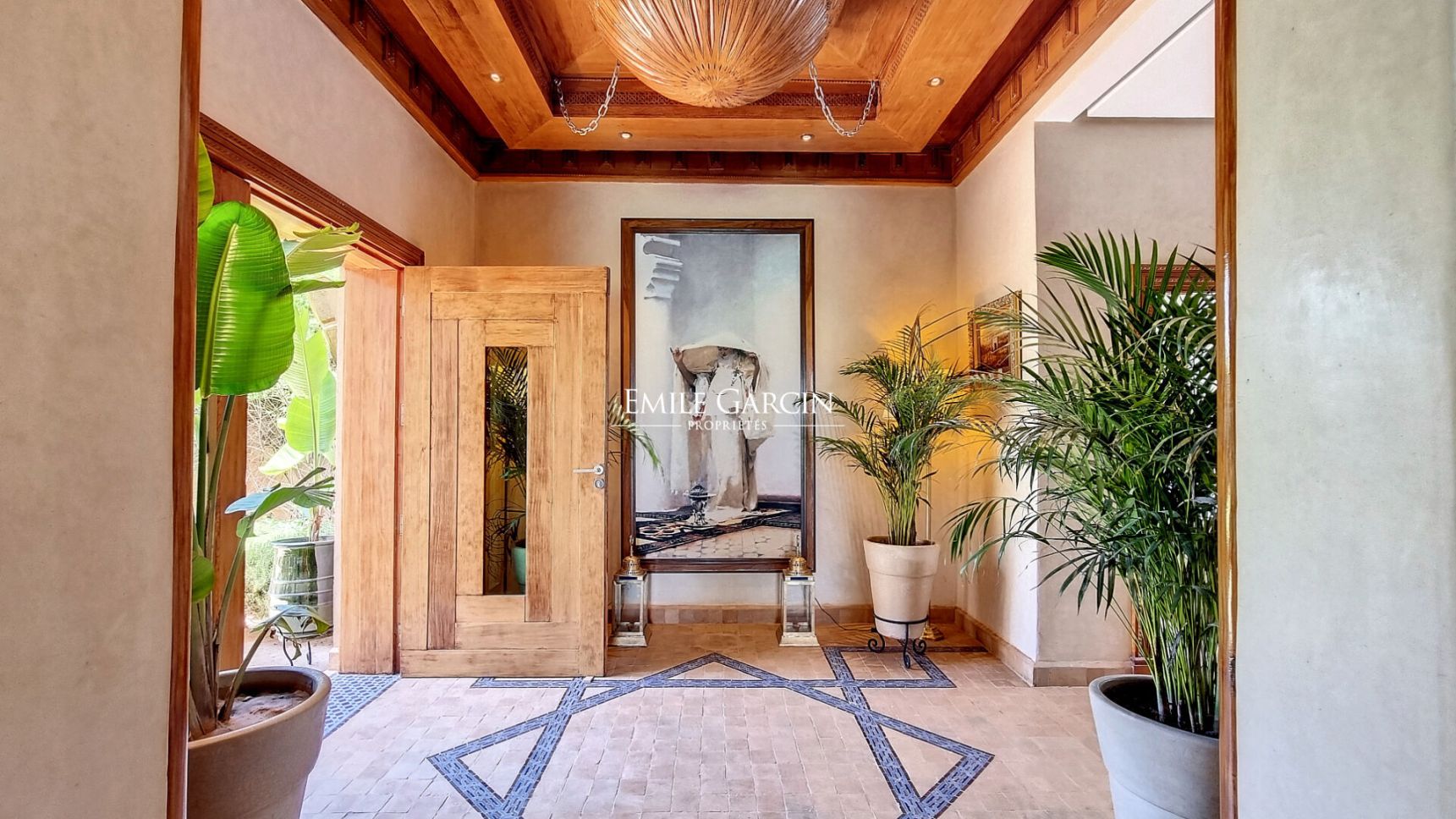 This property is part of a private community of six villas, each built on a hectare of land. It presents approximately 700 sq.m of living area, including large reception space (living rooms and dining room), a tastefully decorated patio, five suites, a swimming pool, carefully furnished terraces, and an outdoor lounge in the garden. This villa showcases traditional Moroccan craftsmanship through its intricate architectural details and offers a high quality finish, featuring solid cedar woodwork, marble flooring and a well-maintained décor. The private estate is equipped with a golf academy, a gym and an organic garden. Exclusive residence. Unobstructed views of the Atlas Mountains.