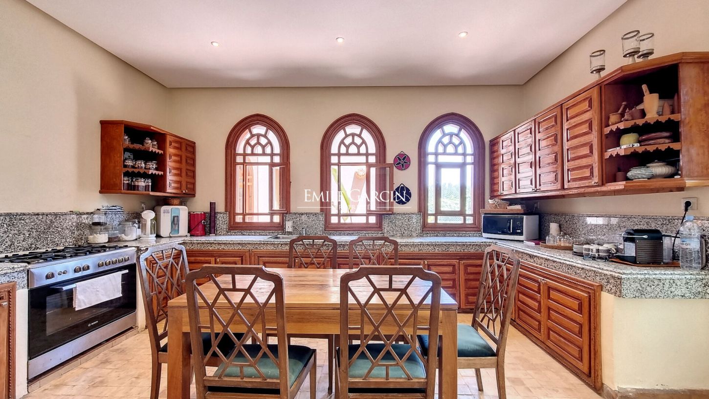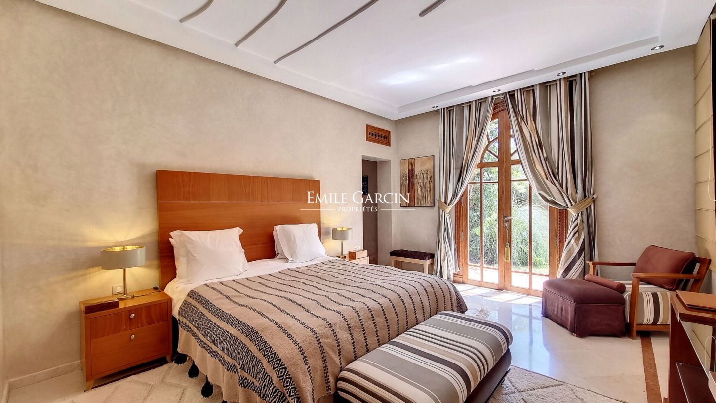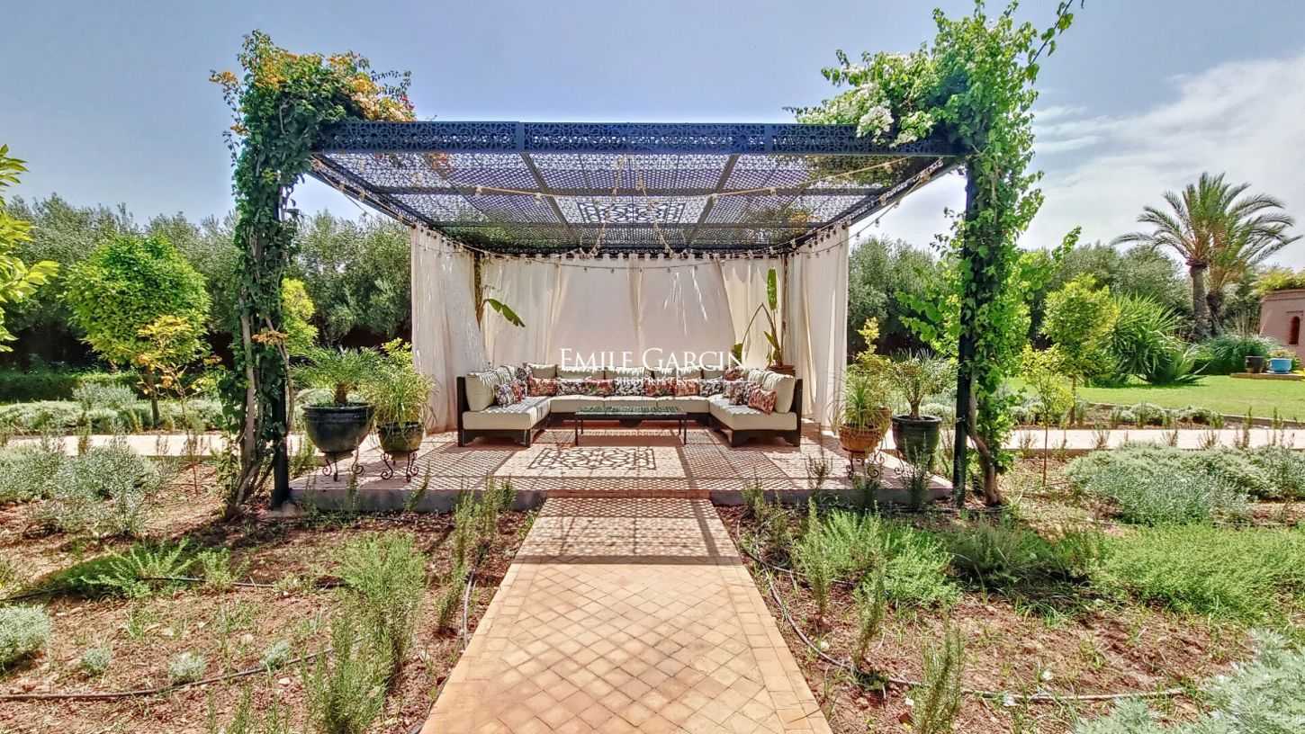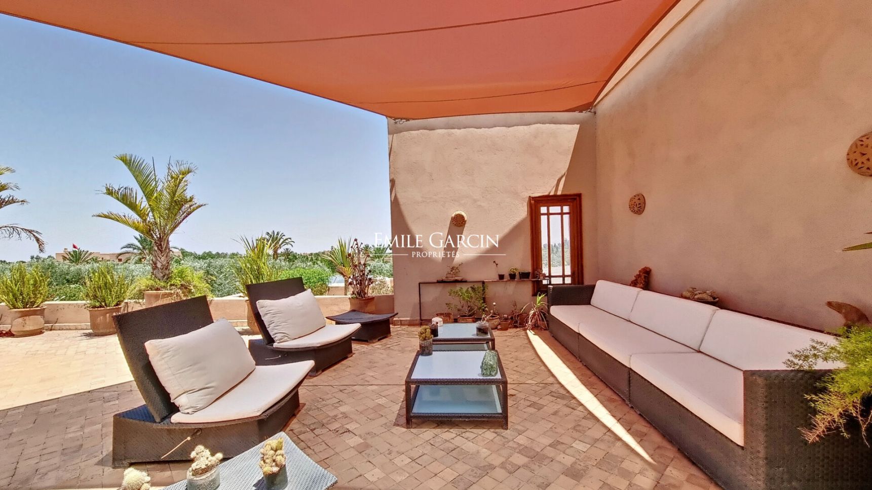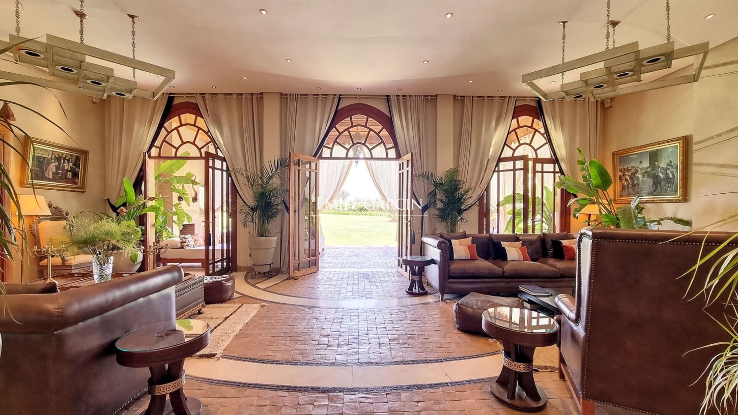 This property is part of a private community of six villas, each built on a hectare of land. It presents approximately 700 sq.m of living area, including large reception space (living rooms and dining room), a tastefully decorated patio, five suites, a swimming pool, carefully furnished terraces, and an outdoor lounge in the garden. This villa showcases traditional Moroccan craftsmanship through its intricate architectural details and offers a high quality finish, featuring solid cedar woodwork, marble flooring and a well-maintained décor. The private estate is equipped with a golf academy, a gym and an organic garden. Exclusive residence. Unobstructed views of the Atlas Mountains.