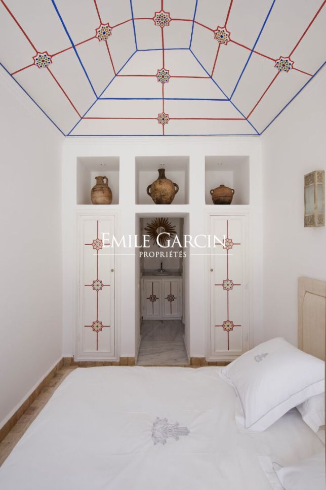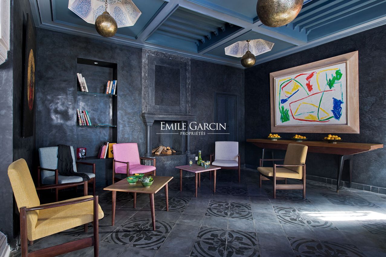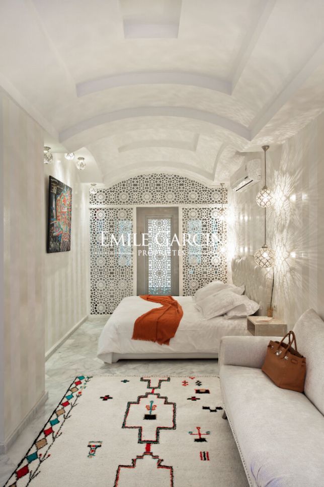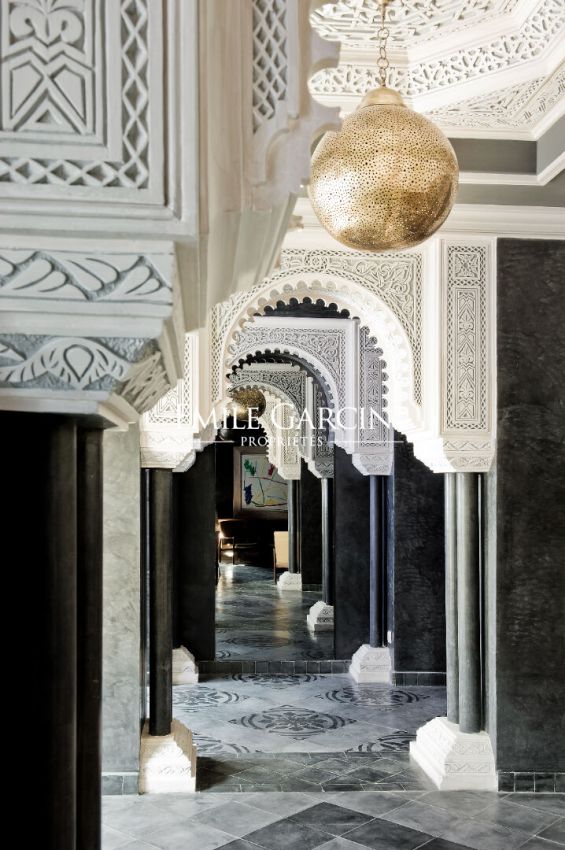 Très beau Riad d'une superficie au sol de 210 m². Superficie habitable 500 m². Riad composé d'une grande pièce de réception, salon et salle à manger. 8 chambres avec salles de bain. Grande terrasse avec Jacuzzi, espace repas et détente. Vue sur l'Atlas et le parc de l'Hôtel La Mamounia. Spa avec hammam et salle de massage.