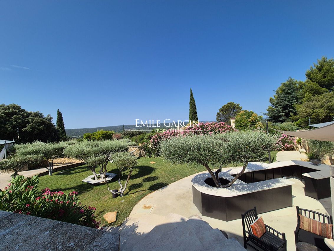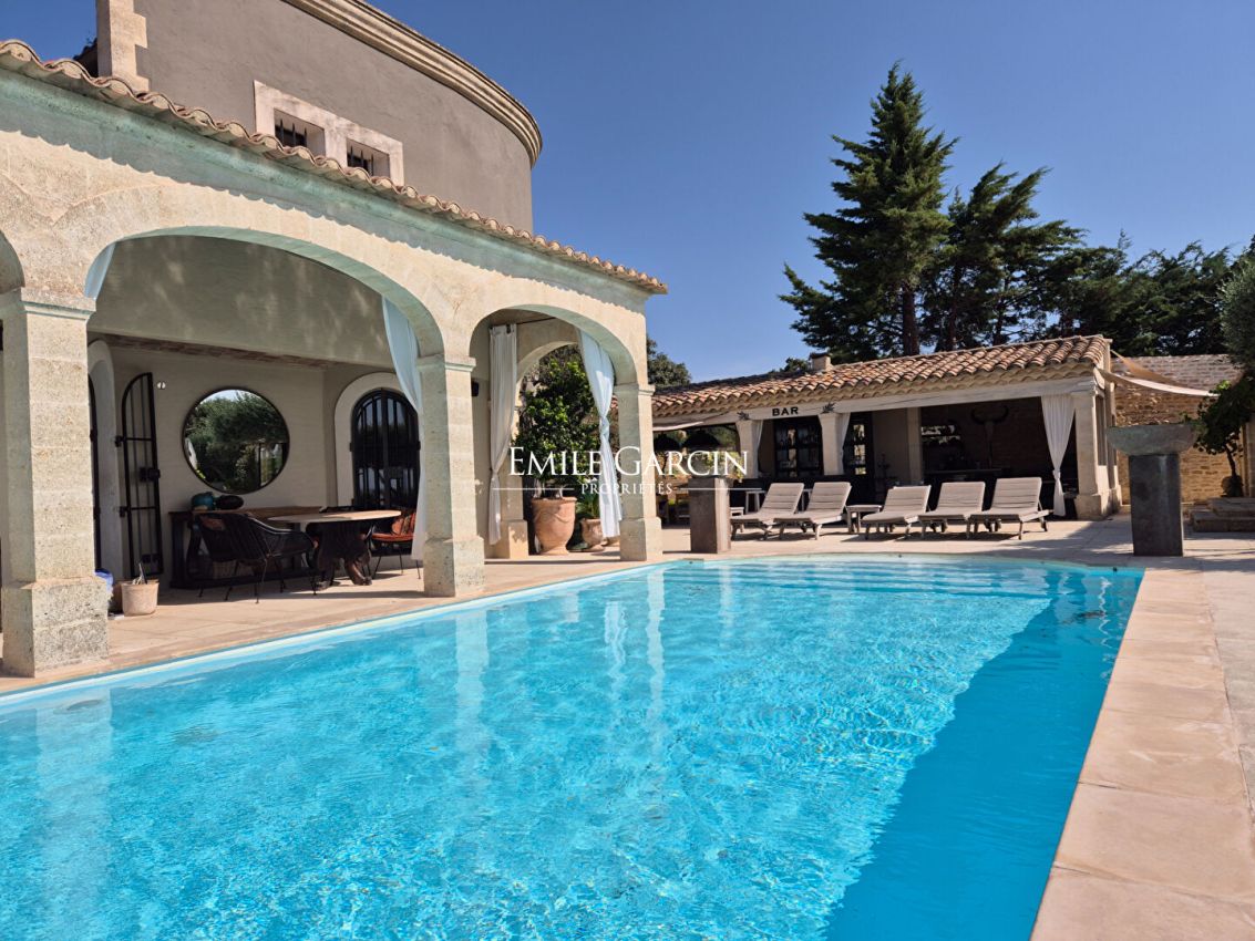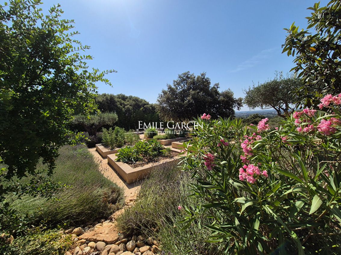 Dans un village typiquement gardois, à 10mn d'Uzès, profitez d'une vue imprenable sur le Pont du Gard depuis cette magnifique villa de prestige de 300 m² et ses 600m2 de terrasses extérieures. Elle offre 7 chambres climatisées avec salles de bain privatives, un salon ouvert sur un patio, une salle à manger, une cuisine principale, un espace bar/café intérieur, une véranda, un bar terrasse extérieur, un BBQ, un brasero, une piscine de 11 m × 5 m, un jacuzzi, un hammam, un terrain de pétanque, ainsi qu'une piste d'atterrissage pour hélicoptère. Le terrain d'un hectare est agrémenté d'oliviers, de lavande et d'un potager. Service de linge et petit déjeuner quotidien inclus. Idéal famille , amis ou groupes associatifs.