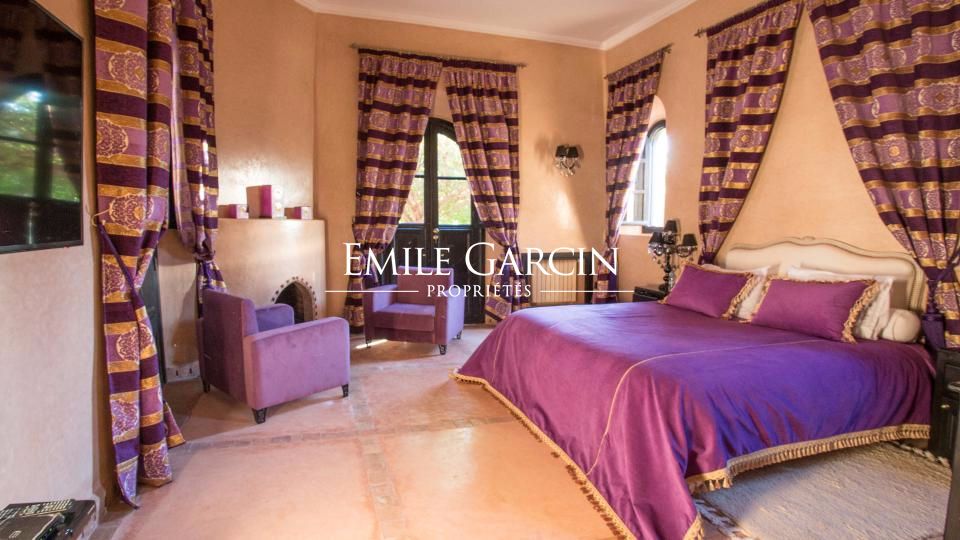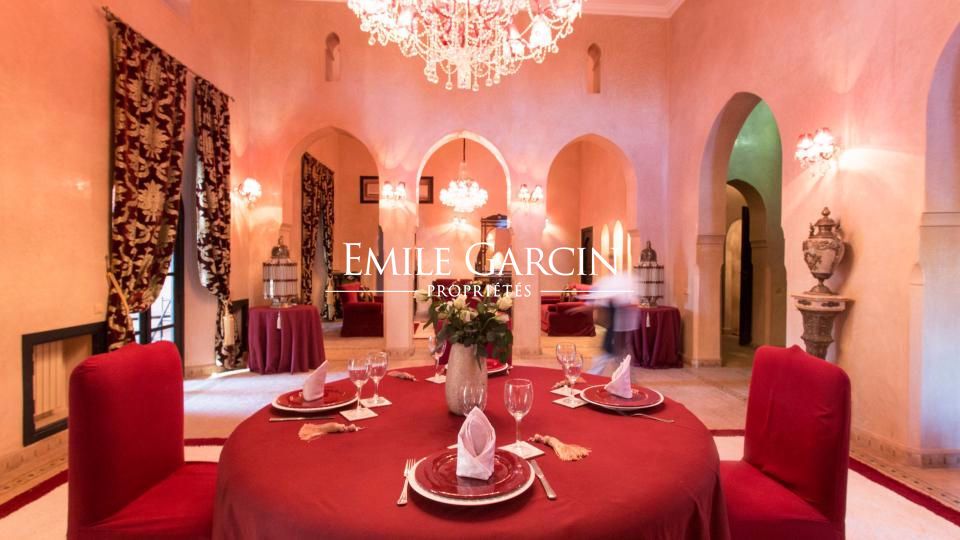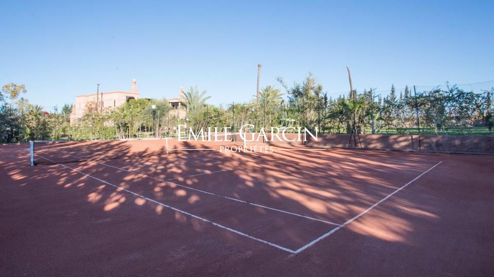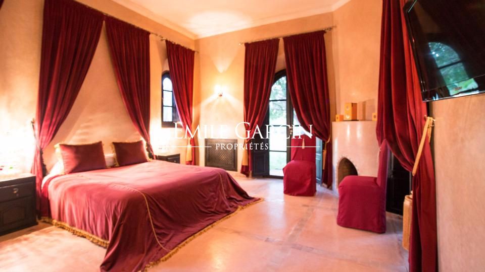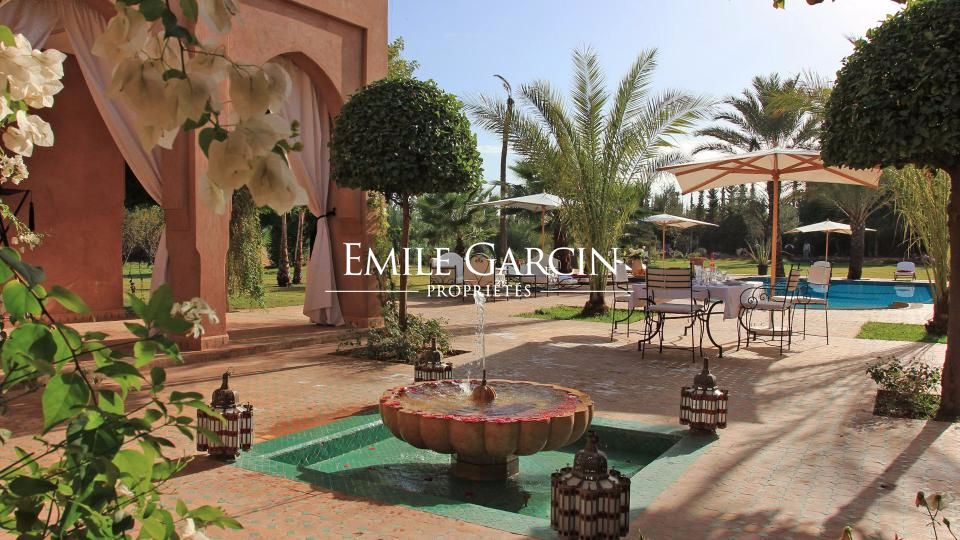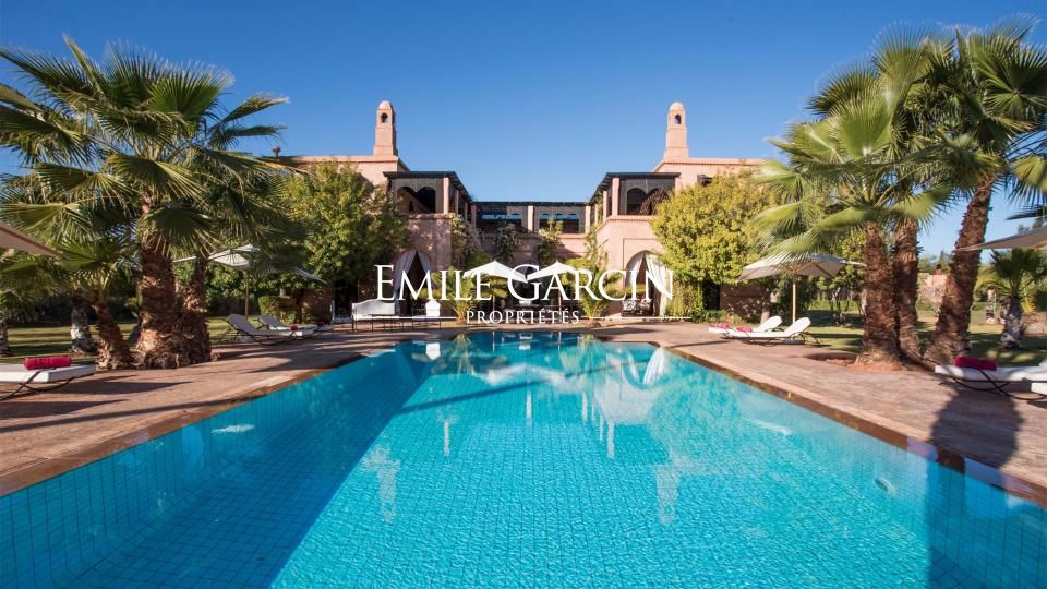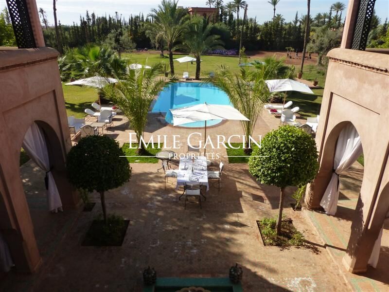 A louer propriété orientale de 800 m² dans la Palmeraie de Marrakech sur 1HA de jardin magnifiquement paysagé. Cette très belle maison bénéficie d'un confort de grande qualité, double réception, 5 chambres avec salles de bain et dressing privatifs.