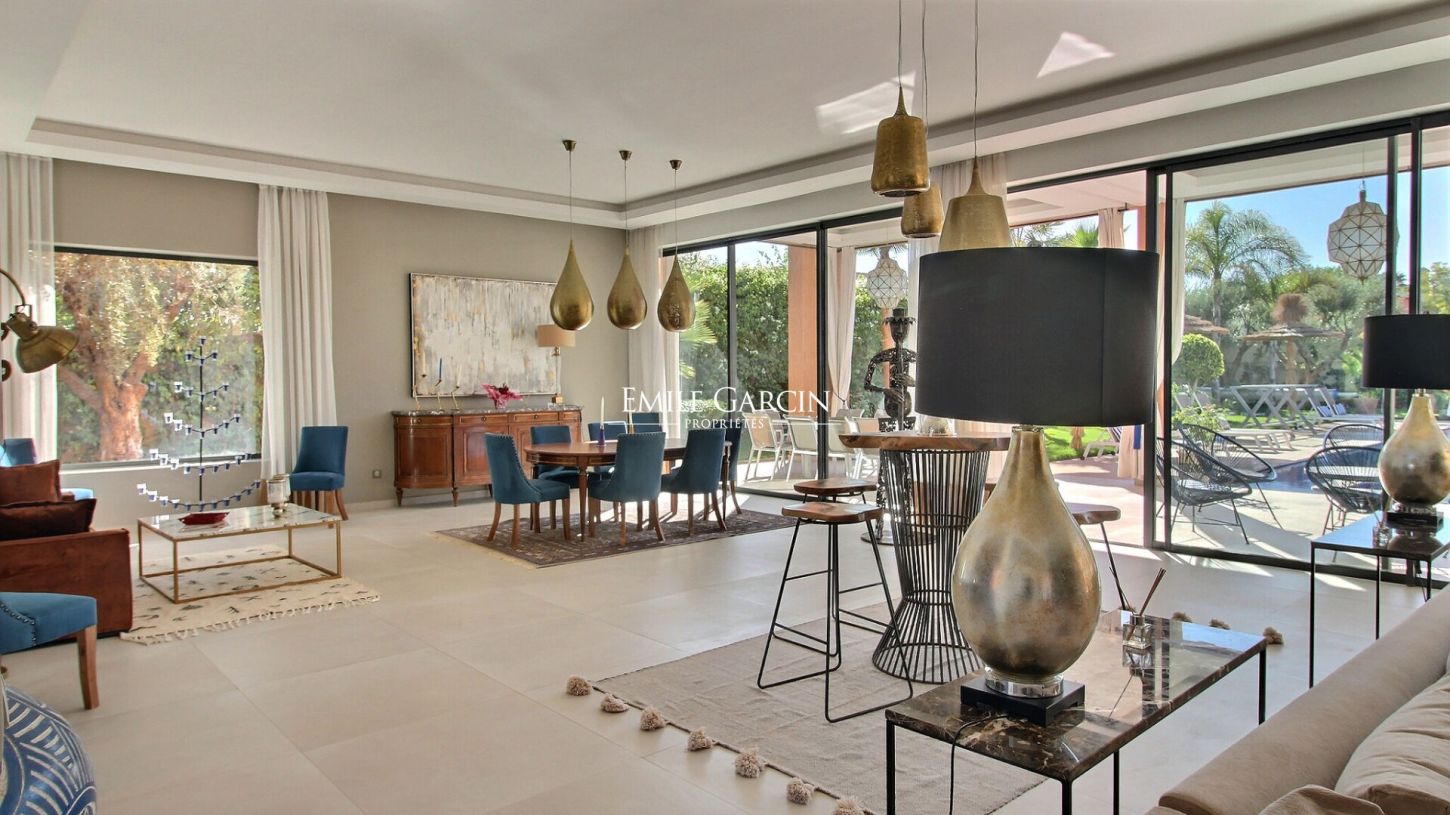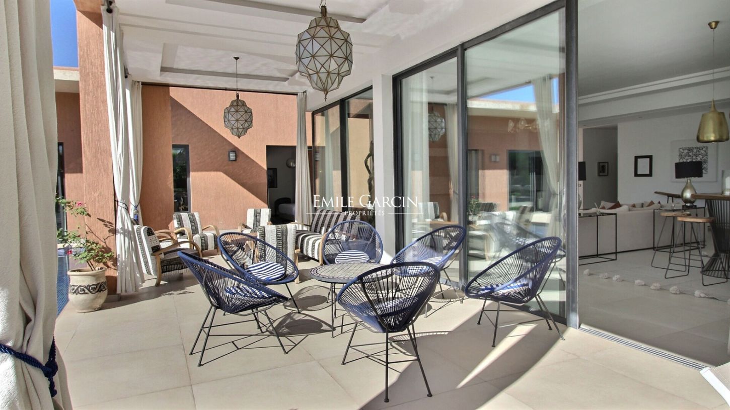 A 15 minutes de Marrakech, cette très belle maison contemporaine de 500m2. 5 suites, réparties autour d'une très belle piscine avec jacuzzi intégré.