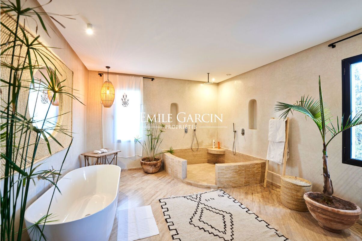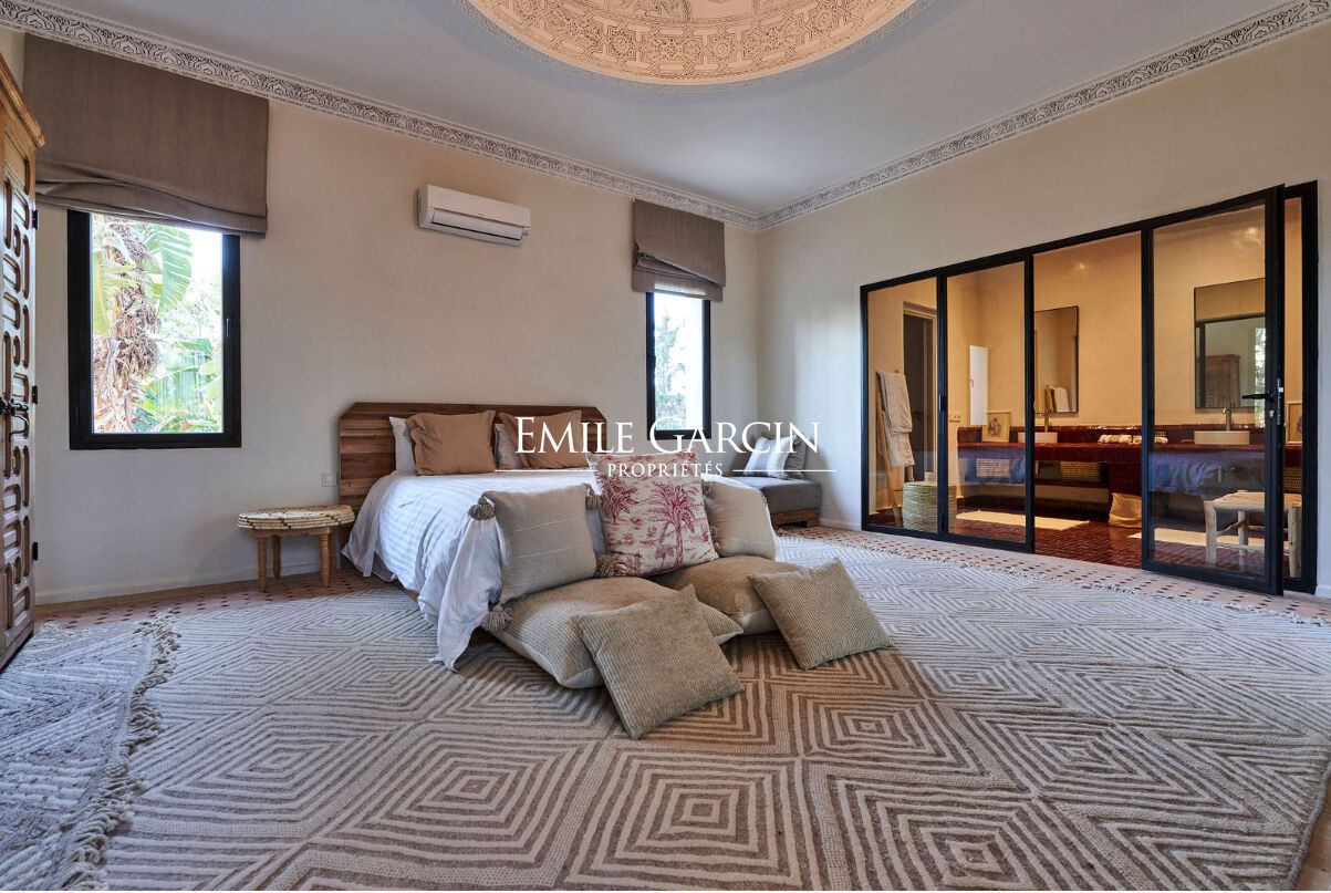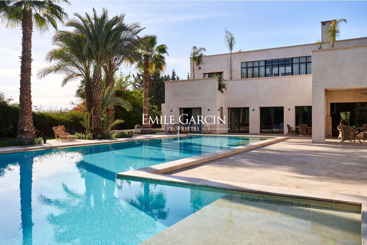 Superbe villa au charme fou idéalement située à 15mn de Marrakech. Meublée et décorée avec élégance, cette propriété de 7 chambres / 6 salles de bain, est la garantie d'un séjour tout confort. Grand triple séjour avec cheminée centrale, agrémenté d'un très beau jardin intérieur et jouissant d'une belle luminosité grâce à une grande verrière.