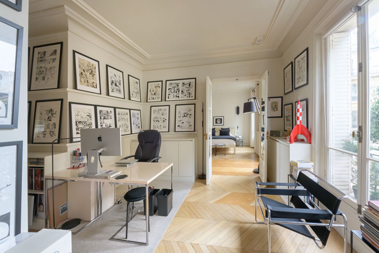 Refait à neuf, ce bien rare séduit par ses volumes généreux, sa hauteur sous plafond de 3 mètres, son parquet en point de Hongrie, ses moulures et ses cheminées. Climatisable. Copropriété de 23 lots ().