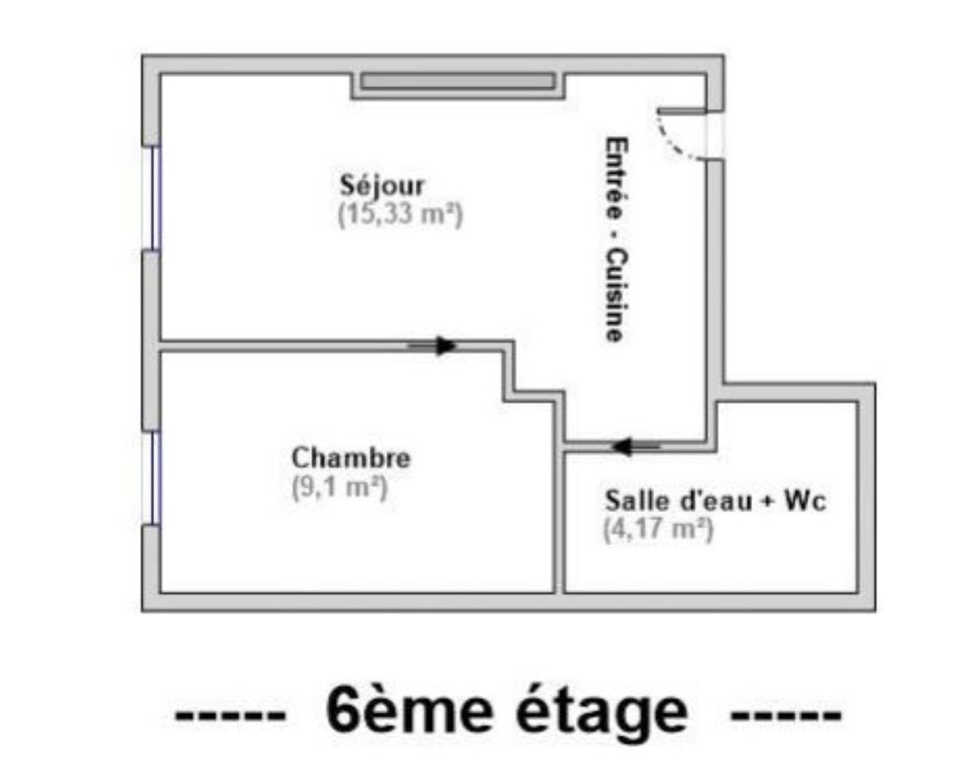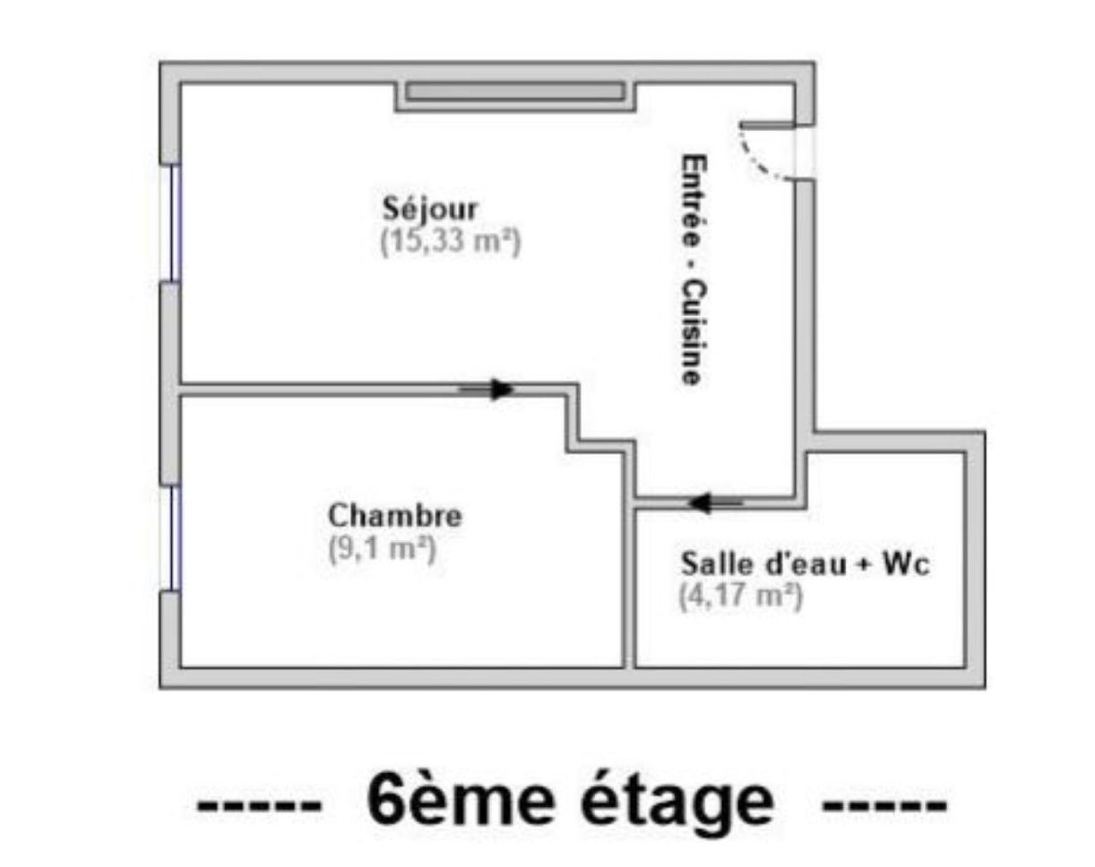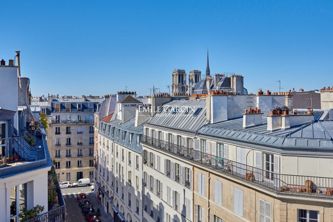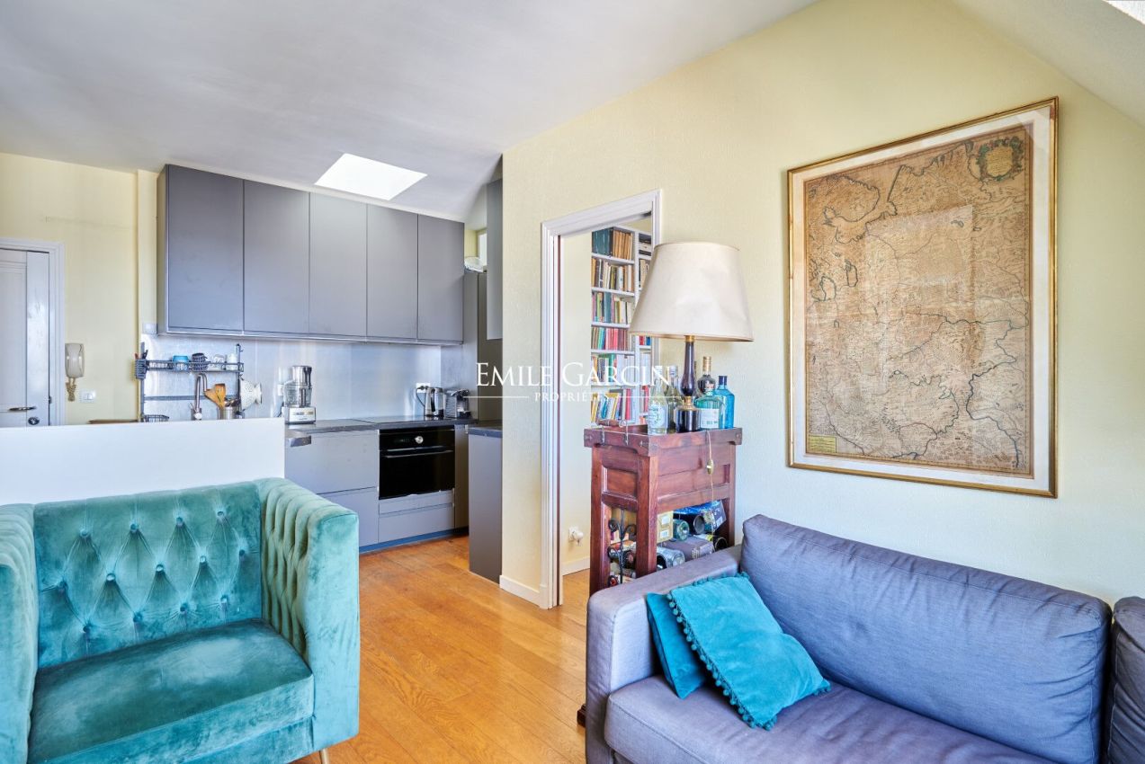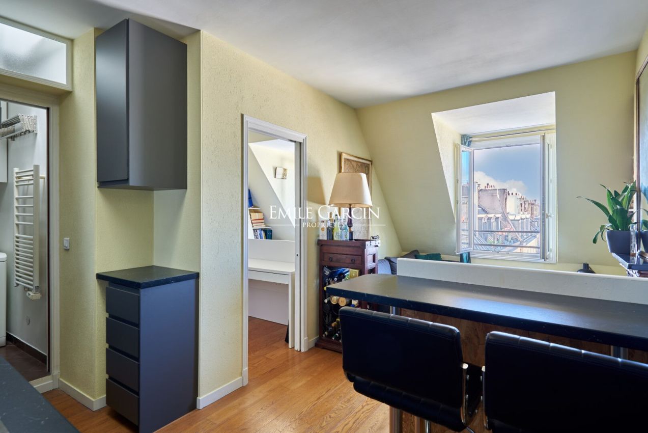 Boulevard Saint Germain - Proche Seine - Au 6e et dernier étage d'un bel immeuble ancien, charmant deux-pièces de 28,60 m² loi Carrez bien optimisé comprenant une pièce de vie lumineuse avec cuisine ouverte, chambre, salle d'eau. Sans vis-à-vis, espace optimisé et fonctionnel. Appartement rénové, calme et lumineux avec une vue dégagée.