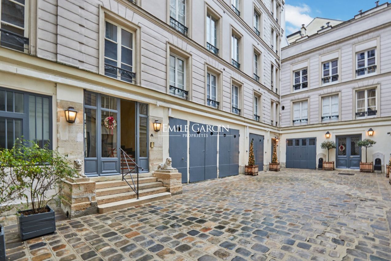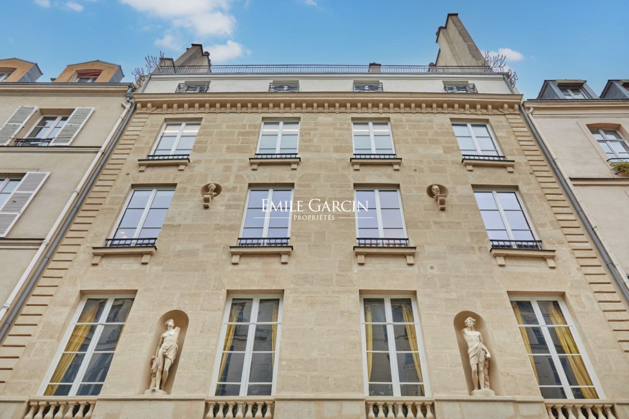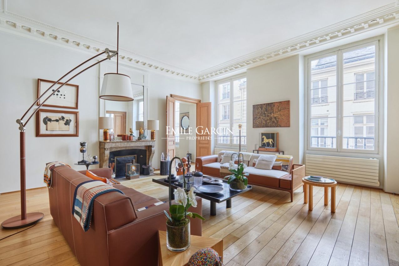 Saint Germain des Près - Dans un magnifique immeuble à la façade néoclassique ornée de statues classiques, au 2ème étage avec ascenseur, cet appartement de 206,03 m² loi Carrez et 213.86 m² au sol avec une hauteur sou plafond de 3,5 mètres, se compose d'une entrée, une double réception avec de hauts volumes, une suite principale avec dressing et salle de bains avec toilettes, une deuxième chambre avec salle d'eau et toilettes, un bureau, au centre, une cuisine Boffi équipée. Charme de l'ancien parquet, cheminées, moulures. Une double cave complète ce bel ensemble. Gardien à demeure. Parfait pied à terre au coeur de Saint Germain des Prés. Rare.