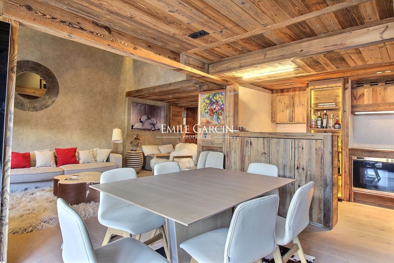 Megève - Rochebrune, au pied des pistes de ski et proche du centre, bel appartement rénové d'une surface totale de 125 m² (114.92 m² loi carrez) sur 2 niveaux comprenant un grand séjour avec cheminée et cuisine ouverte donnant sur un balcon avec vue sur le Mont Blanc et les montagnes environnantes, une mezzanine, 4 chambres en suite, 2 box voitures et 3 placards à skis.