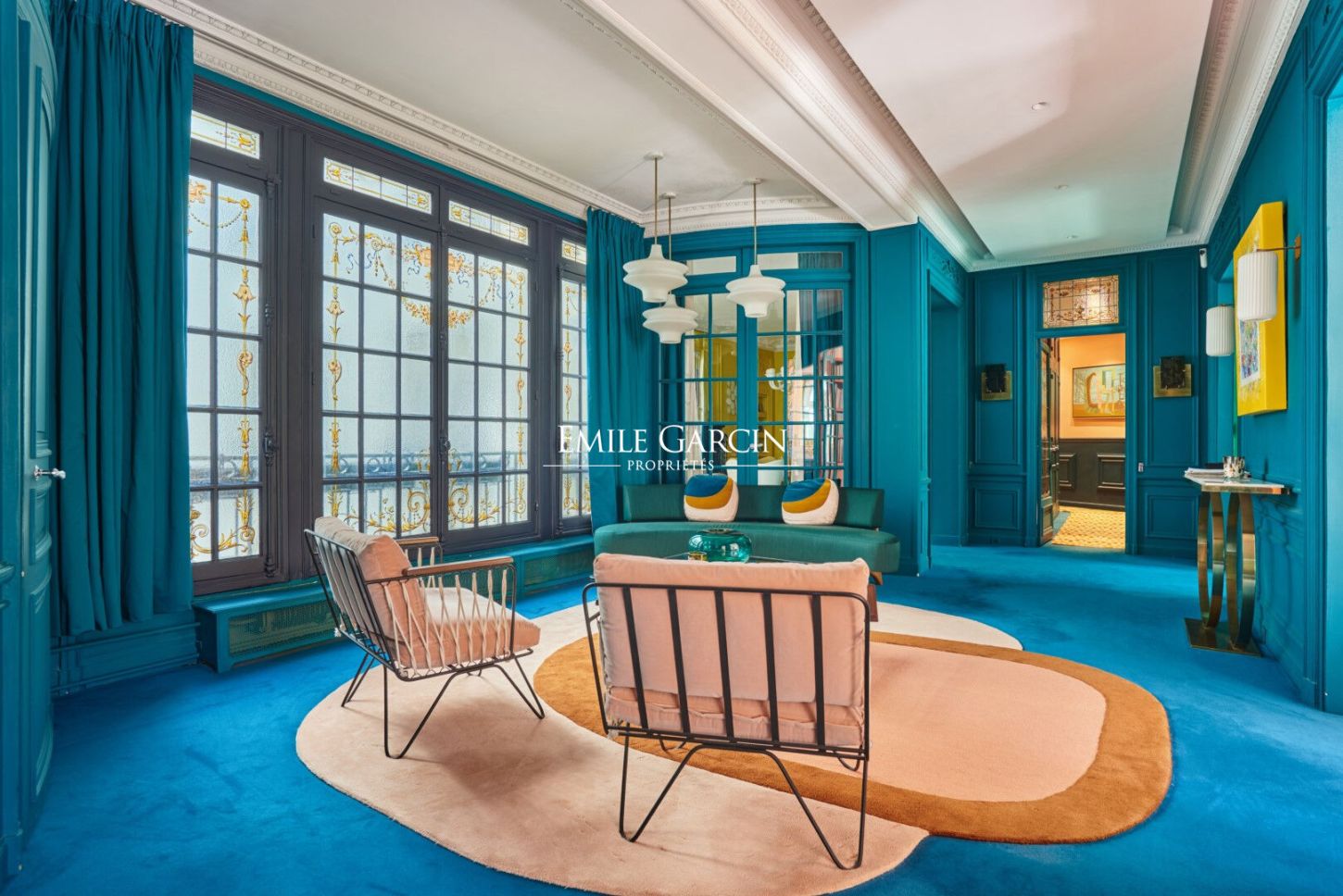 La palette chromatique, résolument affirmée, sublime les perspectives et révèle une atmosphère chaleureuse et vivante, tout en conservant une grande cohérence esthétique. Les espaces de réception, largement ouverts, invitent à la convivialité, tandis que les espaces nuit préservent intimité et confort.