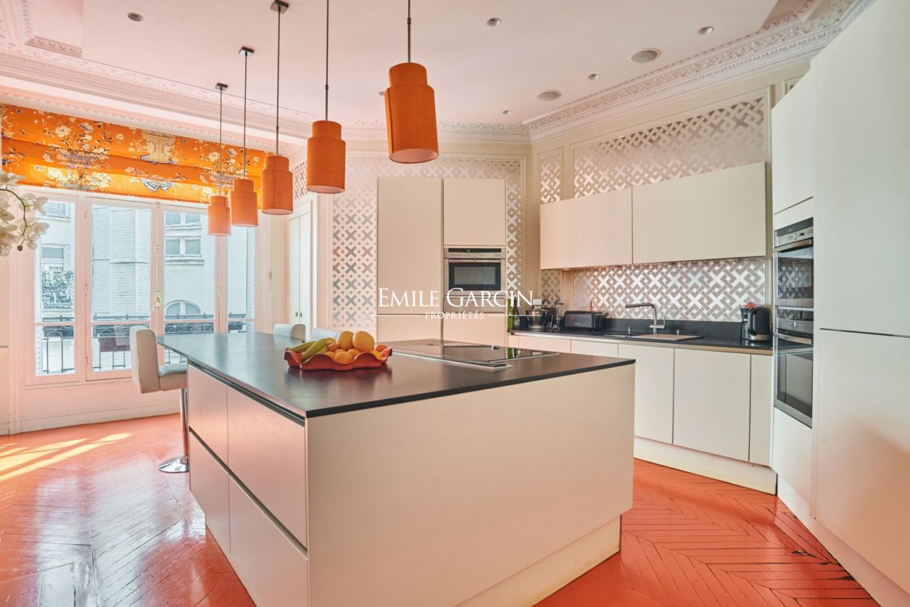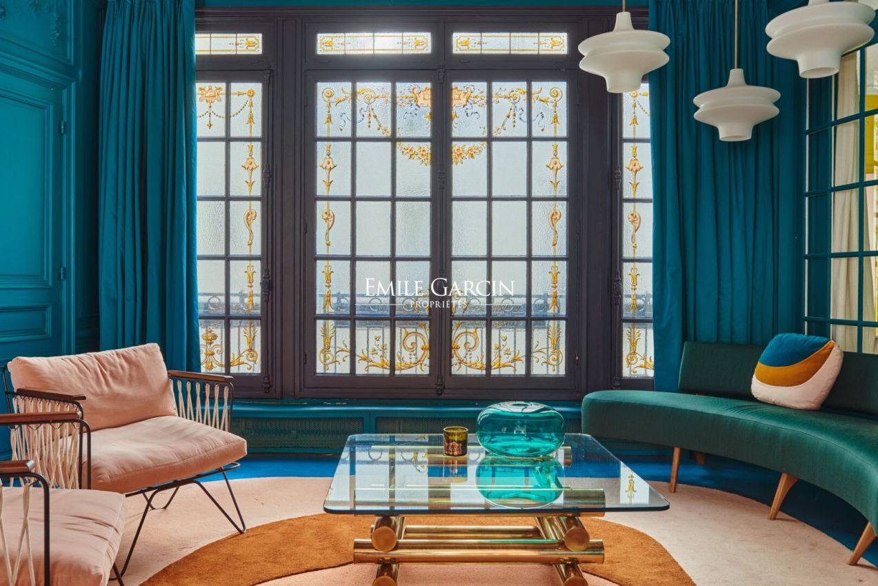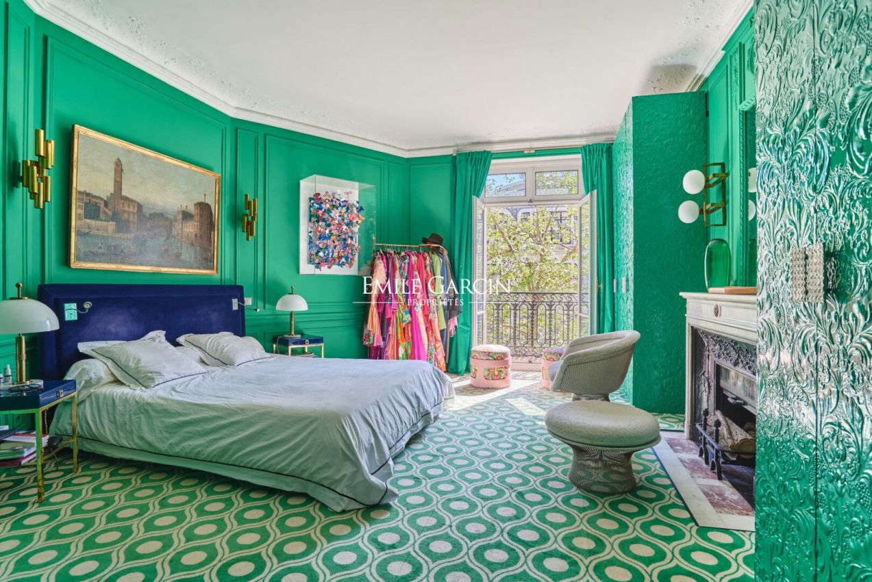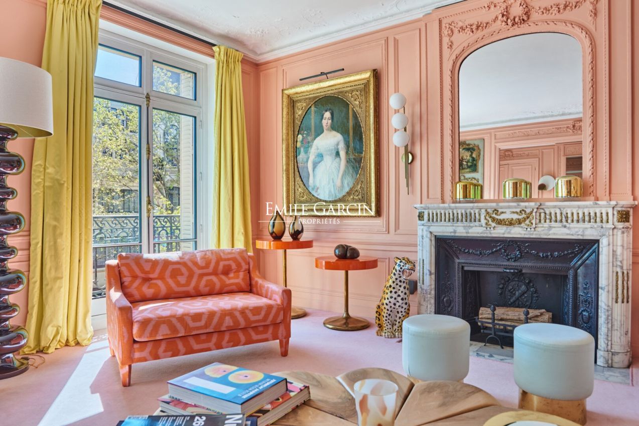 Au troisième étage avec ascenseur d'un remarquable immeuble en pierre de taille de l'avenue Niel, cet appartement de 275,03 m² déploie une élégance singulière, portée par une identité forte et assumée.