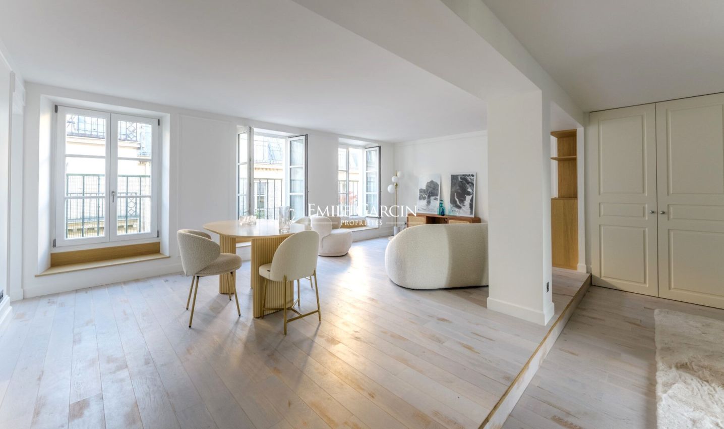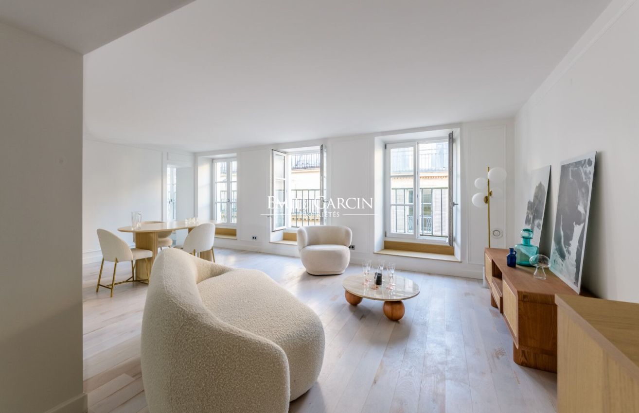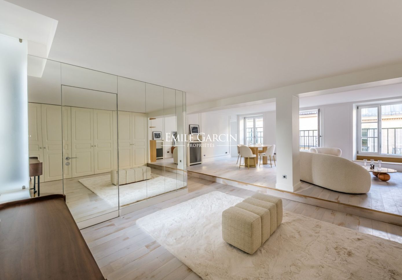 Paris 1er - Jardin des Tuileries - Au 5ème étage desservie par deux ascenseurs d'un très bel immeuble construit en 1840, aux parties communes étonnantes, luxueux appartement d'environ 73 m² entièrement refait à neuf avec des matériaux de qualité et exposé Ouest, en fait un pied-à-terre idéal. Il se compose d'une grande pièce de séjour avec 3 fenêtres sur balcon, une cuisine aménagée et équipée, une chambre, une salle d'eau et toilettes séparés. Il bénéficie de nombreux rangements et d'une très belle luminosité. Une cave complète ce bien. Conciergerie.