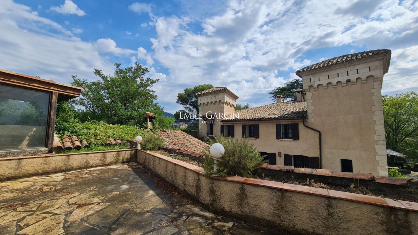 Du temps de la première croisade, la tour carrée guérite et la tour-vigie de ce lieu étaient des verrous de la cité qu'elles défendaient. Aujourd'hui ce château rénové, à vendre, marque l'entrée ouest de cette ville de Haute Provence et est devenu au fil des ans une demeure de caractère offrant les charmes de son parc paysager et invitant au repos au bord de sa piscine couverte. Si cette propriété vous laisse encore une très forte constructibilité, elle déploie déjà ses trois niveaux organisés en deux appartements séparés ou bien pourra former une demeure rassemblée de plus de 600 m² sur un terrain de plus de 8 000 m². L'authenticité de son histoire singulière vous est offerte à un battement d'aile du coeur de ville. A voir absolument !