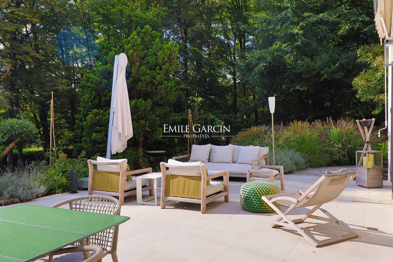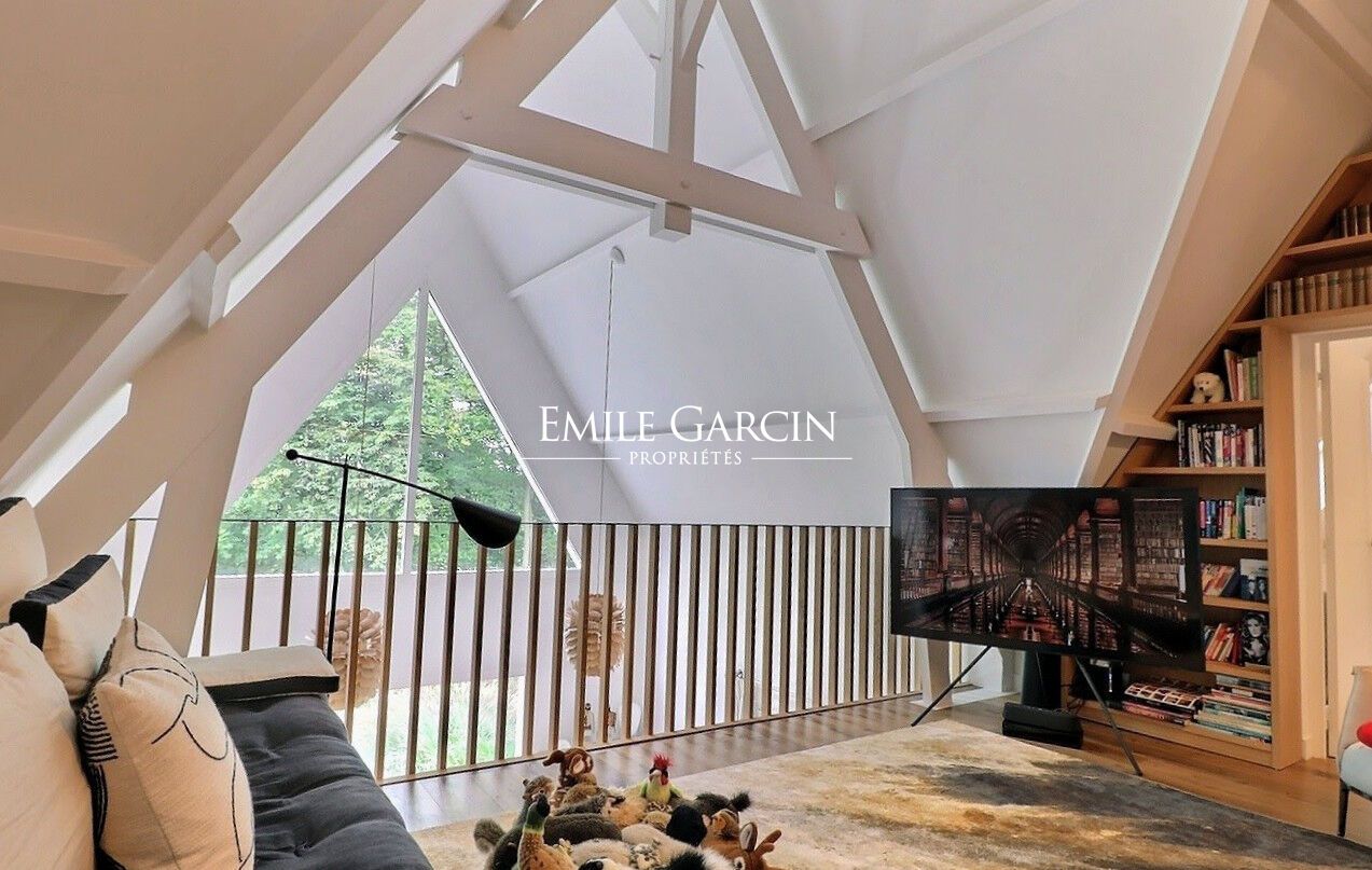 A 40 minutes de Paris par l'A13 , l'A14 ou l'A15, à 25 minutes de Giverny ou La Roche Guyon, dans un magnifique domaine privé et sécurisé, au coeur de la forêt , donnant sur un golf réputé comprenant également piscine et tennis, se niche cette maison d'architecte en excellent état à l'abri de toutes nuisances. D'une superficie de 355m2 loi Carrez et 450m2 au sol, la maison comprend de très beaux espaces de réception, une bibliothèque en mezzanine, 4 chambres dont deux avec salle d'eau avec douche et WC et une suite parentale.