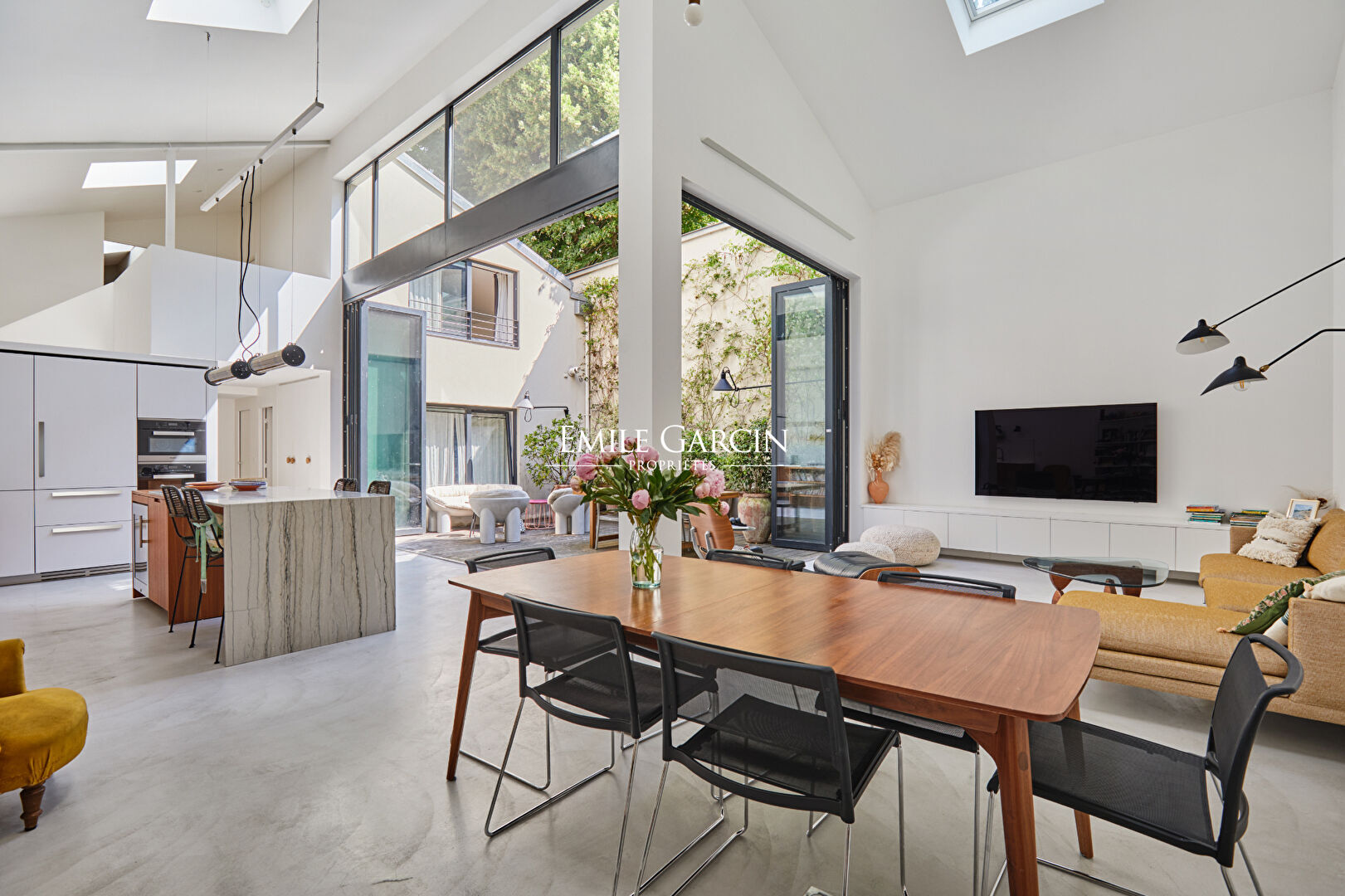 Exclusivité, emplacement très prisé, au calme absolu, baigné dans la lumière, au sein d'un bel immeuble haussmannien, dans une cour privative, maison neuve avec un jardin terrasse de 27m². Cette maison faite par des architectes au charme design d'une maison loft à Paris, d'environ 170m² sur deux niveaux comprenant une entrée avec des rangements, un grand double séjour (73m²) avec une hauteur cathédrale avec cuisine ouverte équipée et aménagée (marque Boffi), une chambre avec dressing et salle d'eau et toilettes. L'ensemble donne sur une terrasse jardin à l'abri des regards, une deuxième chambre (ou bureau) avec salle d'eau et toilettes (sur cour privative) des toilettes invités. Accessible par un escalier confortable, à l'étage, une galerie ouverte (petit salon ou bureau) sur séjour/salle à manger, une suite parentale , un dressing et salle de bain / douche et des toilettes, une quatrième chambre invités avec salle d'eau et toilettes. Rare.