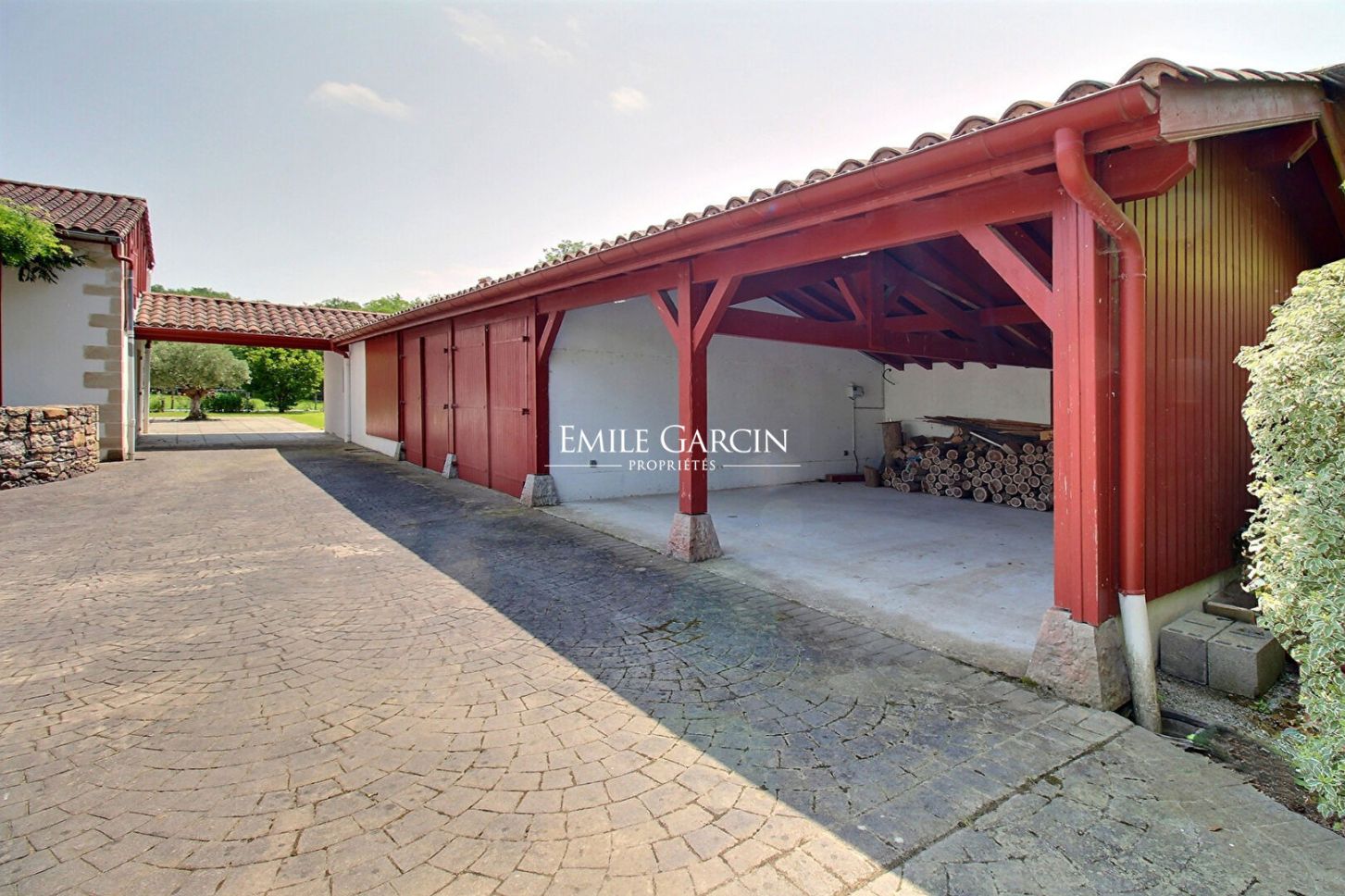 L'extérieur prolonge naturellement les espaces de vie. Les dépendances comprennent une ancienne grange réaménagée en espaces de rangement, garages fermés et stationnements abrités.