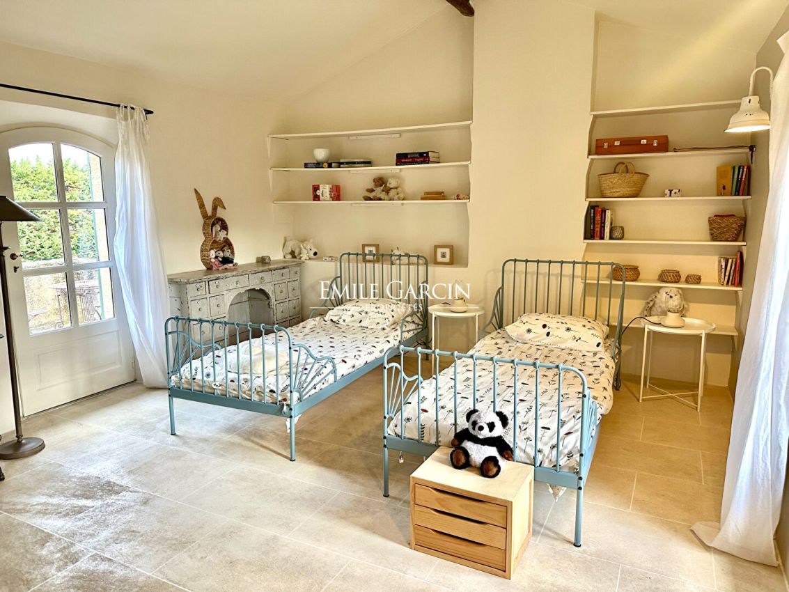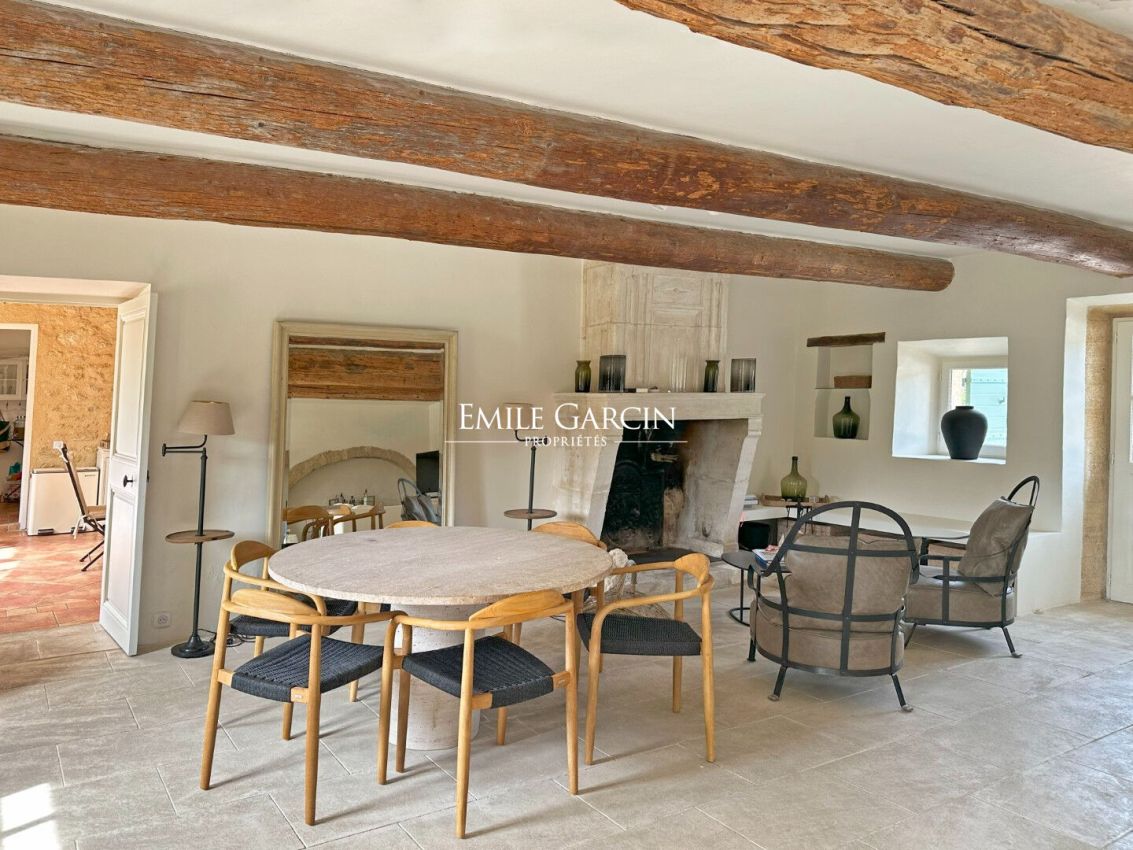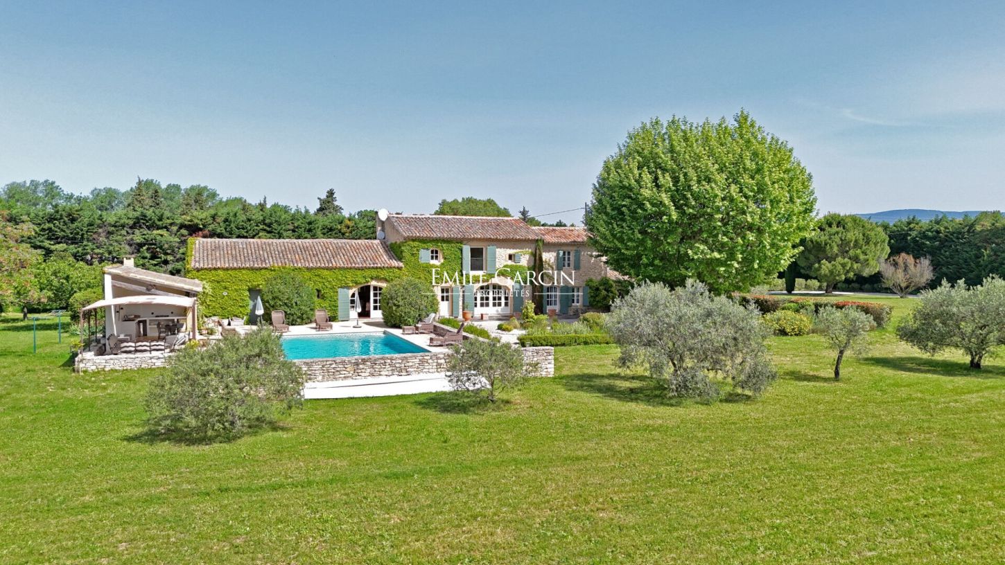 Très belle restauration pour ce mas de la fin du XIXe siècle, niché dans un écrin de verdure. A proximité d'un village avec commerces et services, il bénéficie d'un emplacement idéal pour ceux qui souhaitent profiter du calme sans être isolés, avec en prime une vue dégagée sur les premiers contreforts du Luberon. Résolument pensé pour une résidence principale, le mas s'organise comme suit : au rez-de-chaussée, une vaste pièce de vie avec salon, salle à manger et cheminée, une belle cuisine indépendante, ainsi qu'une chambres en suite. Toutes ces pièces s'ouvrent au Sud sur une belle esplanade ombragée par un platane séculaire. Depuis la cuisine, un accès intérieur mène directement au double garage. A l'étage, trois chambres, dont deux en suite, WC séparés, et une terrasse orientée à l'est, idéale pour savourer les petits-déjeuners ensoleillés. Un bel espace détente avec une grande piscine bordée de murets , un pool house -cuisine d'été et un salon sous pergola.
