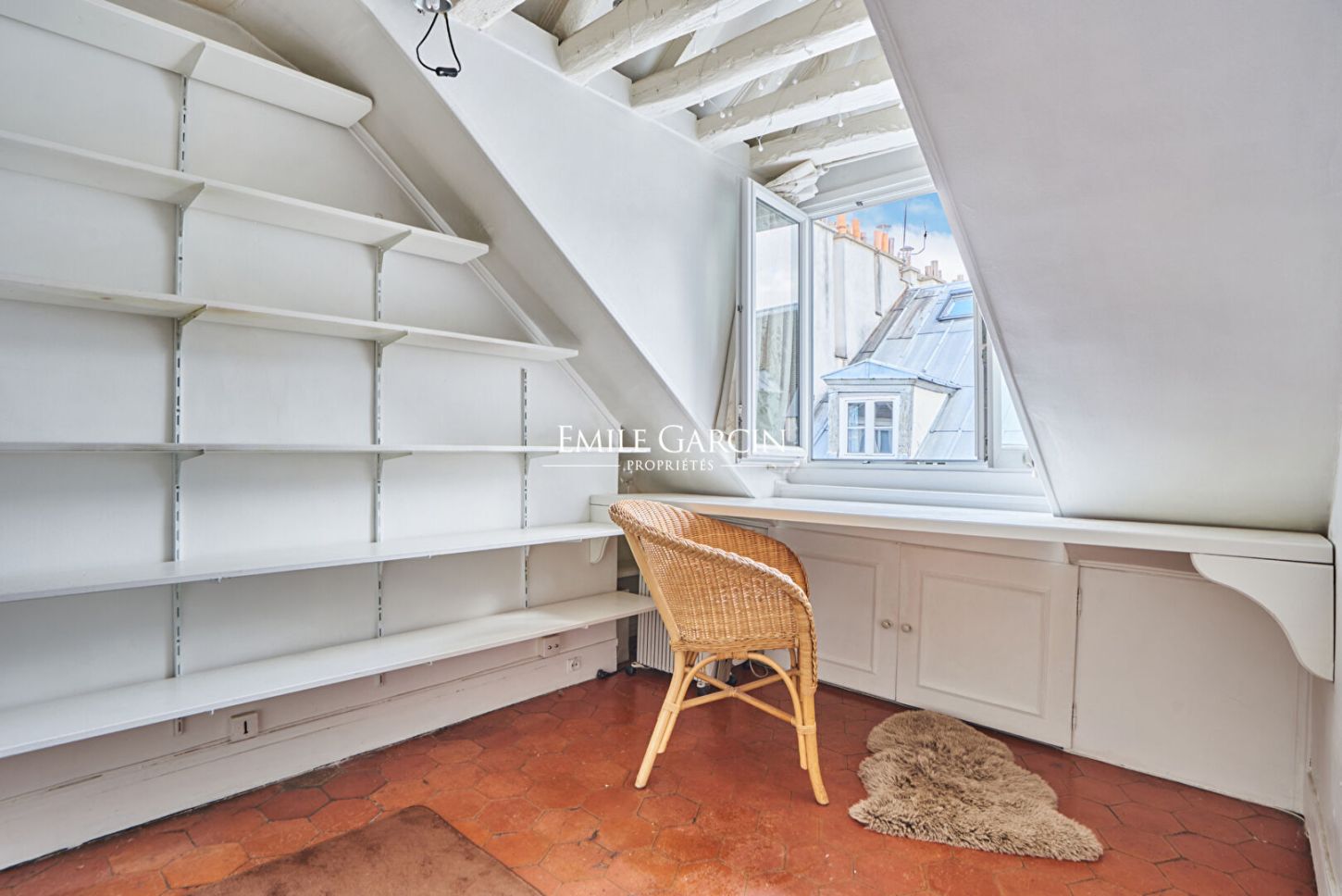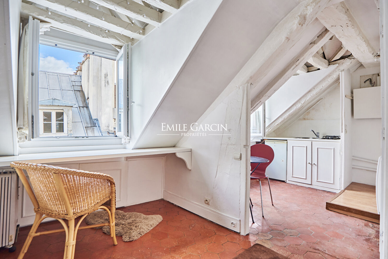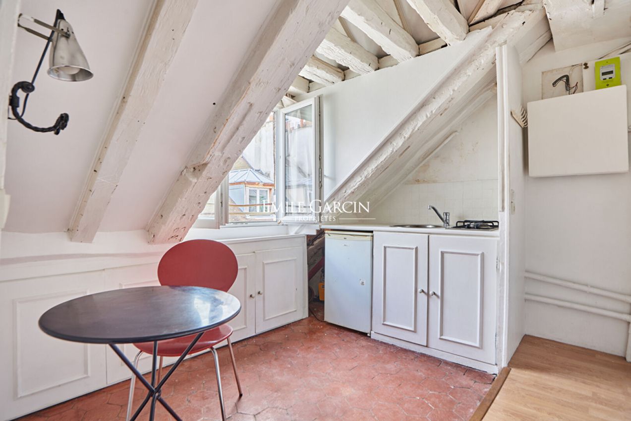 A deux pas de la célèbre Place des Vosges, niché au sixième étage sans ascenseur d'un immeuble ancien ce studio de charme de 19 m² au sol (14,38m² loi Carrez) se compose d'une pièce principale, cuisine séparée, rangements, salle d'eau avec WC et local vélos. Ses poutres d'époque préservées, ses tomettes et ses deux fenêtres. Au calme. Commerces et transports à deux pas. Un parfait pied-à-terre authentique ou investissement en plein centre de Paris.