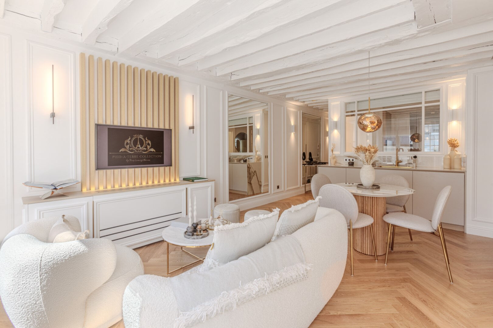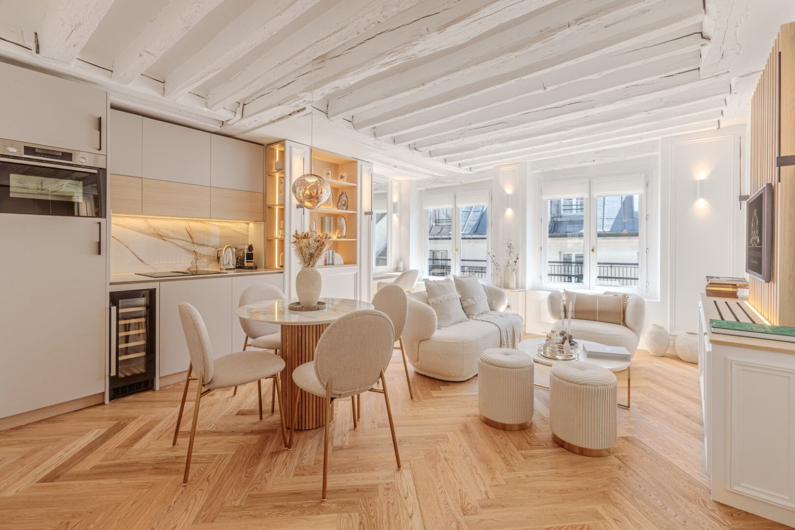 Louvre - Rue Saint-Honoré - Sublime appartement de 2 pièces, au 5e étage avec ascenseur d'un authentique immeuble parisien avec vue dégagée. Cet appartement de 44,50 m² loi Carrez, véritable pied à terre de charme, a fait l'objet d'une rénovation de grande qualité. Il se compose d'une entrée, un salon-salle à manger avec cuisine ouverte, une chambre avec salle d'eau. Exposition sud. Parfait état avec un confort contemporain tout en conservant le charme de l'ancien. Appartement vendu meublé.
