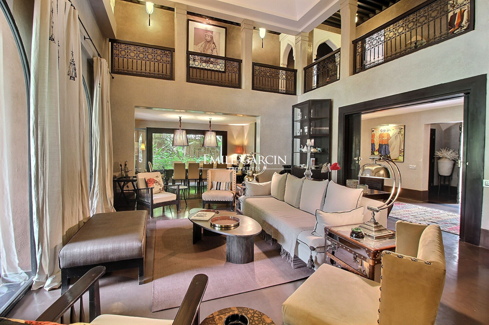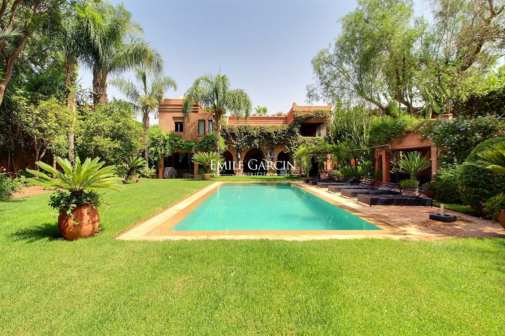 Très belle propriété située à quelques minutes du centre-ville et de la médina. Sur l'un des plus prestigieux golfs de Marrakech, cette maison de 800 m² est édifiée sur un parc magnifiquement arboré de 1600 m².