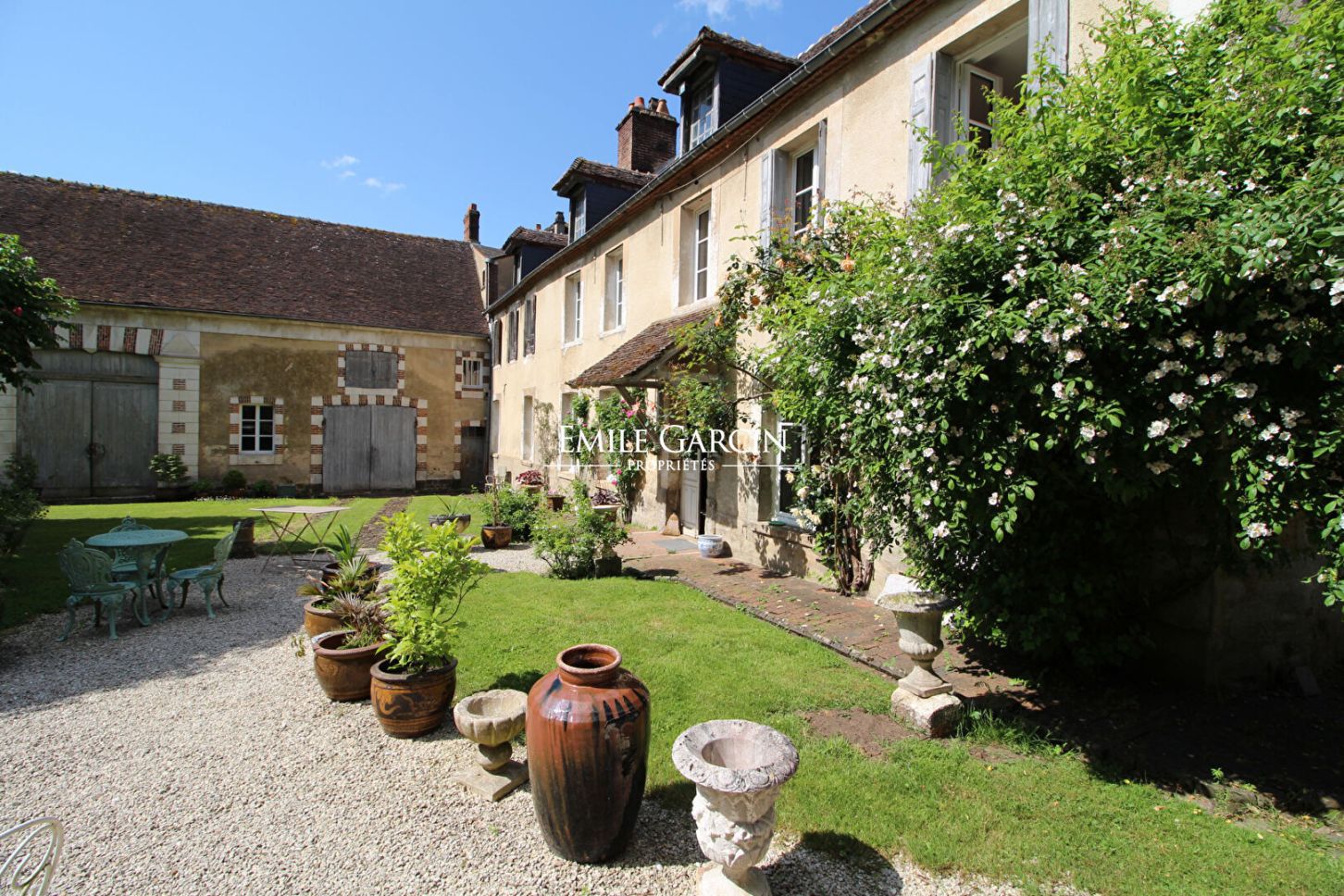 Un large portail s'ouvre sur une cour d'honneur, arborée et paysager avec une grange, d'anciennes écuries, un auvent, un salon d'été et une petite maison d'amis restant avec encore de belles possibilités, chambres supplémentaires ou espaces de réception.