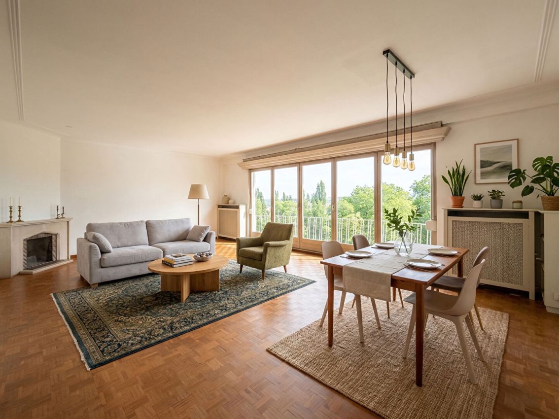 Appartement de deux chambres d'environ 140m² ( selon PEB). Il bénéficie d'une très belle vue sur un îlot verdoyant avec deux terrasses Est-Ouest. Hall d'entrée avec toilette visiteurs, spacieuses réceptions salon et salle-à-manger avec un accès vers une terrasse avant plein Est, cuisine équipée d'époque avec accès vers une terrasse arrière plein Ouest , deux chambres avec terrasses, une toilette séparée, une salle de bain séparée et un espace buanderie-rangements. L'appartement doit être rénové afin de le remettre au goût du jour et lui donner un nouveau programme de vie. Une cave et une chambre de service d'environ 20m² complètent le bien.