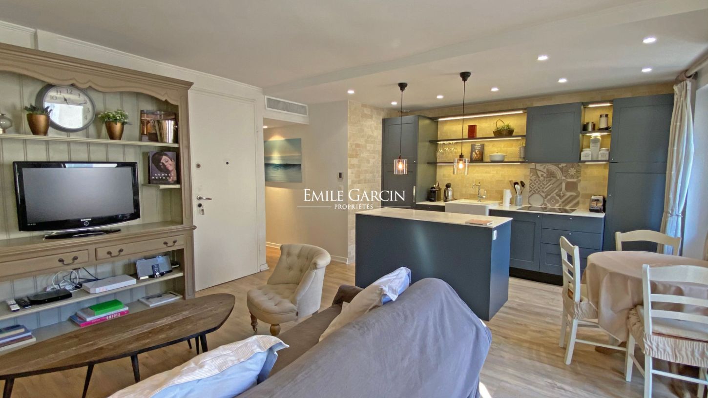 Belle cuisine ouverte sur le salon, accès direct au balcon agrémenté d'une petite table de brasserie le tout donnant sur la rue avec aperçu mer. Ascenseur privé. Ideal pour congrès (MIPIM, Film Festival, MIPCOM, LIONS etc...).