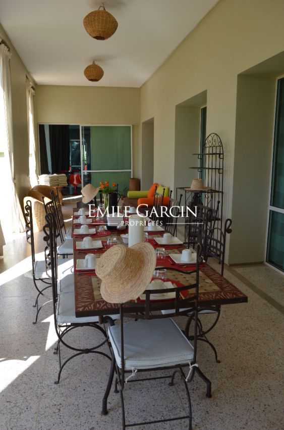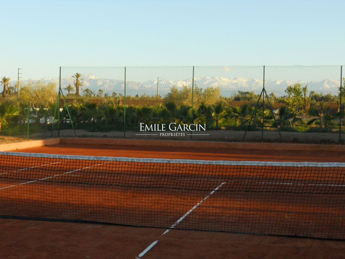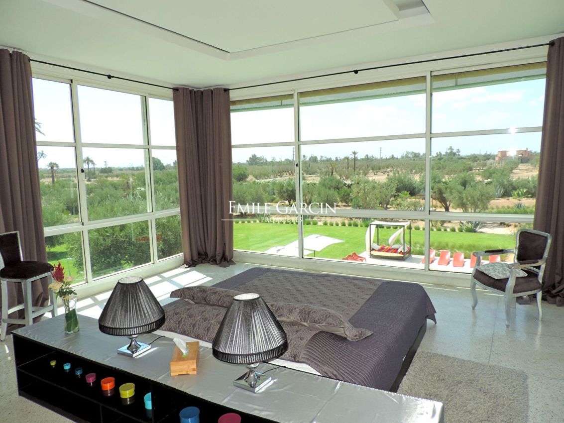 Magnifique propriété de 800m² sur un parc arboré d'un hectare dans la Palmeraie de Marrakech à Bab Atlas. Jolie vue sur l'Atlas. Le design de la maison est minimaliste, le patio intérieur et les baies vitrées créent une transition entre les volumes baignés de lumière et l'extérieur. Vaste réception, séjour avec cheminée, salle à manger, bibliothèque.