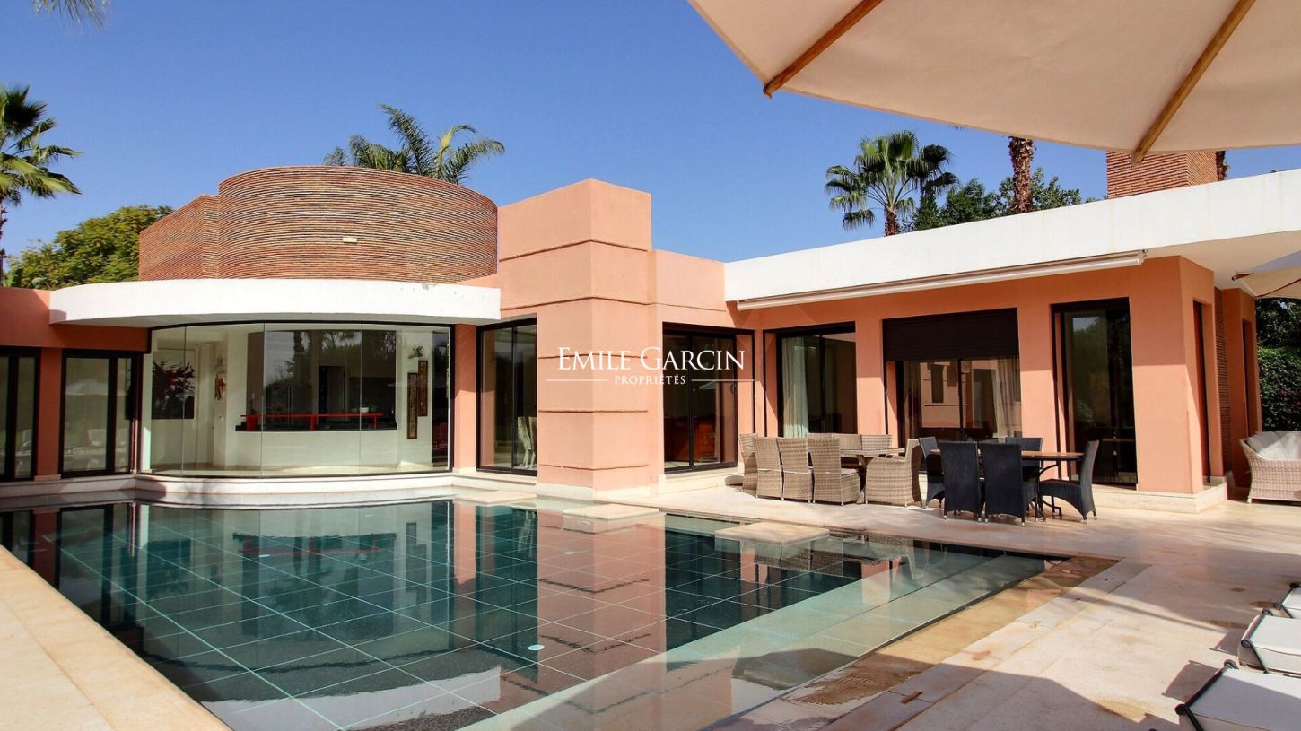 Dans un domaine privé, route de l'Ourika, belle propriété de 340 m² sur un parc paysagé de 4500m². Double salon avec cheminée, salle à manger avec vue sur le jardin et la piscine, salon de jardin.