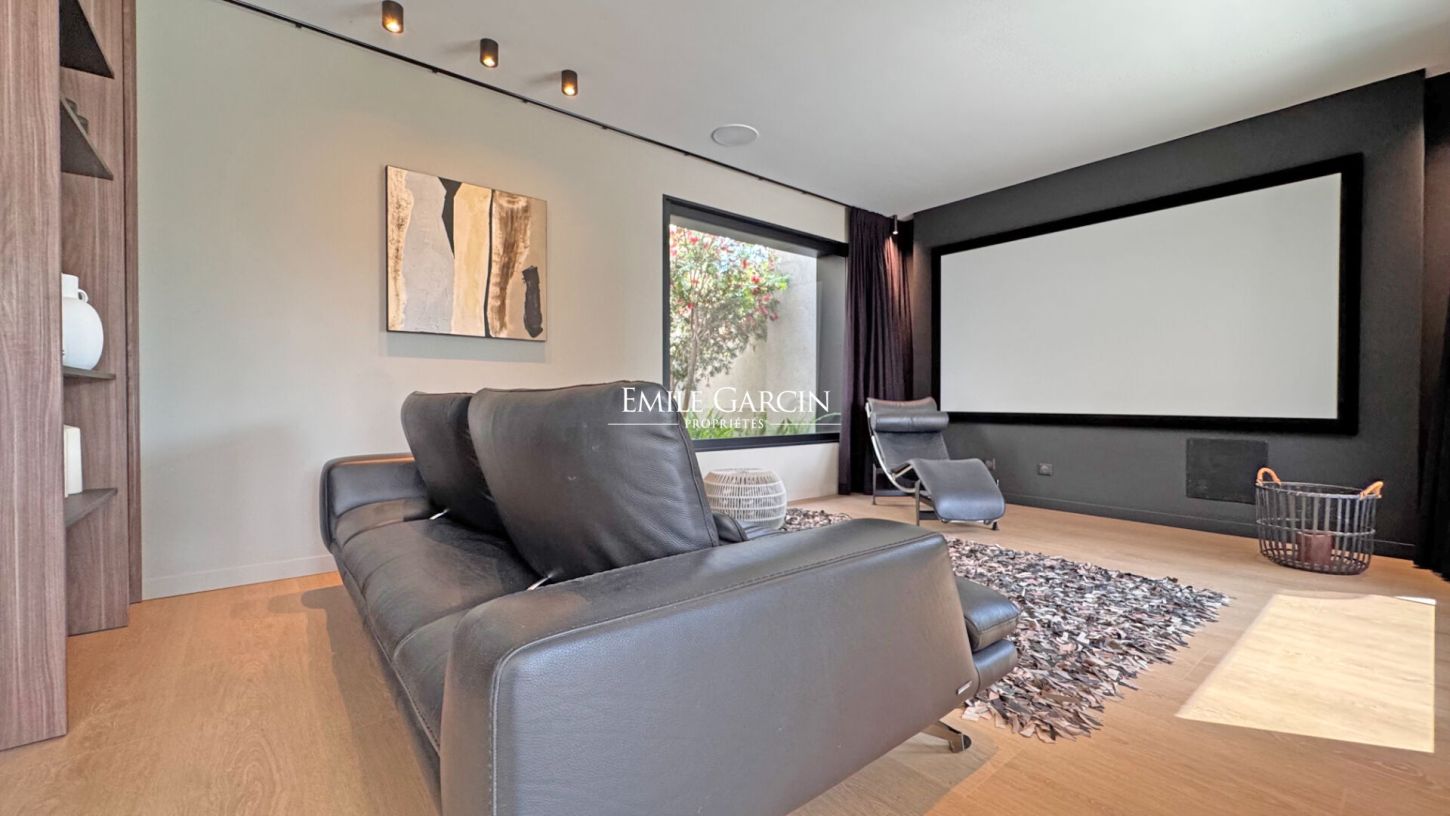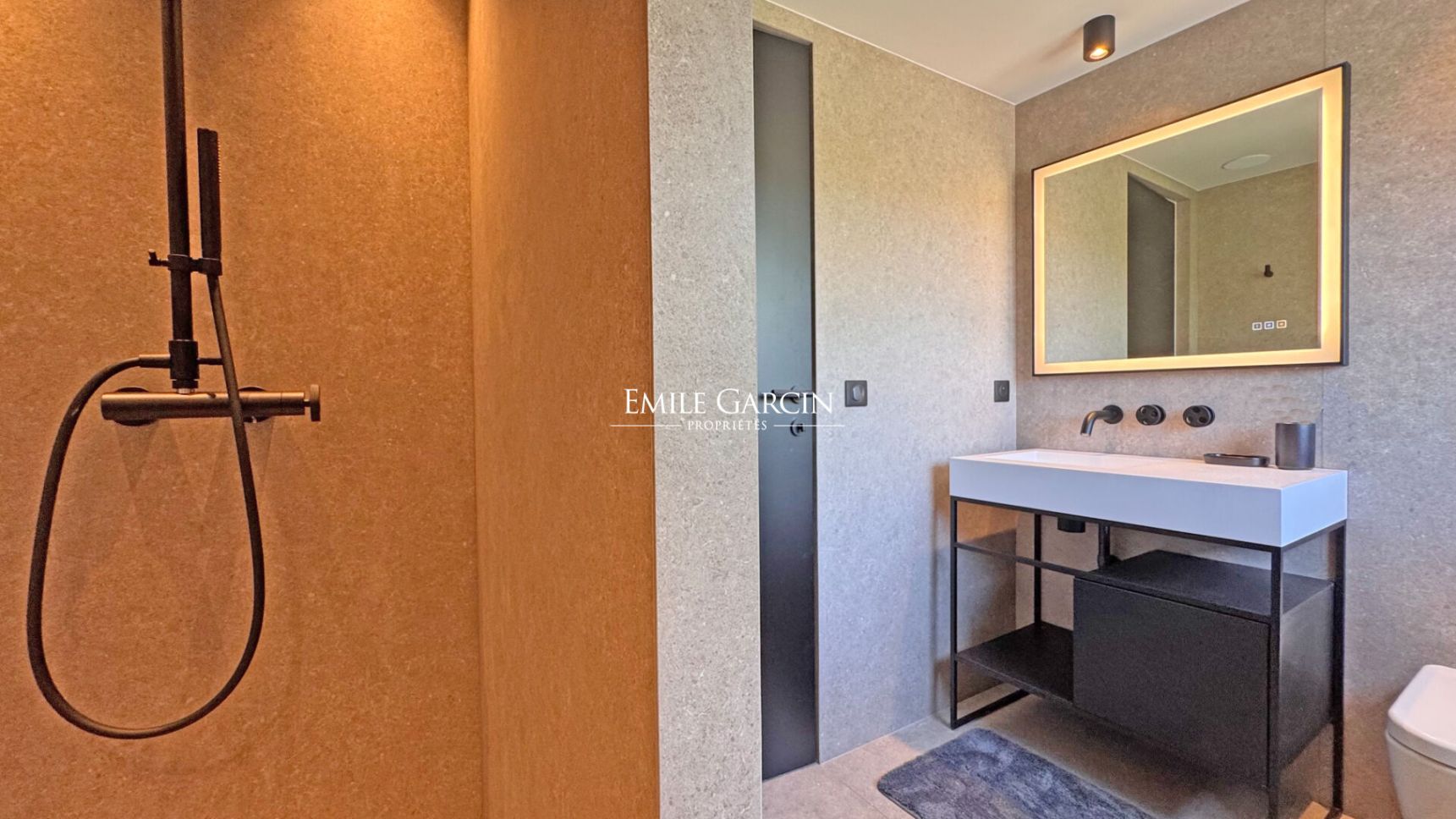 D'une surface généreuse, elle dispose de 5 chambres doubles, toutes avec salles de bain en suite, climatisation réversible, et des finitions haut de gamme. Le vaste salon s'articule autour d'un espace home cinéma, d'un coin détente et d'une cuisine américaine ouverte avec grande table à manger.