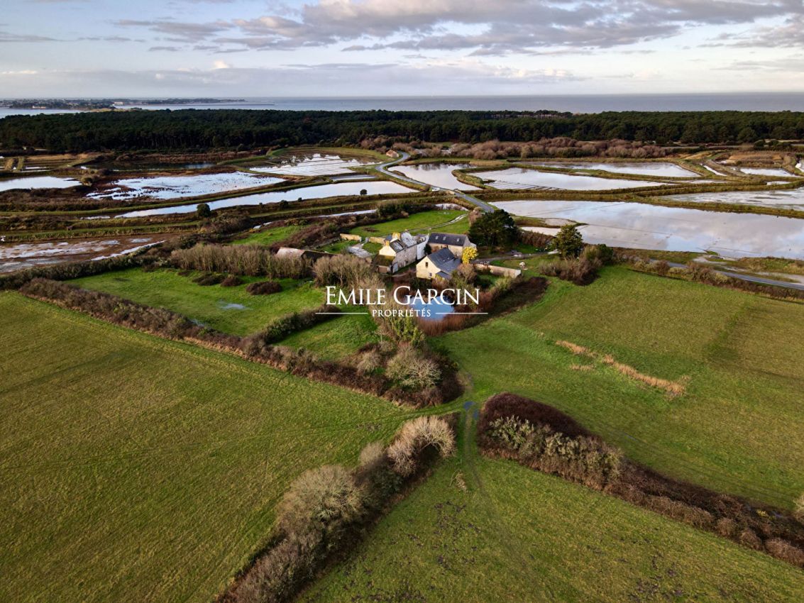 La propriété de 37 hectares est en plein coeur des marais salants inscrit au patrimoine mondial de l' Unesco, inventoriée Natura 2000 . L'intérêt biologique et paysager de la Presqu'île Guérandaise est reconnu dans le monde. La propriété est composé de 35 hectares d'un seul tenant exploités en foin biologique Ecocert et de 2 hectares environ où sont situés les différents bâtiments comprenant : - Une maison principale d' environ 300 m² - Un commun comprenant 3 gîtes. - Une ferme. - Un gîte attenant au logis - Un hangar ouvert de 230 m² au sol. - 10 boxes.