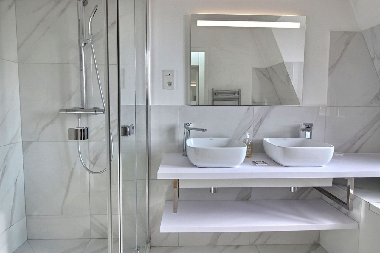 Proche de la Cour Albert 1er et de la Seine, bel appartement de 100 m² (83 m² loi Carrez) au 5ème et dernier étage d'un très bel immeuble de standing en pierre de taille. Il se compose comme suit: entrée avec vestiaire et toilettes, salon/salle à manger avec cuisine ouverte, une première chambre avec salle de bains, douche et toilette. une deuxième chambre avec salle de douche. Prestations et matériaux de qualité.